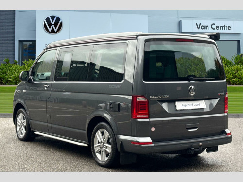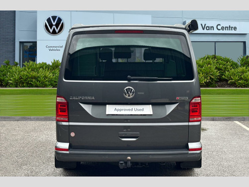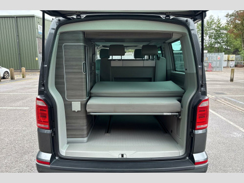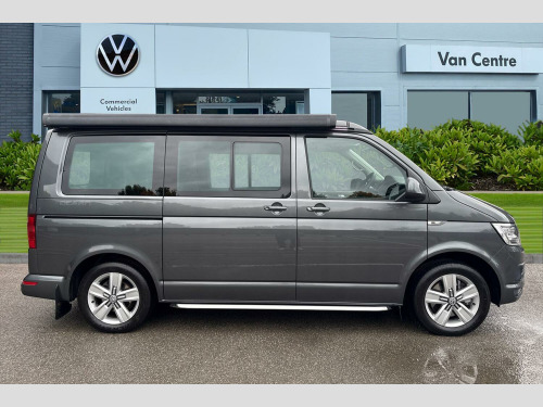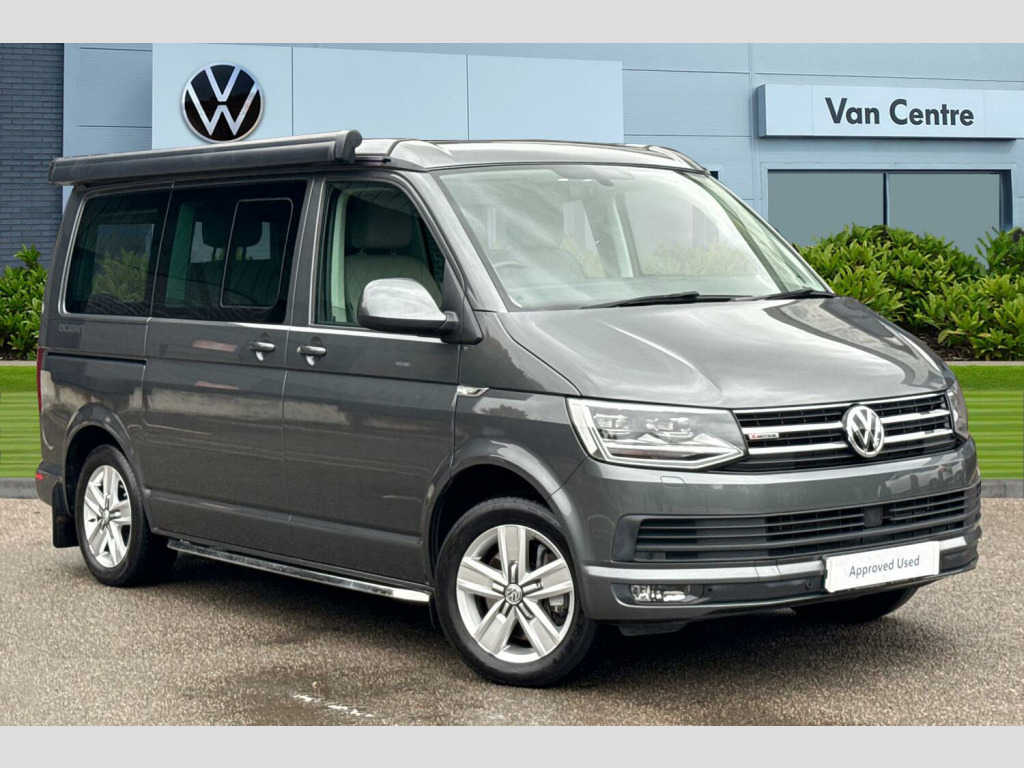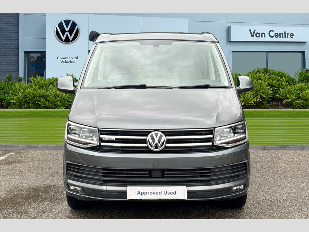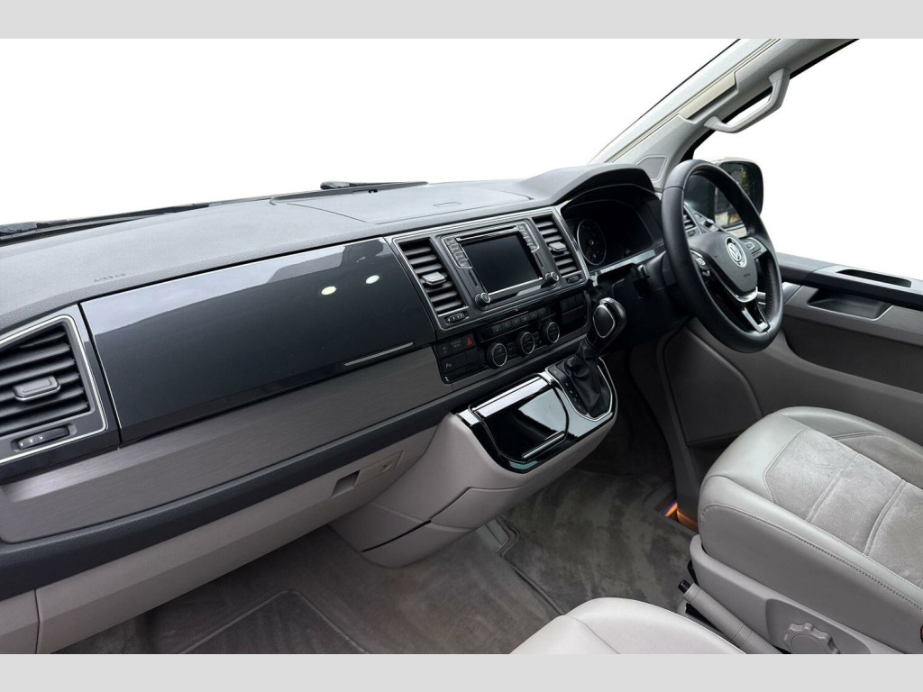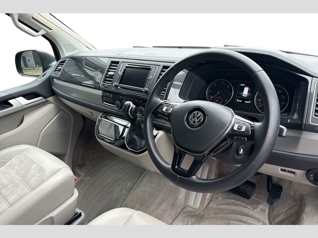 Privacy glass with heat insulation, Awning housing and rail in black, Front and rear mud flaps, Metallic paint, LED headlights with LED daytime running lights and tailgate with red LED tail lights, Front assist with city emergency braking without adaptive cruise control (ACC), Adaptive cruise control including front assist and city emergency braking (Max speed 99mph), Front and rear parking sensors with rear view camera, AppConnect, Discover media navigation system plus -2 USB interfaces (iPod/iPhone), AUX-IN jack, digital voice enhancement (DVE), voice, media control + AppConnect, Kitchen cupboard, wardrobe and drop down compartment in dark wood effect trim with outdoor shower connection, Bed extension with comfort sleeping mat, 4 remote control folding keys, Metallic - Indium grey, Front passenger side sliding window with fly screen in passenger compartment, Glazed tailgate, Insulating glass in rear window with wash/wipe, Intermittent windscreen wipers, Standard suspension and shock absorbers, Body colour bumpers, Body colour painted aluminium electrically operated pop-up roof with two side windows and one front window in bellows, Power latching for driver side sliding door, Roof rails, Automatic coming home lighting, Range adjustable headlights, ABS/EBD, Brake assist function, EDL, ESP, Hill hold control, Power steering (steering wheel adjustable in height and reach), Electrically adjustable, heated and folding wing mirrors, 3x3 point rear seatbelts, Child proof door locks, Door open warning, Driver seatbelt warning indicator, Driver/Front Passenger airbags, Driver/front passenger seatbelt tensioners, Front side airbags with curtain airbags, Passenger airbag deactivation system, Two tone horn, Tyre pressure warning, Warning triangle and first aid kit, Bluetooth handsfree set, 8 Speakers, Auxiliary input socket, Lockable tailgate, Power latching for tailgate, Digital clock, External temperature gauge, Rev counter, Service interval indicator, Trip computer, 180A alternator, 2x Auxiliary rechargable batteries, Brushed dark silver decorative inserts in dash in anthracite metallic, Armrest for driver and single front passenger seats, Driver + passenger lumbar support, Driver/front passenger seat height adjustment, Front seat backrest storage nets, Head restraints for all seats, Heated driver and front passenger seats, ISOFIX top tethers and lower anchor points, Preparation for separate seat in passenger compartment, Swivelling front seats, Climatronic 3 zone air conditioning with 2nd evaporator, auxiliary heater, air conditioned headliner and additional passenger control, Dust/pollen filters, Independent rear heating controls, Programmable parking heater, air with radio remote control and auxiliary heater (coolant), 230V socket, Camping table with two folding chairs, Front grab handles, Interior illuminated entry steps, Jack and tool kit, Storage net on lower dash passenger side, Adjustable dashboard illumination, Interior light concept for camper with comfort in passenger compartment, Sunvisors with illuminated vanity mirrors, Comfort dashboard pack - California, Lights and vision pack - California, Smokers pack - California, Anti theft alarm system with interior monitoring in cab, backup horn and towing protection, Electronic immobiliser, Locking wheel nuts, Remote control central locking system with safelock and interior release