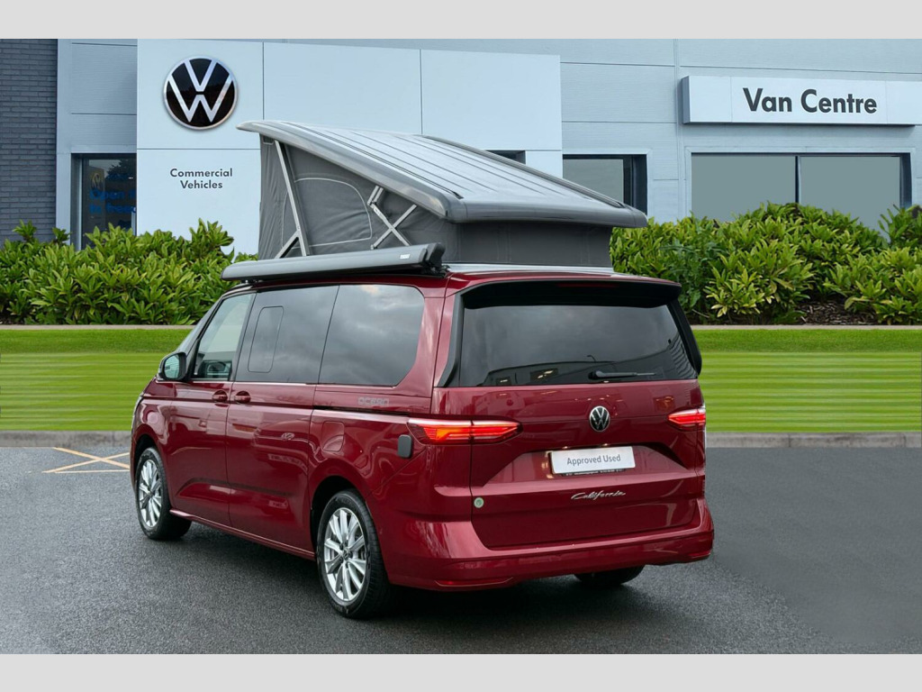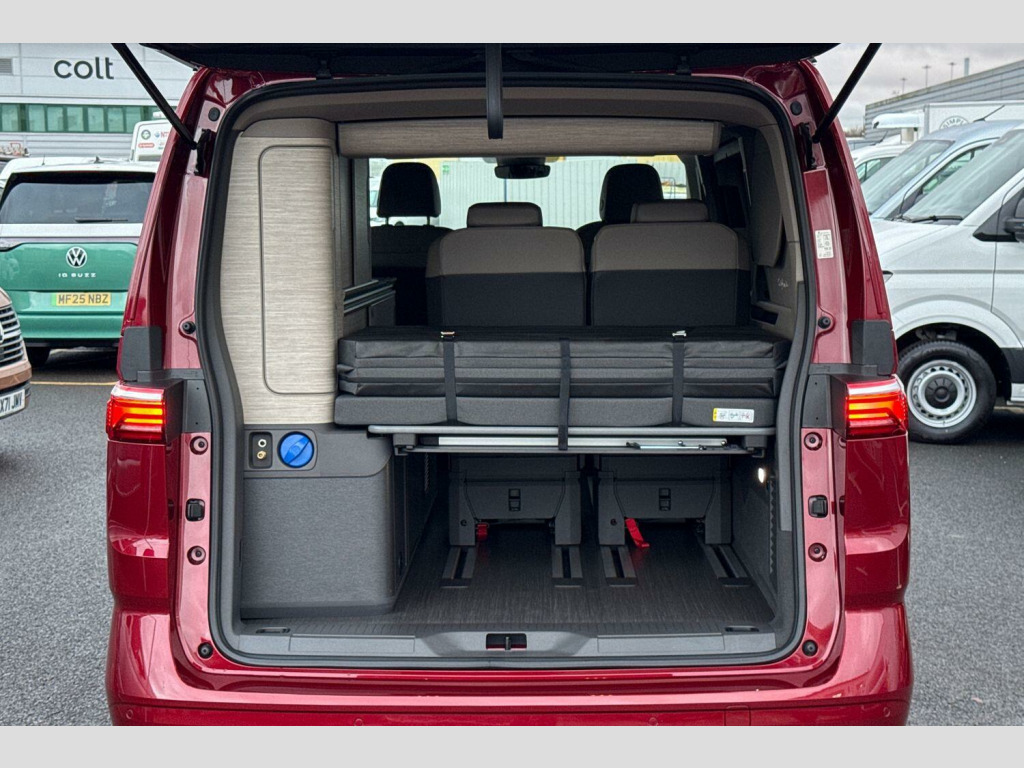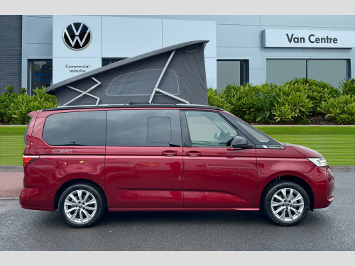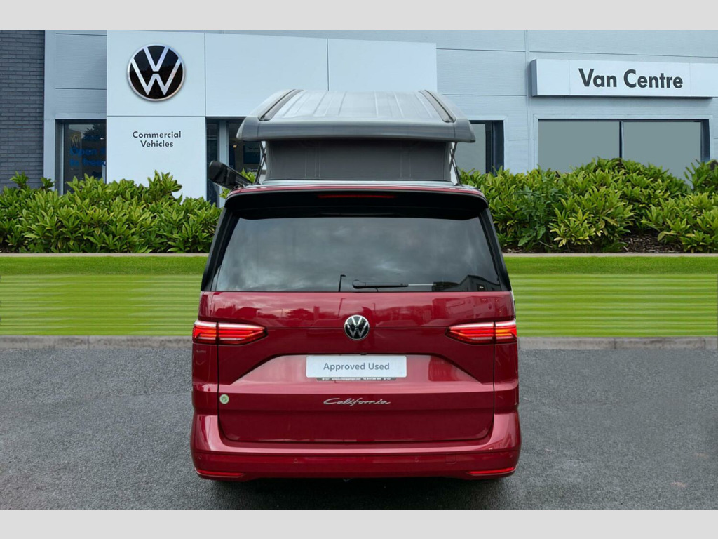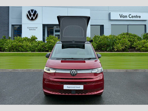 Volkswagen California 2.0 TDI Ocean 5dr DSG Fortana Red Metallic paint with Deep Black Roof, Retractable towbar with electric release, 360° cameras, IQ Matrix LED headlamps, Melange bi-color cloth upholstery, Camper parking heater for continuous operation, Advanced parking pack - California, 18" Toshima silver alloy wheels, Metallic - Fortana Red with Deep Black pearl roof, Retractable towbar with electric release, Melange bi-color cloth - Raven Black/Sand, 5 Years Warranty, 5 Years Roadside Assistance, 5 Services, 3 MOT's, (From Date Of Registration), 65% light absorbing privacy glass, Four speed control for windscreen wipers, Heat and sound insulating laminated safety glass windshield, Heated windscreen, Sliding window in front with fly screen in passenger compartment left/right & fixed window in rear in load passenger compartment at left, Windscreen wiper intermittent control, Standard suspension and shock absorption, Electro hydraulic elevating roof, with three windows including one front passengers panorama opening, canvas in Basalt Grey, Nameplate set California, Rear boot, 3rd brake light, Dynamic Light Assist for LED matrix headlights, Illuminated molding between headlamps, Poor weather light including cornering light, Red LED tail lights, Autonomous emergency braking front assist with pedestrian and cyclist monitoring, Front disc brakes, Swerve support and oncoming vehicle braking when turning, Advanced driver attention and drowsiness monitor, Driving profile selection, Lane keeping system Lane Assist, Multifunction camera, PAS, Traffic sign recognition, Turn assist with evasive assistance, High gloss black door mirrors, 2x3 point automatic seatbelts at the rear outside with ECE label, with/without belt tensioner, Child locks, Driver and front passenger airbags with front passenger airbag deactivation button, First aid kit with warning triangle and safety vest, Front Assist with pedestrian and cyclist detection, Height adjustable three point automatic seatbelts at front with belt and end fitting tensioners, Side and curtain airbags for driver and front passenger, curtain airbags for outer seats in rear, centre airbag in front, Tyre pressure loss indicator, California on tour app, Mobile phone interface, Preparation for online services, Volkswagen wired and wireless app connect, 2 USB-C ports at the front, 4 USB-C charging sockets in the passenger compartment, 8 Speakers, Digital radio reception (DAB), eCall emergency system, Tailgate with window aperture and with power latching, Digital cockpit pro, Discover Pro Navigation system, Emergency assist, Function control unit, IDA voice assistant and voice enhancer, Additional batteries 2nd and 3rd with voltage transformer NV, Battery without capacity specification, Standard battery/generator, Dark silver brushed decorative inlays, 2 single seats with integrated seatbelt and sleeping mat, Armrest on front swivel seats in both sides with electric lumbar support, Front and rear headrests, Heated front seats, Single front passenger seat, Swivel seat on left with height adjustable including drawer, Swivel seat on right with height adjustable including drawer, Camper parking heater for continuous operation & parking heater for windshield defrosting with radio remote control, 230V external inlet with charging feature for vehicle batteries, 230V inverter with socket on driver seat, Additional interior noise attenuation plus, Darkening roller blinds and thermo mats, Drawers under the outer seats in the cab and passenger compartment & 2 waste bins, Heated steering wheel, Kitchen with outdoor folding table for cooking and roof storage box in dTcor 2, Lockable glove compartment with lighting, Multifunction leather steering wheel with paddle shifters, Plastic floor covering in passenger/load compartment, Surround lighting in door area, Ambient interior lighting, Advanced assistance pack - California, Top package - California, Anti theft alarm system with interior monitoring in cab, backup horn and towing protection, Central lo