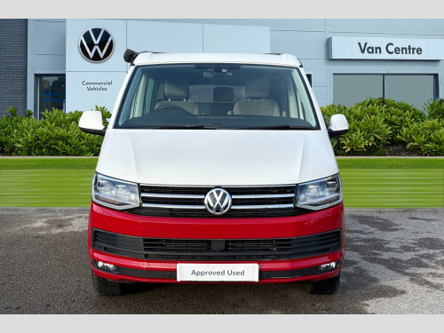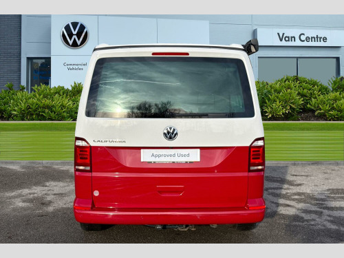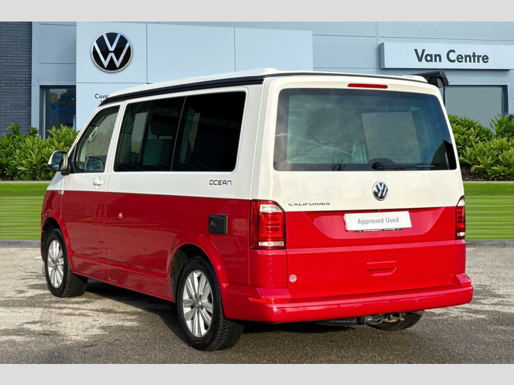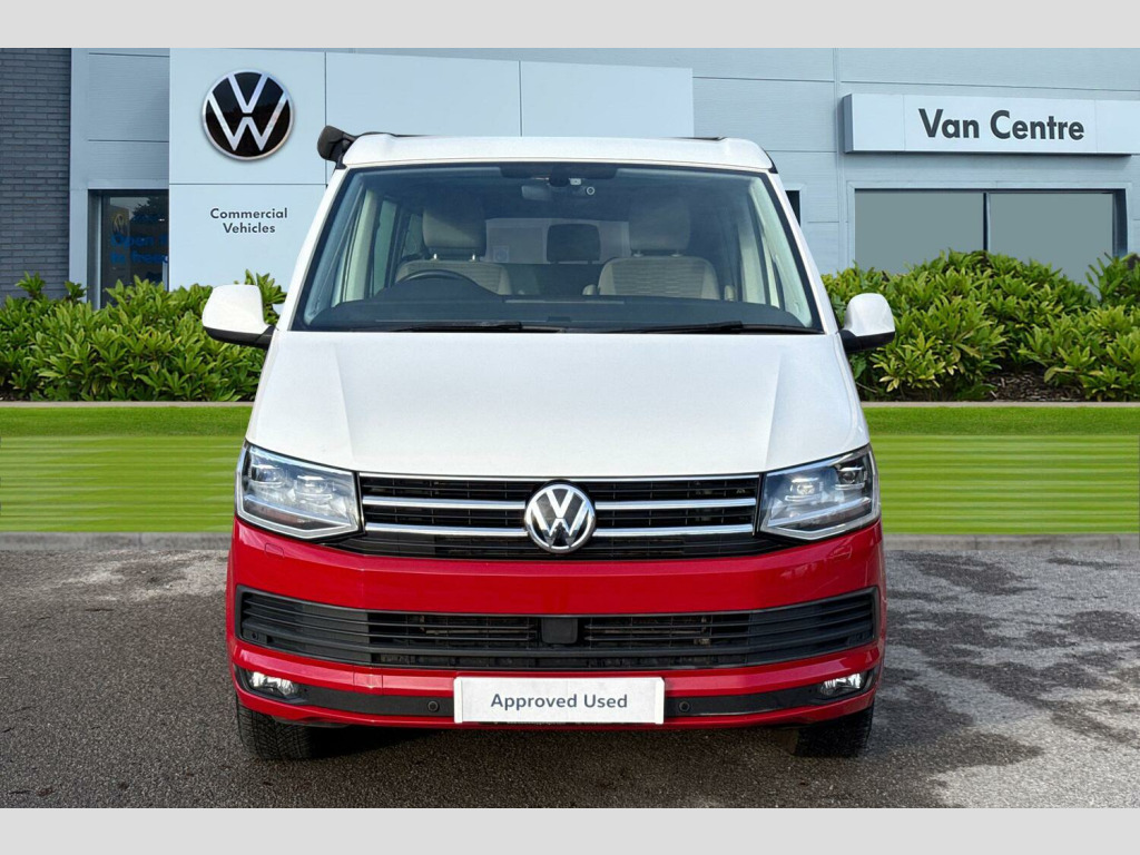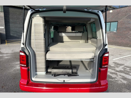 Heated front windscreen, Privacy glass with heat insulation, Awning housing and rail in black, Strawberry red roof bellows, Two tone paint, LED headlights with LED daytime running lights and tailgate with red LED tail lights, Cruise control, Front and rear parking sensors with rear view camera, AppConnect, Discover media navigation system plus -2 USB interfaces (iPod/iPhone), AUX-IN jack, digital voice enhancement (DVE), voice, media control + AppConnect, Bed extension with comfort sleeping mat, Solid - Candy white, Solid - Cherry red, 17" Cascavel anthracite alloy wheels, Front passenger side sliding window with fly screen in passenger compartment, Glazed tailgate, Insulating glass in rear window with wash/wipe, Intermittent windscreen wipers, Standard suspension and shock absorbers, Body colour bumpers, Body colour painted aluminium electrically operated pop-up roof with two side windows and one front window in bellows, Power latching for driver side sliding door, Roof rails, Range adjustable headlights, ABS/EBD, Brake assist function, EDL, ESP, Hill hold control, Power steering (steering wheel adjustable in height and reach), Electrically adjustable, heated and folding wing mirrors, 3x3 point rear seatbelts, Child proof door locks, Door open warning, Driver seatbelt warning indicator, Driver/Front Passenger airbags, Driver/front passenger seatbelt tensioners, Front side airbags with curtain airbags, Passenger airbag deactivation system, Two tone horn, Tyre pressure warning, Warning triangle and first aid kit, Bluetooth handsfree set, 8 Speakers, Auxiliary input socket, Lockable tailgate, Power latching for tailgate, Digital clock, External temperature gauge, Rev counter, Service interval indicator, Trip computer, 180A alternator, 2x Auxiliary rechargable batteries, Brushed dark silver decorative inserts in dash in anthracite metallic, Armrest for driver and single front passenger seats, Driver + passenger lumbar support, Driver/front passenger seat height adjustment, Front seat backrest storage nets, Head restraints for all seats, Heated driver and front passenger seats, ISOFIX top tethers and lower anchor points, Preparation for separate seat in passenger compartment, Swivelling front seats, Climatronic 3 zone air conditioning with 2nd evaporator, auxiliary heater, air conditioned headliner and additional passenger control, Dust/pollen filters, Independent rear heating controls, Programmable parking heater, air with radio remote control and auxiliary heater (coolant), 230V socket, Camping table with two folding chairs, Front grab handles, Interior illuminated entry steps, Jack and tool kit, Storage net on lower dash passenger side, Adjustable dashboard illumination, Interior light concept for camper with comfort in passenger compartment, Sunvisors with illuminated vanity mirrors, Comfort dashboard pack - California, Lights and vision pack - California, Smokers pack - California, Anti theft alarm system with interior monitoring in cab, backup horn and towing protection, Electronic immobiliser, Locking wheel nuts, Remote control central locking system with safelock and interior release