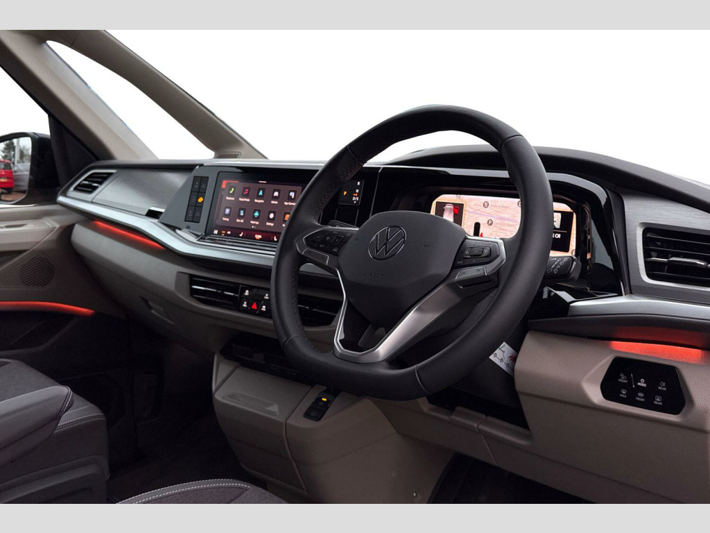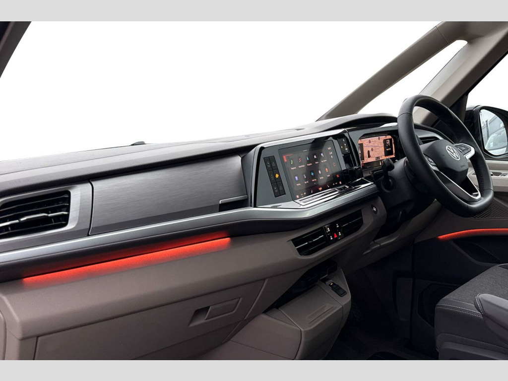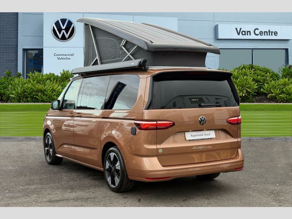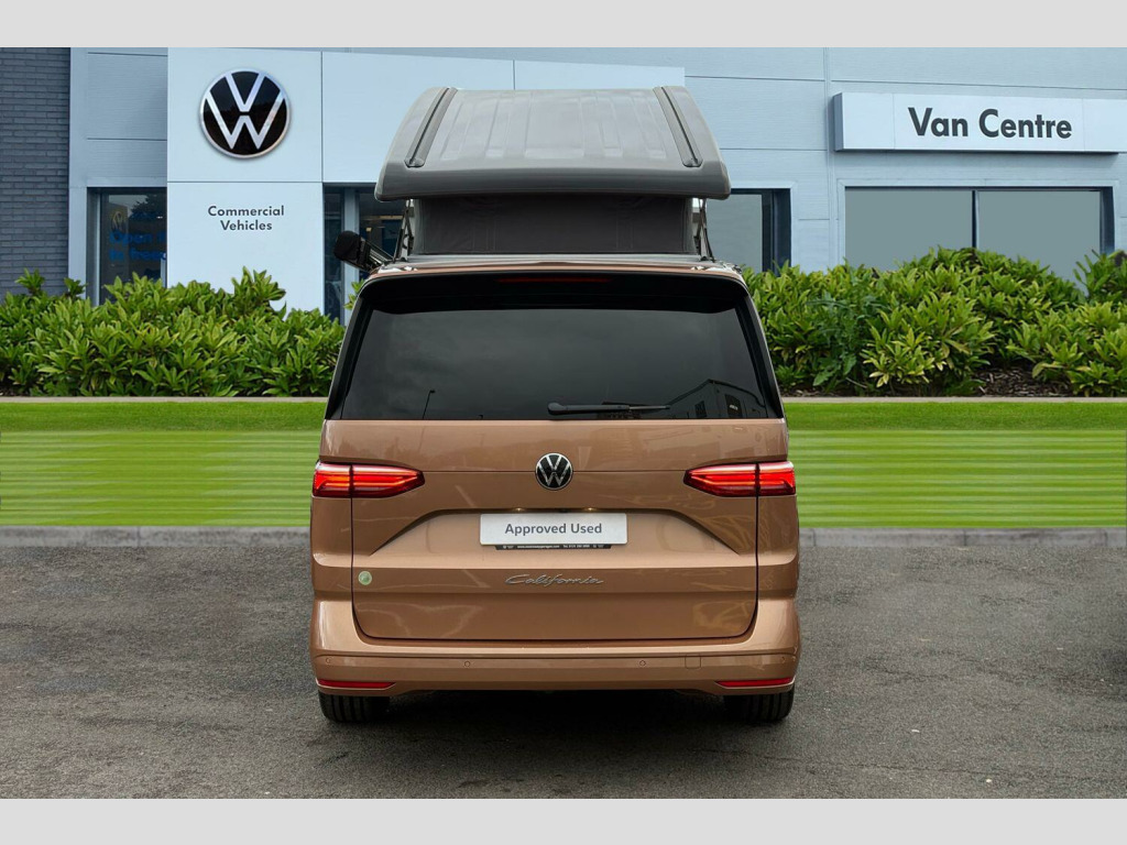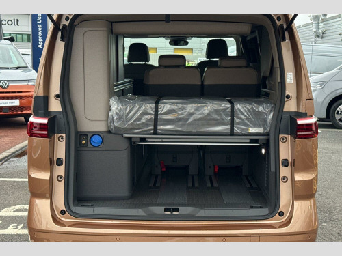 Copper Bronze with Deep Black Pearl Roof, Black awning rail on both sides with black awning, Roof bellows - Basalt grey, Parking sensors front + rear, 360° Parking cameras, Melange bi-color cloth upholstery, Interior lighting on pop-up roof, tailgate & summer kitchen and ambient lighting in roof frame, Ocean kitchen cupboards in 'Graphite Grey' slate-effect, with outdoor folding table and roof storage box, Heated leather multifunctional steering wheel with paddles, Advanced parking pack - California, 2 Vehicle keys, 19" Halmstadt light-alloy wheels in black with high-sheen finish, Metallic - Copper Bronze with deep black pearl roof, Retractable towbar with electric release, Melange bi-color cloth - Raven black/Sand, Four speed control for windscreen wipers, Heat and sound insulating laminated safety glass windshield, Heated windscreen, Sliding window in front with fly screen in passenger compartment left/right & including privacy glass in rear, Windscreen wiper intermittent control, Standard suspension and shock absorption, Electro hydraulic elevating roof, with three windows including one front passengers panorama opening, canvas in Basalt Grey, Gloss black grille with 2 illuminated chrome trim, Nameplate set California, Rear boot, 3rd brake light, Dynamic headlight range control, Illuminated molding between headlamps, Poor weather light including cornering light, Red LED tail lights, Autonomous emergency braking, Front disc brakes, Swerve support and oncoming vehicle braking when turning, Advanced driver attention and drowsiness monitor, Driving profile selection, Dynamic road sign display, Front cross traffic assist, Lane keeping system Lane Assist, Multifunction camera, PAS, Servotronic speed sensitive power steering, Speed limiter and predicative speed limiter, Turn assist with evasive assistance, High gloss black door mirrors, 2x3 point automatic seatbelts at the rear outside with ECE label, with/without belt tensioner, Child locks, Driver and front passenger airbags with front passenger airbag deactivation button, First aid kit with warning triangle and safety vest, Front Assist with pedestrian and cyclist detection, Height adjustable three point automatic seatbelts at front with belt and end fitting tensioners, Occupants detection only display, Side and curtain airbags for driver and front passenger, curtain airbags for outer seats in rear, centre airbag in front, Tyre pressure loss indicator, Warning signal and warning lamp for front and rear seat belts not fastened, Velour floor mats in cab, Camper parking heater for continuous operation & parking heater for windshield defrosting with radio remote control, 230V external inlet with charging feature for vehicle batteries, 230V inverter with socket on driver seat, Additional interior noise attenuation, Darkening roller blinds and thermo mats, Drawers under the outer seats in the cab and passenger compartment & 2 waste bins, Heated steering wheel, Kitchen with outdoor folding table for cooking and roof storage box in dTcor 2, Lockable glove compartment with lighting, Luggage compartmen with power latching, Multifunction leather steering wheel with paddle shifters, Reinforced plastic floor covering in wood look, Storage compartment left and right 1st row of seats, Summer kitchen with outside folding table and 230-V outlet for cooking and roof storage box, Surround lighting in door area, Without loading edge protection, Without luggage compartment cover, Ambient interior lighting, Tailgate latching without unlatching function from inside, California on tour app, Mobile phone interface, Preparation for online services, Preparation for We connect and We connect plus, Volkswagen wired and wireless app connect, 10.4 inch infotainment system with scalable module options, 2 USB-C ports at the front, 4 USB-C charging sockets in the passenger compartment, 8 Speakers, Digital radio reception (DAB), eCall emergency system, Tailgate with window aperture and with power latching, Digit