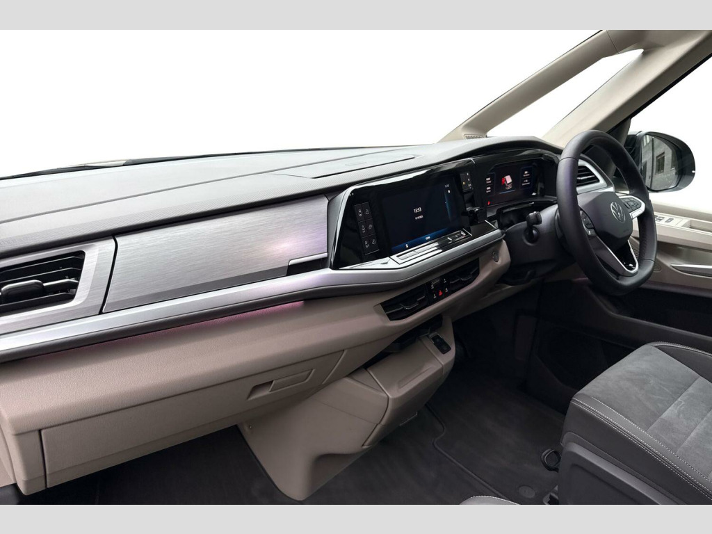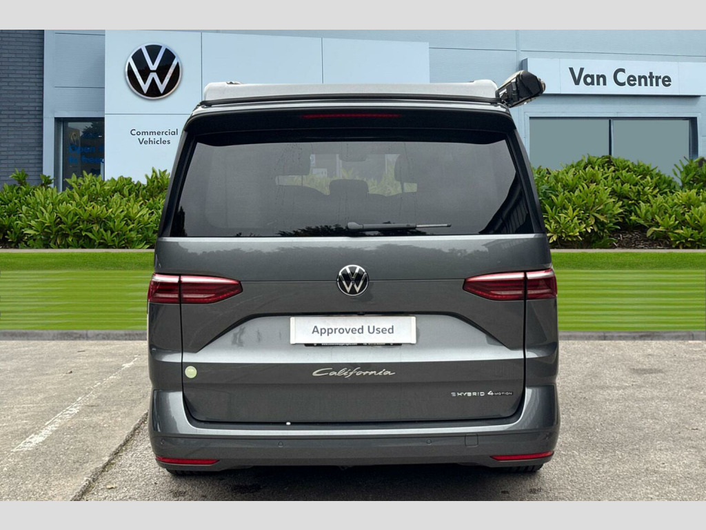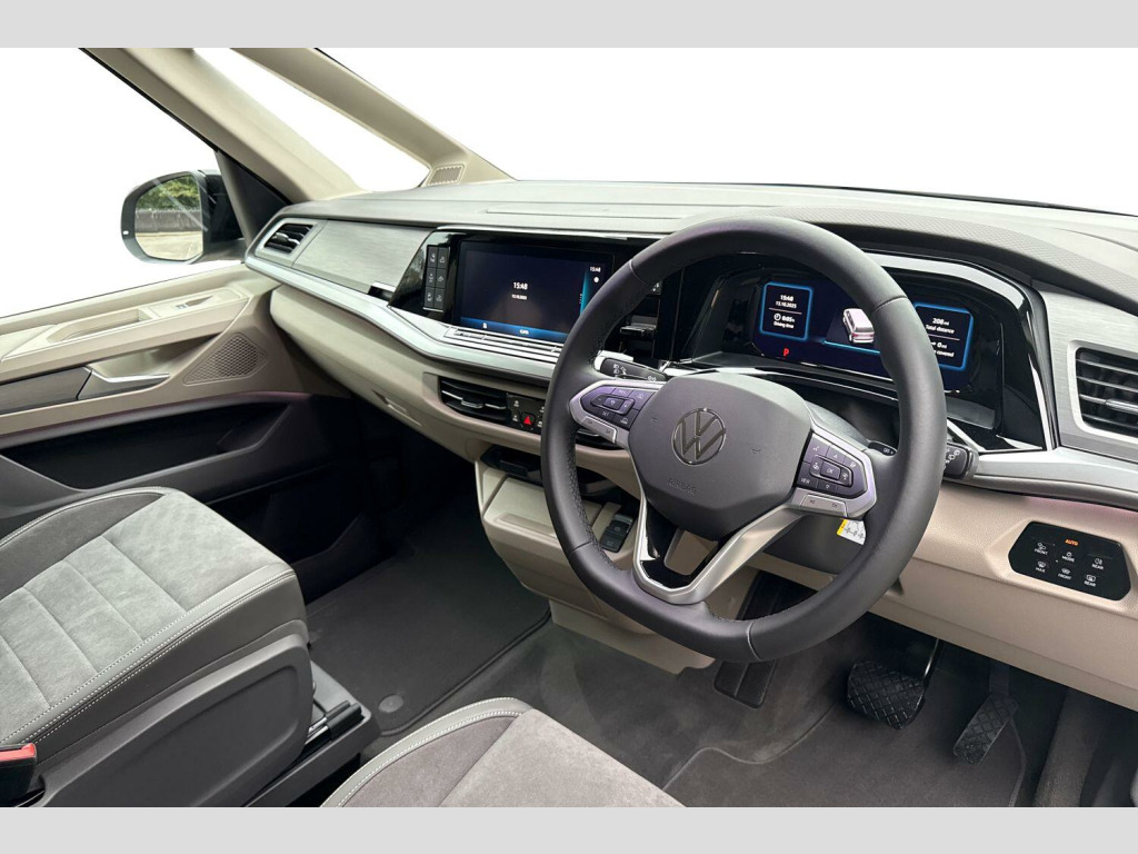 Metallic paint, Rear view camera, Carpet mats in cab, Advanced parking pack - California, 19" Halmstadt black alloy wheels, Metallic - Indium grey, Retractable towbar with electric release, 65% light absorbing privacy glass, Four speed control for windscreen wipers, Heat and sound insulating laminated safety glass windshield, Heated windscreen, Sliding window in front with fly screen in passenger compartment left/right & fixed window in rear in load passenger compartment at left, Windscreen wiper intermittent control, Standard suspension and shock absorption, Electro hydraulic elevating roof, with three windows including one front passengers panorama opening, canvas in Basalt Grey, Nameplate set California, Rear boot, 3rd brake light, Dynamic Light Assist for LED matrix headlights, Illuminated molding between headlamps, Poor weather light including cornering light, Red LED tail lights, Autonomous emergency braking front assist with pedestrian and cyclist monitoring, Front disc brakes, Swerve support and oncoming vehicle braking when turning, Advanced driver attention and drowsiness monitor, Driving profile selection, Lane keeping system Lane Assist, Multifunction camera, PAS, Traffic sign recognition, Turn assist with evasive assistance, High gloss black door mirrors, 2x3 point automatic seatbelts at the rear outside with ECE label, with/without belt tensioner, Child locks, Driver and front passenger airbags with front passenger airbag deactivation button, First aid kit with warning triangle and safety vest, Front Assist with pedestrian and cyclist detection, Height adjustable three point automatic seatbelts at front with belt and end fitting tensioners, Side and curtain airbags for driver and front passenger, curtain airbags for outer seats in rear, centre airbag in front, Tyre pressure loss indicator, California on tour app, Mobile phone interface, Preparation for online services, Volkswagen wired and wireless app connect, 2 USB-C ports at the front, 4 USB-C charging sockets in the passenger compartment, 8 Speakers, Digital radio reception (DAB), eCall emergency system, Tailgate with window aperture and with power latching, Digital cockpit pro, Discover Pro Navigation system, Emergency assist, Function control unit, IDA voice assistant and voice enhancer, Additional batteries 2nd and 3rd with voltage transformer NV, Battery without capacity specification, Standard battery/generator, Dark silver brushed decorative inlays, 2 single seats with integrated seatbelt and sleeping mat, Armrest on front swivel seats in both sides with electric lumbar support, Front and rear headrests, Heated front seats, Single front passenger seat, Swivel seat on left with height adjustable including drawer, Swivel seat on right with height adjustable including drawer, Camper parking heater for continuous operation & parking heater for windshield defrosting with radio remote control, 230V external inlet with charging feature for vehicle batteries, 230V inverter with socket on driver seat, Additional interior noise attenuation plus, Darkening roller blinds and thermo mats, Drawers under the outer seats in the cab and passenger compartment & 2 waste bins, Heated steering wheel, Kitchen with outdoor folding table for cooking and roof storage box in dTcor 2, Lockable glove compartment with lighting, Multifunction leather steering wheel with paddle shifters, Plastic floor covering in passenger/load compartment, Surround lighting in door area, Ambient interior lighting, Advanced assistance pack - California, Top package - California, Anti theft alarm system with interior monitoring in cab, backup horn and towing protection, Central locking + keyless locking and starting system Keyless Advanced with safe lock, Lockable wheel bolts, Preparation for alcohol interlock, 5+ Promise service plan, Trims for alloy wheels, Tool kit, Tyre mobility kit