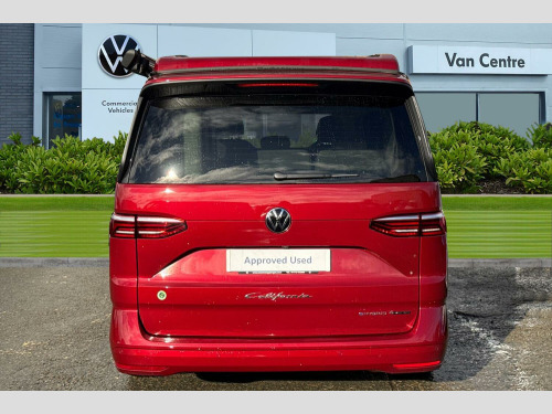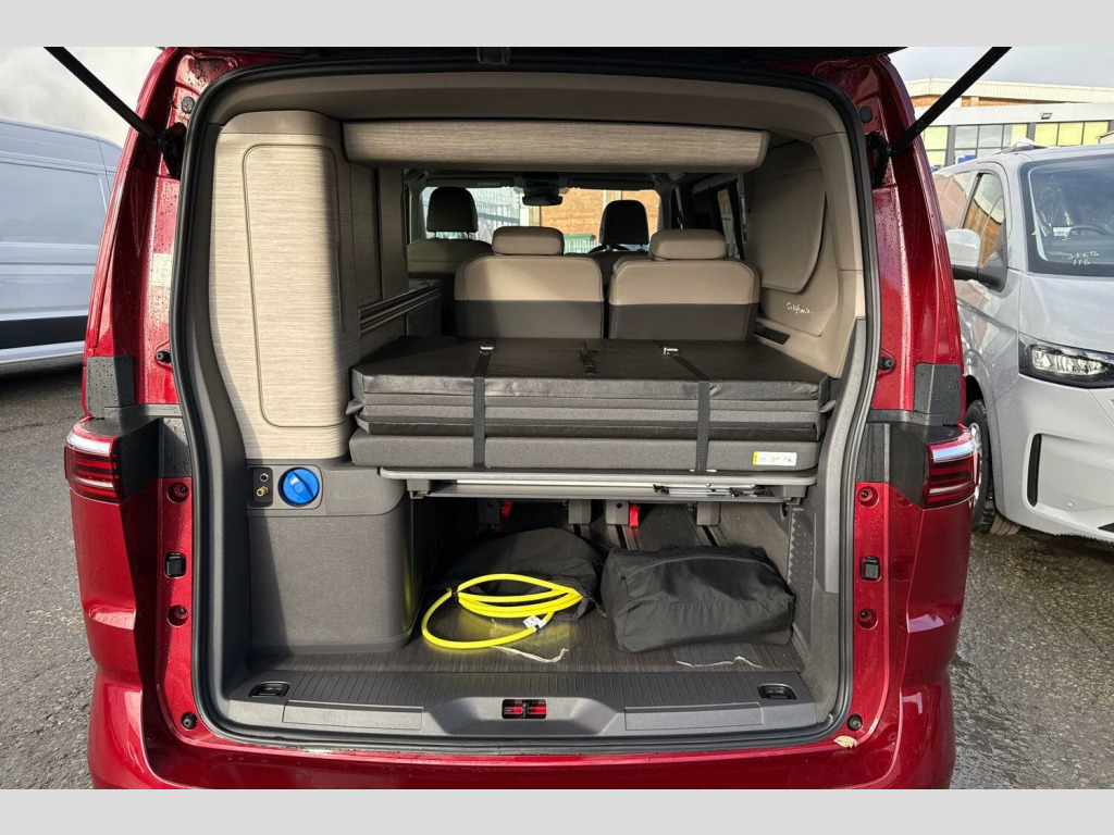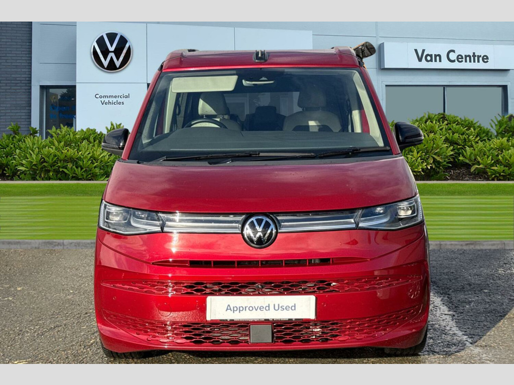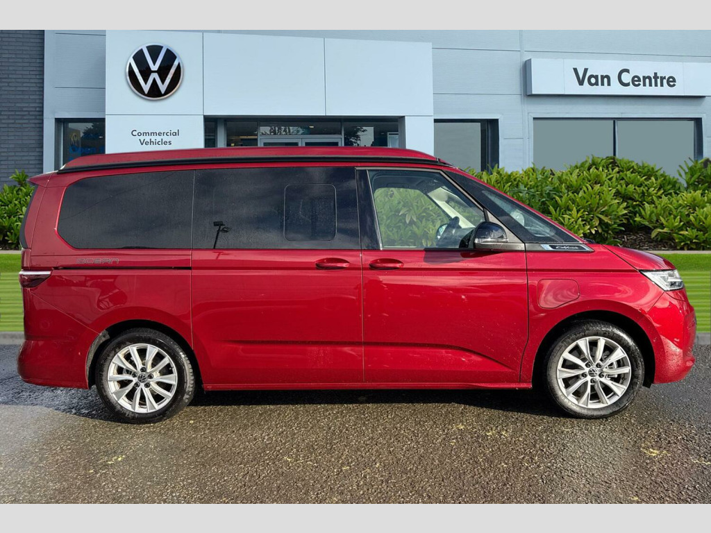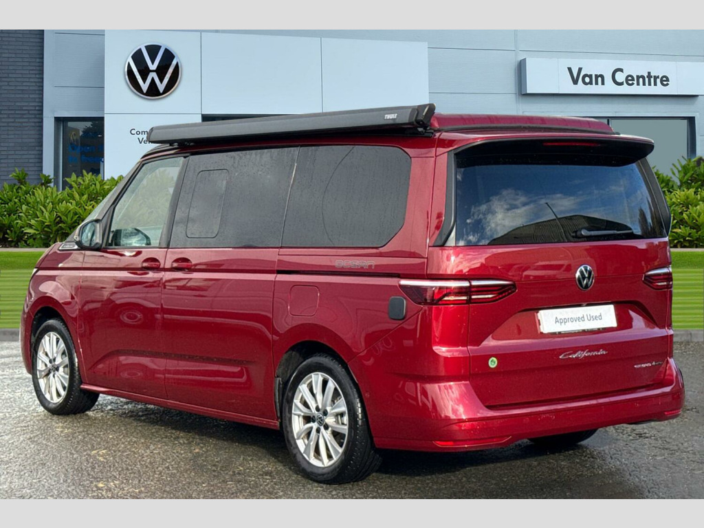 Metallic paint, Rear view camera, 235/50 R18 tyres with low rolling resistance, 18" Toshima silver alloy wheels, Metallic - Fortana red, 65% light absorbing privacy glass, Four speed control for windscreen wipers, Heat and sound insulating laminated safety glass windshield, Heated windscreen, Sliding window in front with fly screen in passenger compartment left/right & fixed window in rear in load passenger compartment at left, Windscreen wiper intermittent control, Standard suspension and shock absorption, Electro hydraulic elevating roof, with three windows including one front passengers panorama opening, canvas in Basalt Grey, Nameplate set California, 3rd brake light, Dynamic Light Assist for LED matrix headlights, Illuminated molding between headlamps, Poor weather light including cornering light, Red LED tail lights, Autonomous emergency braking front assist with pedestrian and cyclist monitoring, Front disc brakes, Swerve support and oncoming vehicle braking when turning, Advanced driver attention and drowsiness monitor, Driving profile selection, Lane keeping system Lane Assist, Multifunction camera, PAS, Traffic sign recognition, Turn assist with evasive assistance, High gloss black door mirrors, 2x3 point automatic seatbelts at the rear outside with ECE label, with/without belt tensioner, Child locks, Driver and front passenger airbags with front passenger airbag deactivation button, First aid kit with warning triangle and safety vest, Front Assist with pedestrian and cyclist detection, Height adjustable three point automatic seatbelts at front with belt and end fitting tensioners, Side and curtain airbags for driver and front passenger, curtain airbags for outer seats in rear, centre airbag in front, Tyre pressure loss indicator, California on tour app, Mobile phone interface, Preparation for online services, Volkswagen wired and wireless app connect, 2 USB-C ports at the front, 4 USB-C charging sockets in the passenger compartment, 8 Speakers, Digital radio reception (DAB), eCall emergency system, Tailgate with window aperture and with power latching, Digital cockpit pro, Discover Pro Navigation system, Emergency assist, Function control unit, IDA voice assistant and voice enhancer, Additional batteries 2nd and 3rd with voltage transformer NV, Battery without capacity specification, Standard battery/generator, Dark silver brushed decorative inlays, 2 single seats with integrated seatbelt and sleeping mat, Armrest on front swivel seats in both sides with electric lumbar support, Front and rear headrests, Heated front seats, Single front passenger seat, Swivel seat on left with height adjustable including drawer, Swivel seat on right with height adjustable including drawer, Camper parking heater for continuous operation & parking heater for windshield defrosting with radio remote control, 230V external inlet with charging feature for vehicle batteries, 230V inverter with socket on driver seat, Additional interior noise attenuation plus, Darkening roller blinds and thermo mats, Drawers under the outer seats in the cab and passenger compartment & 2 waste bins, Heated steering wheel, Kitchen with outdoor folding table for cooking and roof storage box in dTcor 2, Lockable glove compartment with lighting, Multifunction leather steering wheel with paddle shifters, Plastic floor covering in passenger/load compartment, Surround lighting in door area, Ambient interior lighting, Advanced assistance pack - California, Top package - California, Anti theft alarm system with interior monitoring in cab, backup horn and towing protection, Central locking + keyless locking and starting system Keyless Advanced with safe lock, Lockable wheel bolts, Preparation for alcohol interlock, 5+ Promise service plan, Hub caps for alloy wheels, Tool kit