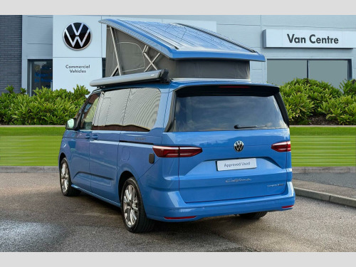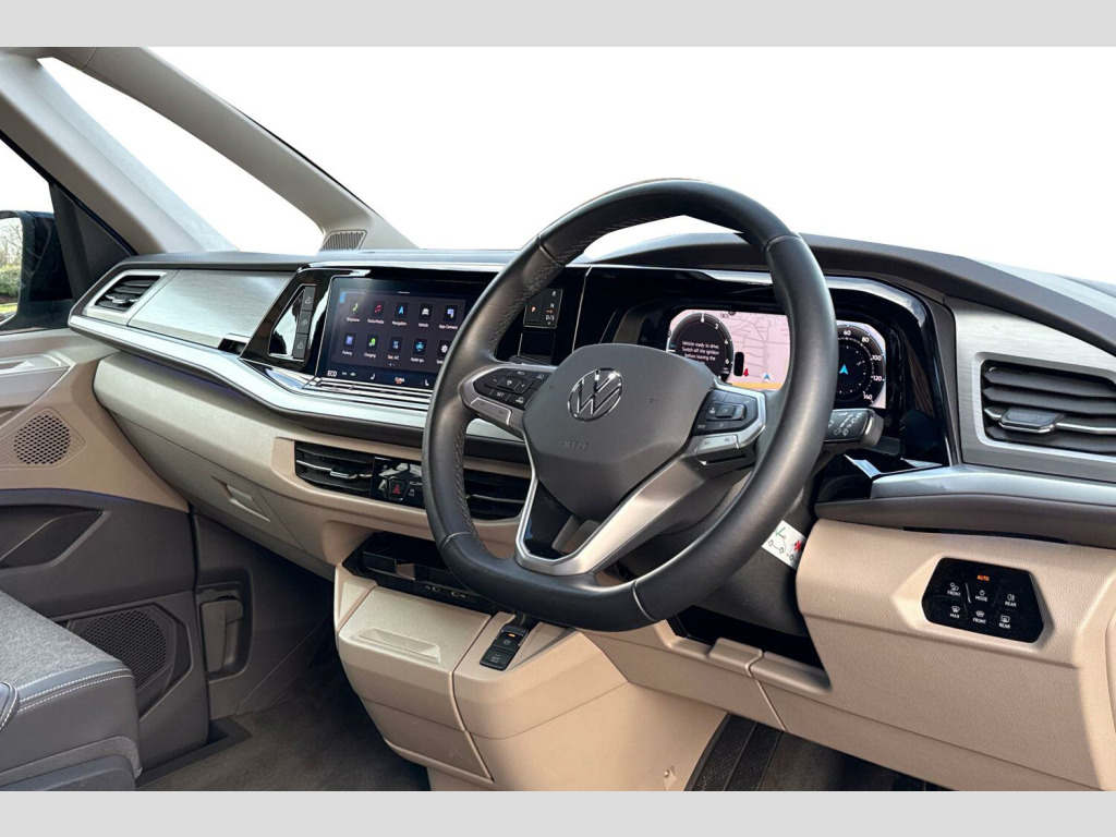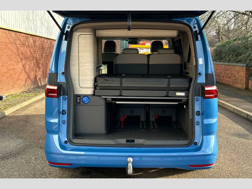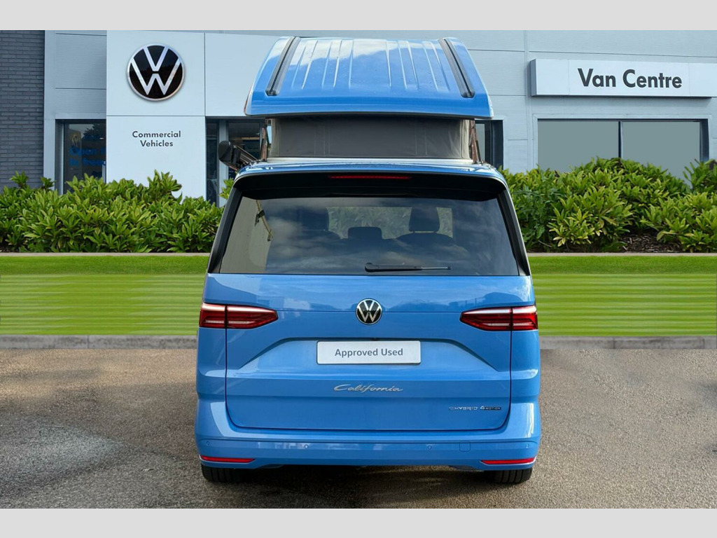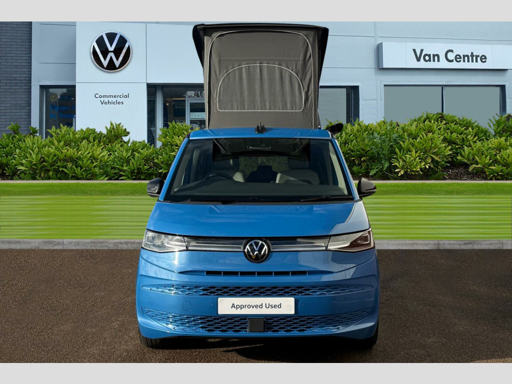 Retractable Tow Bar with Electric Release, Awning in Black - Housing and Rail - Right, Florida Beach Blue-Metallic Paint, Black awning rail on both sides with black awning on left side, Retractable towbar with electric release, Sliding side windows in 2nd row, Parking sensors front + rear, Rear view camera, Heated windscreen, Cupboards in graphite grey slate effect, Melange bi-color cloth upholstery, Interior lighting on pop-up roof, tailgate & summer kitchen, LED interior lighting, 2 Vehicle keys, 18" Toshima silver alloy wheels, Metallic - Florida beach blue, Retractable towbar with electric release, Melange bi-color cloth - Raven black/Sand, 5 Years Warranty, 5 Years Roadside Assistance, 5 Services, 3 MOT's, (From Date Of Registration), 65% light absorbing privacy glass, Four speed control for windscreen wipers, Heat and sound insulating laminated safety glass windshield, Heated windscreen, Sliding window in front with fly screen in passenger compartment left/right & fixed window in rear in load passenger compartment at left, Windscreen wiper intermittent control, Standard suspension and shock absorption, Electro hydraulic elevating roof, with three windows including one front passengers panorama opening, canvas in Basalt Grey, Nameplate set California, Rear boot, 3rd brake light, Dynamic Light Assist for LED matrix headlights, Illuminated molding between headlamps, Poor weather light including cornering light, Red LED tail lights, Autonomous emergency braking front assist with pedestrian and cyclist monitoring, Front disc brakes, Swerve support and oncoming vehicle braking when turning, Advanced driver attention and drowsiness monitor, Driving profile selection, Lane keeping system Lane Assist, Multifunction camera, PAS, Traffic sign recognition, Turn assist with evasive assistance, High gloss black door mirrors, 2x3 point automatic seatbelts at the rear outside with ECE label, with/without belt tensioner, Child locks, Driver and front passenger airbags with front passenger airbag deactivation button, First aid kit with warning triangle and safety vest, Front Assist with pedestrian and cyclist detection, Height adjustable three point automatic seatbelts at front with belt and end fitting tensioners, Side and curtain airbags for driver and front passenger, curtain airbags for outer seats in rear, centre airbag in front, Tyre pressure loss indicator, California on tour app, Mobile phone interface, Preparation for online services, Volkswagen wired and wireless app connect, 2 USB-C ports at the front, 4 USB-C charging sockets in the passenger compartment, 8 Speakers, Digital radio reception (DAB), eCall emergency system, Tailgate with window aperture and with power latching, Digital cockpit pro, Discover Pro Navigation system, Emergency assist, Function control unit, IDA voice assistant and voice enhancer, Additional batteries 2nd and 3rd with voltage transformer NV, Battery without capacity specification, Standard battery/generator, Dark silver brushed decorative inlays, 2 single seats with integrated seatbelt and sleeping mat, Armrest on front swivel seats in both sides with electric lumbar support, Front and rear headrests, Heated front seats, Single front passenger seat, Swivel seat on left with height adjustable including drawer, Swivel seat on right with height adjustable including drawer, Camper parking heater for continuous operation & parking heater for windshield defrosting with radio remote control, 230V external inlet with charging feature for vehicle batteries, 230V inverter with socket on driver seat, Additional interior noise attenuation plus, Darkening roller blinds and thermo mats, Drawers under the outer seats in the cab and passenger compartment & 2 waste bins, Heated steering wheel, Kitchen with outdoor folding table for cooking and roof storage box in dTcor 2, Lockable glove compartment with lighting, Multifunction leather steering wheel with paddle shifters, Plastic floor covering in passenger/load compartment, Surround lighting in door area, Ambient interior lighting, Advanced assistance