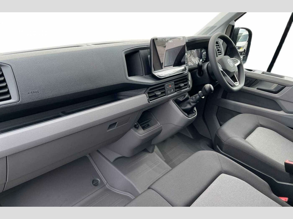 Bluetooth, Digital clock, Driver alert system, E-call + We connect basic preparation, Front and rear parking sensors, Instrument cluster, Lane keeping assist, Lights on warning buzzer, Locking fuel cap, Multi-function Display Plus, Rev counter, Service indicator, Speedometer, Voice control system, Composition media with 6.5" with we connect plus prep, 4 speaker, multifun display plus, USB, mob interface, app con, "We connect function", DAB Radio, Auto low beam mode, Leaving home function and manual coming home function, Black unpainted plastic front bumper, Cab doors, Convex and wide angle mirror, Driver seatbelt warning light, Electric windows, Heat insulating glass, Indicators in front door mirrors, Manually adjustable door mirrors, One towing eye in front, Special identification plate, Unpainted radiator grille, Air recirculation system, Ashtray, Centre console storage tray, CFCU preparation, Charcoal filter, Document holder on centre console, Drinks holders, Electromechanical Servotronic steering, Electronically controlled heating system, Fully adjustable suspension type driver seat, Height adjustable head restraints, Height and reach adjustable steering wheel, Illuminated glove compartment with lockable lid, Interior light, including 2 reading lights, Interior light, switchable by door, Jack and tool kit, Multifunction steering wheel, Preparation for interface for external use with terminal block, Storage compartments in doors and in step, right, Storage tray on dashboard, Two 12V outlets in the cab (in the dashboard), Without rear side trim panel passenger load compartment, Non-smokers pack - Crafter, 3 point inertia reel belt on all seats, Automatic hazard light with emergency braking, Crosswind assist, Driver and front passenger airbag with front passenger airbag deactivation, Height adjustable seatbelts for outer cab seats, 1 rigid key, Engine immobiliser, ABS, Automatic post collision braking system, EBA, EBD, EDL, ESP, Front disc brakes, HBA, Hill start assist, Parking brake - hill hold control, Start and stop system with regenerative braking, TCS, Hub cap covers