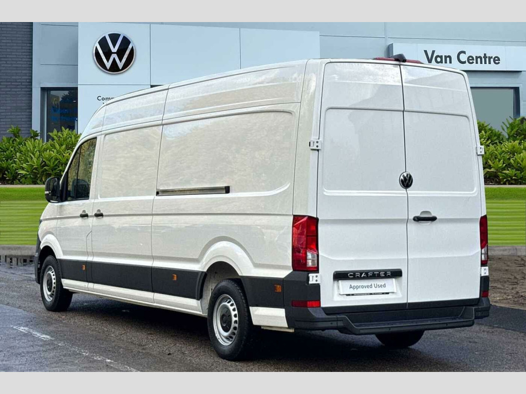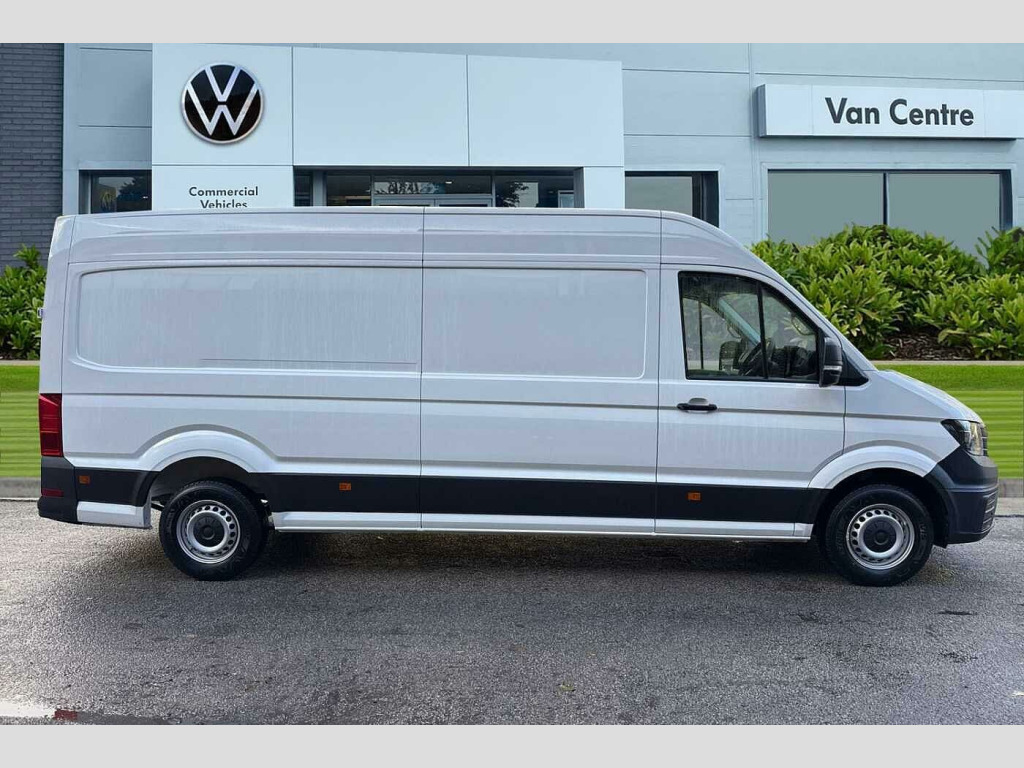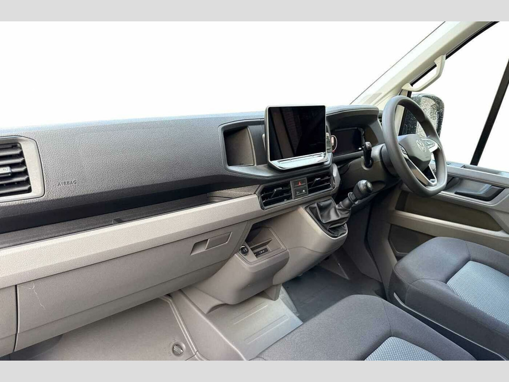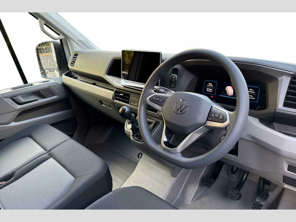 Volkswagen Crafter 2.0 TDI 140PS Commerce High Roof Van Heated windscreen washer nozzles, Solid paint, Front and rear parking sensors, Solid - Candy white, Electric windows, Heat insulating glass, Windscreen wiper auto control with light and rain sensor, Black unpainted plastic front bumper, Rear badges, Special identification plate, Unpainted radiator grille, Auto low beam mode, Leaving home function and manual coming home function, Driver seatbelt warning light, Indicators in front door mirrors, Touch panel control for exterior lights, ABS, Automatic post collision braking system, EBA, EBD, EDL, Electronic parking brake - hill hold control, ESP, Front disc brakes, HBA, Hill start assist, Start and stop system with regenerative braking, TCS, Advanced driver attention and drowsiness monitor, Blind spot monitor, Digital cockpit with active Info display, Forward collision warning with warning and braking reaction to vehicles, pedestrians and cyclists, Front assist including city emergency braking, Convex and wide angle mirror, 3 point inertia reel belt on all seats, Automatic hazard light with emergency braking, Crosswind assist, Driver and front passenger airbag with front passenger airbag deactivation, Height adjustable seatbelts for outer cab seats, Bluetooth, E-call + We connect basic preparation, USB socket at top of windscreen, 2 USB C ports in dashboard, DAB Radio, Cab doors, Lane keeping assist, Locking fuel cap, Roof console for interior lighting control, Wireless charging, Digital clock, Dynamic road sign display, Instrument cluster, Lights on warning buzzer, Rev counter, Service indicator, Speedometer, Air recirculation system, Charcoal filter, Electronically controlled heating system, Ashtray, Centre console storage tray, CFCU preparation, Document holder on centre console, Drinks holders, Electromechanical Servotronic steering, Height and reach adjustable steering wheel, Illuminated glove compartment with lockable lid, Jack and tool kit, Preparation for interface for external use with terminal block, Storage compartments in doors and in step, right, Storage tray on dashboard, Two 12V outlets in the cab (in the dashboard), Interior light, including 2 reading lights, Interior light, switchable by door, Without rear side trim panel passenger load compartment, Non-smokers pack - Crafter, Fully adjustable suspension type driver seat, Height adjustable head restraints, 1 rigid key, Central locking system with Keyless Go without SAFELOCK entry - Keyless entry and start, Engine immobiliser, One towing eye in front, Hub cap covers