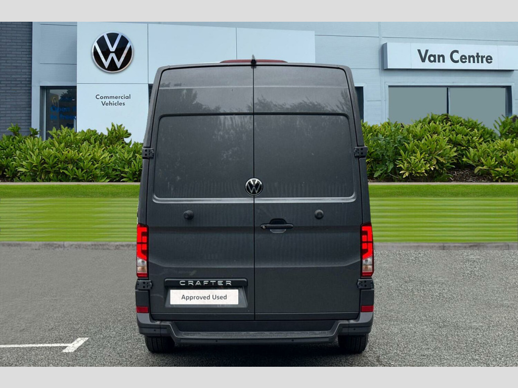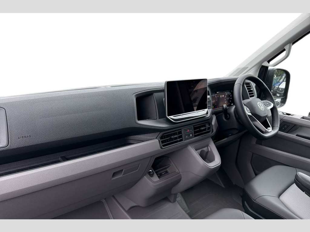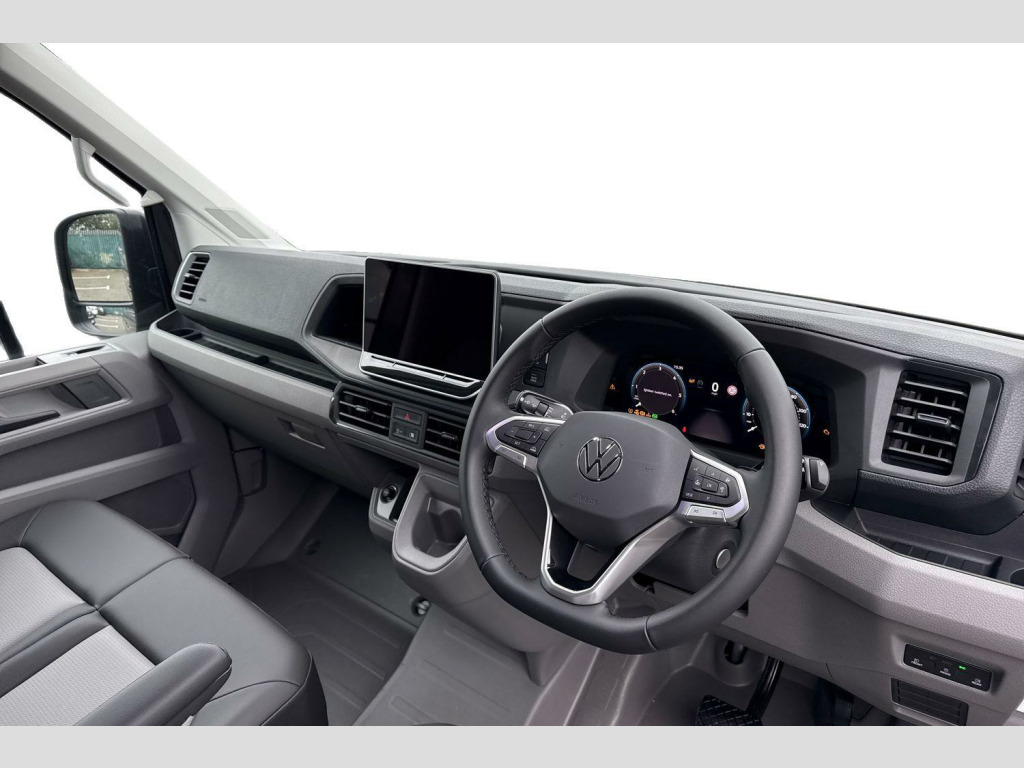 Volkswagen Crafter 2.0 TDI 140PS Commerce Plus High Roof Van Auto Full width rear step in rear bumper including Side marker lamps, Mud flaps front and rear, Front fog lights with cornering function, LED headlights with chrome strip and LED daytime running lights, Rear view camera, Mesh leatherette upholstery, Multifunction steering wheel, Wheel trims, Electric windows, Heat insulating glass, Half painted front bumper, Special identification plate, Unpainted radiator grille, Auto low beam mode, Leaving home function and manual coming home function, Driver seatbelt warning light, Indicators in front door mirrors, ABS, Automatic post collision braking system, EBA, EBD, EDL, ESP, Front disc brakes, HBA, Hill start assist, Parking brake - hill hold control, Start and stop system with regenerative braking, TCS, Convex and wide angle mirror, Electrically heated and adjustable door mirrors, 3 point inertia reel belt on all seats, Automatic hazard light with emergency braking, Crosswind assist, Driver and front passenger airbag with front passenger airbag deactivation, Height adjustable seatbelts for outer cab seats, Bluetooth, E-call + We connect basic preparation, Voice control system, Composition media with 6.5" with we connect plus prep, 4 speaker, multifun display plus, USB, mob interface, app con, "We connect function", DAB Radio, Cab doors, Rear wing doors with 270 degree hinges, Driver alert system, Locking fuel cap, Digital clock, Instrument cluster, Lights on warning buzzer, Multi-function Display Plus, Rev counter, Service indicator, Speedometer, Air recirculation system, Charcoal filter, Climatic air conditioning, Electronically controlled heating system, Ashtray, Centre console storage tray, CFCU preparation, Document holder on centre console, Drinks holders, Electromechanical Servotronic steering, Grab handles on rear entry pillars, Height and reach adjustable steering wheel, Illuminated glove compartment with lockable lid, Jack and tool kit, Preparation for interface for external use with terminal block, Storage compartments in doors and in step, right, Storage tray on dashboard, Two 12V outlets in the cab (in the dashboard), Interior light, including 2 reading lights, Interior light, switchable by door, Without rear side trim panel passenger load compartment, Non-smokers pack - Crafter, Fully adjustable suspension type driver seat, Height adjustable head restraints, 1 rigid key, Anti-theft alarm with interior monitor, back up horn and tow away protect, overhead storage with two 1-DIN, reading light, SAFELOCK with 2 remote keys, Engine immobiliser, One towing eye in front, Hub cap covers