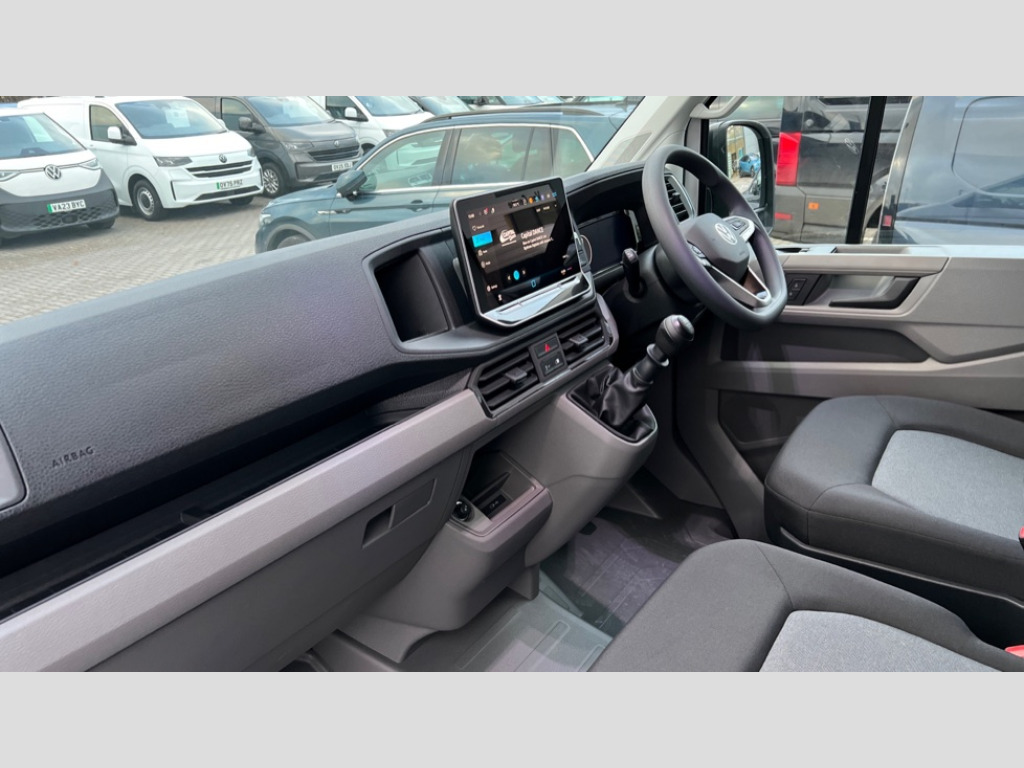 Volkswagen Crafter 2.0 TDI 140PS Commerce High Roof Van Advanced driver attention and drowsiness monitor, Blind spot monitor, Bluetooth, Digital clock, Digital cockpit with active Info display, Dynamic road sign display, E-call + We connect basic preparation, Forward collision warning with warning and braking reaction to vehicles, pedestrians and cyclists, Front assist including city emergency braking, Instrument cluster, Lane keeping assist, Lights on warning buzzer, Locking fuel cap, Rev counter, Roof console for interior lighting control, Service indicator, Speedometer, USB socket at top of windscreen, Wireless charging, 2 USB C ports in dashboard, DAB Radio, Auto low beam mode, Leaving home function and manual coming home function, Black unpainted plastic front bumper, Cab doors, Convex and wide angle mirror, Driver seatbelt warning light, Electric windows, Heat insulating glass, Indicators in front door mirrors, One towing eye in front, Rear badges, Special identification plate, Touch panel control for exterior lights, Unpainted radiator grille, Windscreen wiper auto control with light and rain sensor, Air recirculation system, Ashtray, Centre console storage tray, CFCU preparation, Charcoal filter, Document holder on centre console, Drinks holders, Electromechanical Servotronic steering, Electronically controlled heating system, Fully adjustable suspension type driver seat, Height adjustable head restraints, Height and reach adjustable steering wheel, Illuminated glove compartment with lockable lid, Interior light, including 2 reading lights, Interior light, switchable by door, Jack and tool kit, Preparation for interface for external use with terminal block, Storage compartments in doors and in step, right, Storage tray on dashboard, Two 12V outlets in the cab (in the dashboard), Without rear side trim panel passenger load compartment, Non-smokers pack - Crafter, 3 point inertia reel belt on all seats, Automatic hazard light with emergency braking, Crosswind assist, Driver and front passenger airbag with front passenger airbag deactivation, Height adjustable seatbelts for outer cab seats, 1 rigid key, Central locking system with Keyless Go without SAFELOCK entry - Keyless entry and start, Engine immobiliser, ABS, Automatic post collision braking system, EBA, EBD, EDL, Electronic parking brake - hill hold control, ESP, Front disc brakes, HBA, Hill start assist, Start and stop system with regenerative braking, TCS, Hub cap covers