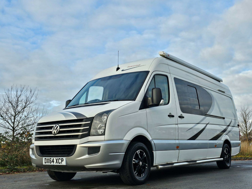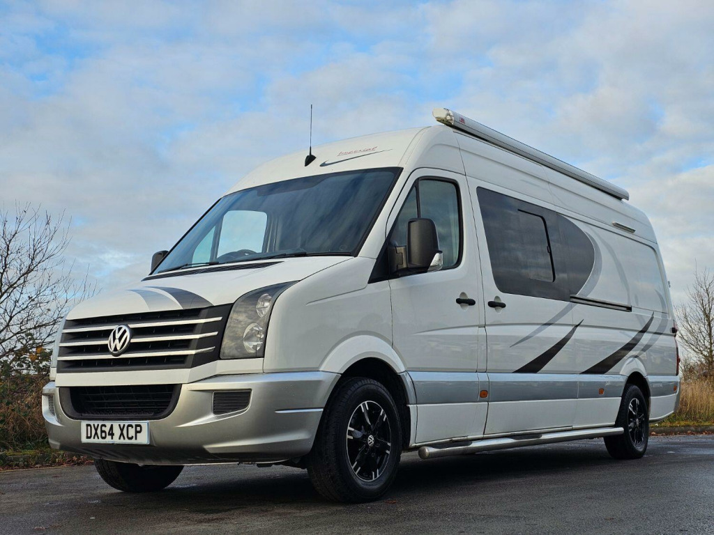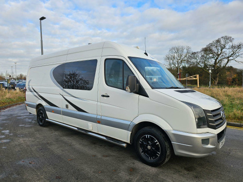 VW Crafter , Imperial Motorhome, Racevan, 2.0 TDi, 2014 14 plate, 6 speed manual, 82,000 miles, 2 berth, Large reaer checker plated garage, Air compressor, Fiamma awning, Alloy wheels, Side bars, 12v led lighting, 240v hookup, Tool box, Large water tank, Fridge / freezer, Microwave, TV, Overhead lockers, Skylight, External bbq point, Fold away table, Central heating, 12v charging ports