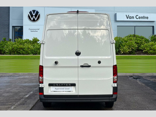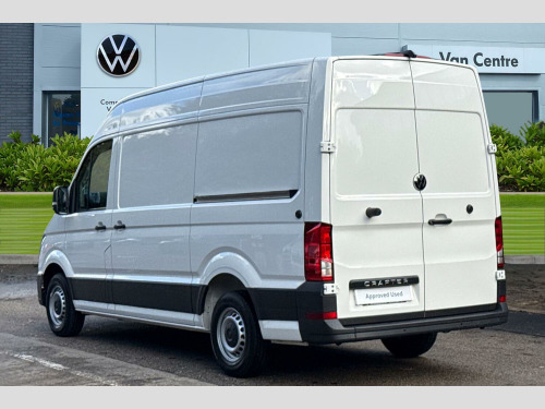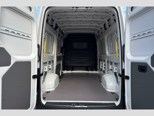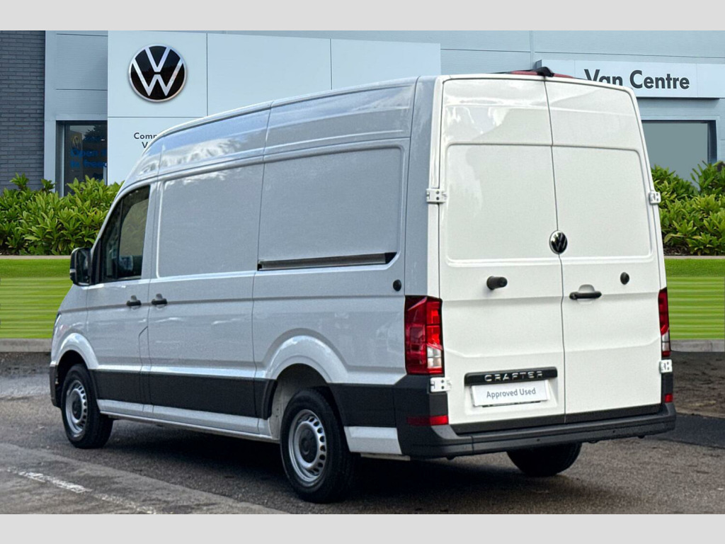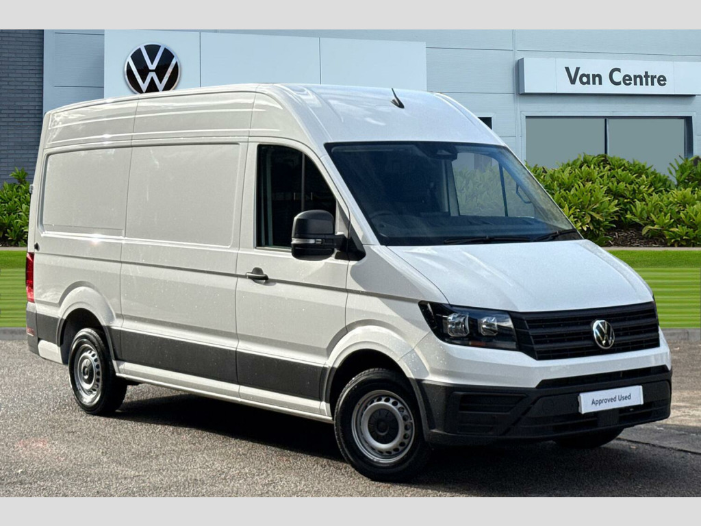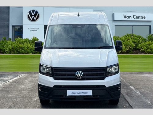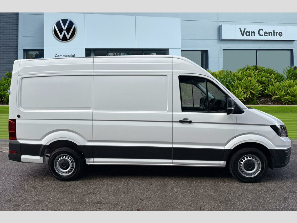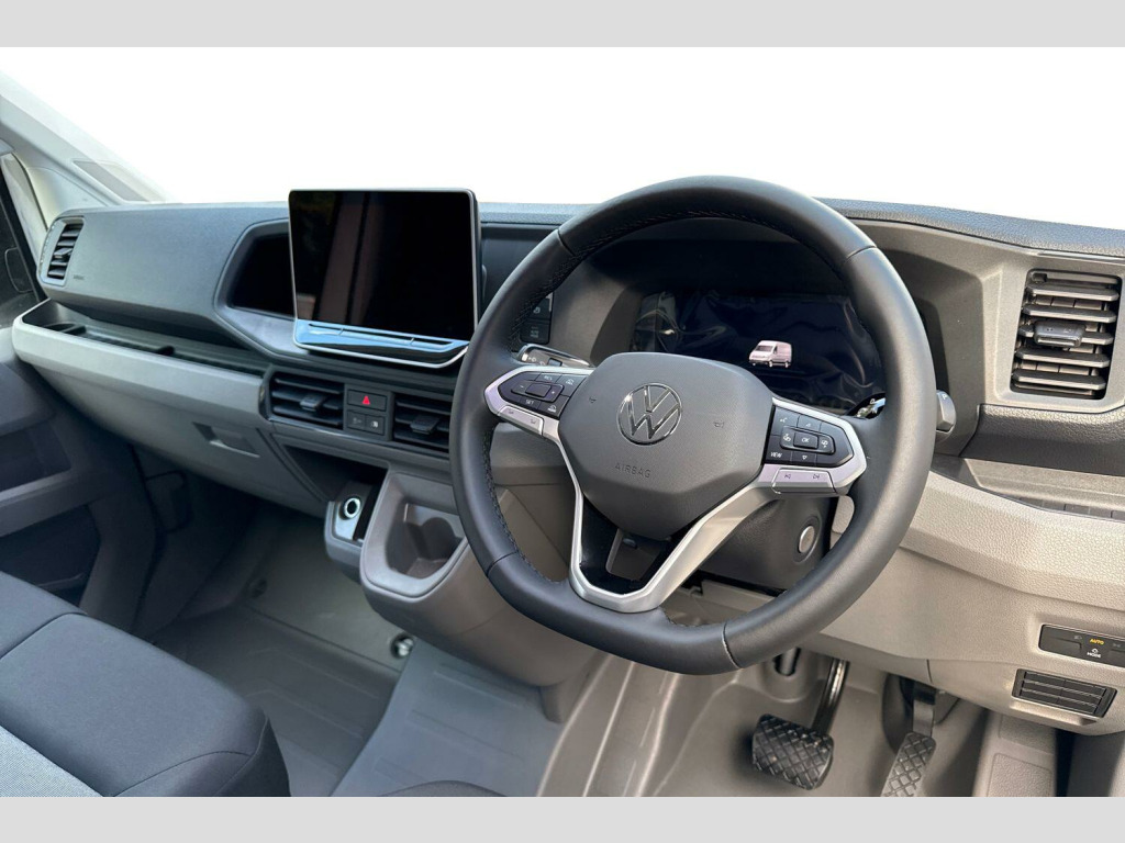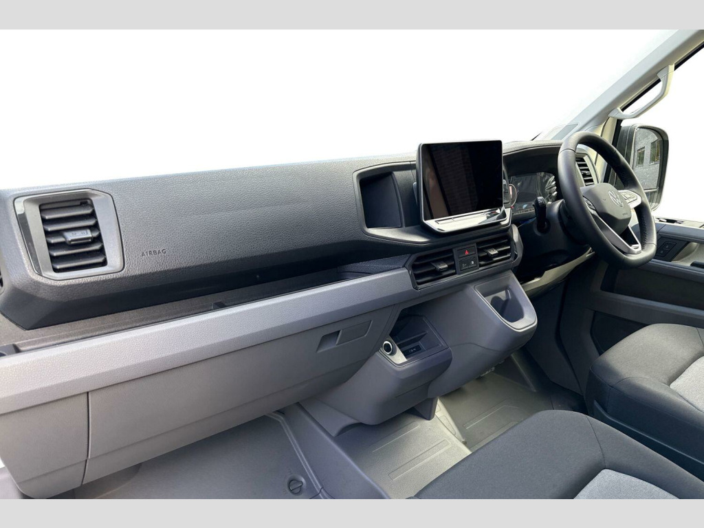 Solid paint, Rear view camera, Front and rear parking sensors, Solid - Candy white, Electric windows, Heat insulating glass, Half painted front bumper, Special identification plate, Unpainted radiator grille, Auto low beam mode, Leaving home function and manual coming home function, Driver seatbelt warning light, Indicators in front door mirrors, ABS, Automatic post collision braking system, EBA, EBD, EDL, ESP, Front disc brakes, HBA, Hill start assist, Parking brake - hill hold control, Start and stop system with regenerative braking, TCS, Convex and wide angle mirror, Electrically heated and adjustable door mirrors, 3 point inertia reel belt on all seats, Automatic hazard light with emergency braking, Crosswind assist, Driver and front passenger airbag with front passenger airbag deactivation, Height adjustable seatbelts for outer cab seats, Bluetooth, E-call + We connect basic preparation, Voice control system, Composition media with 6.5" with we connect plus prep, 4 speaker, multifun display plus, USB, mob interface, app con, "We connect function", DAB Radio, Cab doors, Rear wing doors with 270 degree hinges, Driver alert system, Locking fuel cap, Digital clock, Instrument cluster, Lights on warning buzzer, Multi-function Display Plus, Rev counter, Service indicator, Speedometer, Air recirculation system, Charcoal filter, Climatic air conditioning, Electronically controlled heating system, Ashtray, Centre console storage tray, CFCU preparation, Document holder on centre console, Drinks holders, Electromechanical Servotronic steering, Grab handles on rear entry pillars, Height and reach adjustable steering wheel, Illuminated glove compartment with lockable lid, Jack and tool kit, Preparation for interface for external use with terminal block, Storage compartments in doors and in step, right, Storage tray on dashboard, Two 12V outlets in the cab (in the dashboard), Interior light, including 2 reading lights, Interior light, switchable by door, Without rear side trim panel passenger load compartment, Non-smokers pack - Crafter, Fully adjustable suspension type driver seat, Height adjustable head restraints, 1 rigid key, Anti-theft alarm with interior monitor, back up horn and tow away protect, overhead storage with two 1-DIN, reading light, SAFELOCK with 2 remote keys, Engine immobiliser, One towing eye in front, Hub cap covers
