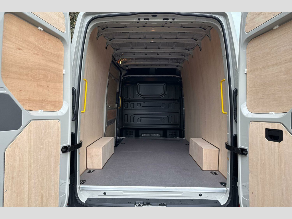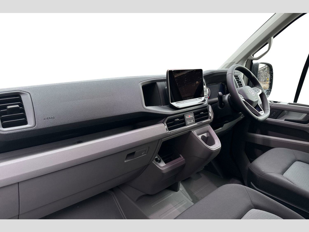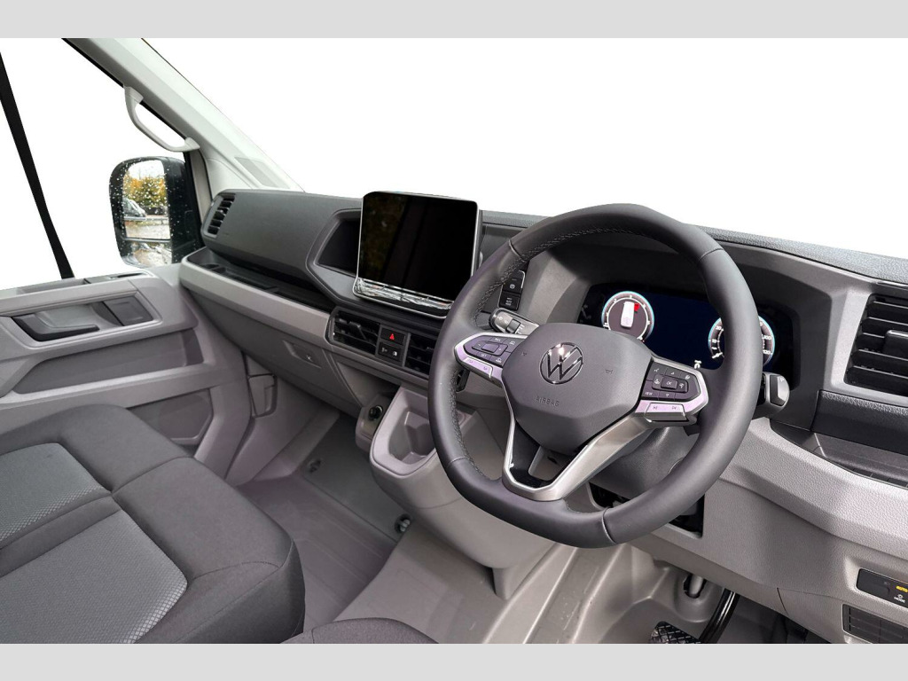 Mud flaps front and rear, Solid paint, Side marker lights, Rear view camera, Front and rear parking sensors, Leather heated multi function steering wheel, Load floor - wooden cover, Heated driver and front passenger seat, Towbar preparation with socket, Electric windows, Heat insulating glass, Half painted front bumper, Special identification plate, Unpainted radiator grille, Auto low beam mode, Leaving home function and manual coming home function, Driver seatbelt warning light, Indicators in front door mirrors, ABS, Automatic post collision braking system, EBA, EBD, EDL, ESP, Front disc brakes, HBA, Hill start assist, Parking brake - hill hold control, Start and stop system with regenerative braking, TCS, Convex and wide angle mirror, Electrically heated and adjustable door mirrors, 3 point inertia reel belt on all seats, Automatic hazard light with emergency braking, Crosswind assist, Driver and front passenger airbag with front passenger airbag deactivation, Height adjustable seatbelts for outer cab seats, Bluetooth, E-call + We connect basic preparation, Voice control system, Composition media with 6.5" with we connect plus prep, 4 speaker, multifun display plus, USB, mob interface, app con, "We connect function", DAB Radio, Cab doors, Rear wing doors with 270 degree hinges, Driver alert system, Locking fuel cap, Digital clock, Instrument cluster, Lights on warning buzzer, Multi-function Display Plus, Rev counter, Service indicator, Speedometer, 75 litre fuel tank, Air recirculation system, Charcoal filter, Climatic air conditioning, Electronically controlled heating system, Ashtray, Centre console storage tray, CFCU preparation, Document holder on centre console, Drinks holders, Electromechanical Servotronic steering, Grab handles on rear entry pillars, Height and reach adjustable steering wheel, Illuminated glove compartment with lockable lid, Jack and tool kit, Preparation for interface for external use with terminal block, Storage compartments in doors and in step, right, Storage tray on dashboard, Two 12V outlets in the cab (in the dashboard), Interior light, including 2 reading lights, Interior light, switchable by door, Without rear side trim panel passenger load compartment, Non-smokers pack - Crafter, Fully adjustable suspension type driver seat, Height adjustable head restraints, 1 rigid key, Anti-theft alarm with interior monitor, back up horn and tow away protect, overhead storage with two 1-DIN, reading light, SAFELOCK with 2 remote keys, Engine immobiliser, One towing eye in front, Hub cap covers