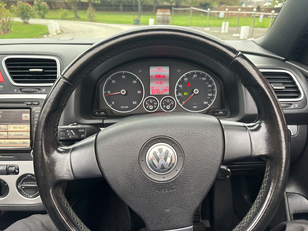 This 2009 Volkswagen Eos 2.0 TDI CR Sport Cabriolet 2dr Diesel DSG Euro 5 (140 ps) has only 101,000 miles on it and comes with a MOT that expires on 17/03/2026. As a convertible with 2 doors and 4 seats, it is a stylish and practical choice. The car is powered by a diesel engine and comes with a range of features, including 17in Solitude Alloy Wheels & AntiTheft Wheel bolts, 18in Chicago Alloy Wheels with Titanium Silver finish & AntiTheft Wheel bolts, 18in Chicago Alloy Wheels with Titanium Silver finish with RunFlat Tyres, Easy entry slide Seats access to Rear Seats, and Front Seats with height & lumbar adjust. With its impressive mileage, sleek design, and range of features, this Volkswagen Eos is a great option for anyone in the market for a convertible car., in solitude alloy wheels & antitheft wheel bolts, 18in chicago alloy wheels with titanium silver finish & antitheft wheel bolts, 18in chicago alloy wheels with titanium silver finish with runflat tyres, easy entry slide seats access to rear seats, front seats with height & lumbar adjust, high spirit- titanium black, leather trimmed steering wheel, multifunction computer- midline, semi- automatic air conditioning, lowered sports suspension, rcd 310 radio & mp3 single cd player with 8 speakers