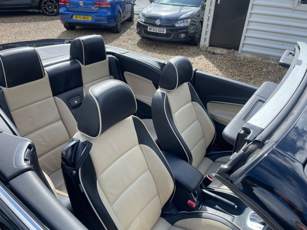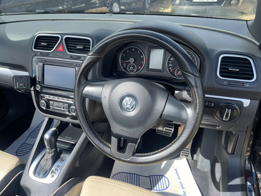 A BEAUTIFUL RARE 2.0TSI DSG AUTOMATIC 'EXCLUSIVE' SPECIAL EDITION MODEL FINISHED IN DEEP BLACK METALLIC WITH FULL SPORT DOU TONE CORNSILK/BLACK NAPPA LEATHER INTERIOR TRIM (210 ps GTi ENGINE MODEL), RNS510 SAT NAV AUDIO SYSTEM, BLUETOOTH PHONE, PARKING SENSORS, 18 VICENZA ALLOY WHEELS WITH NEW TYRES, AIR CON, PANORAMIC TILT AND SLIDE SUNROOF, TWO KEYS, ULEZ AND CLEAN AIR ZONE COMPLIANT, TWO FORMER KEEPERS WITH SERVICE RECORD, MOT SEPT, INSPECTION SERVICE,DSG SERVICE, FULL ROOF SERVICE WITH KRYTOX TREATMENT, 6 MONTHS IN HOUSE BESPOKE WARRANTY AND AFTERCARE ALL INCLUSIVE. in alloy wheels - vicenza, csc roof system - 5 section folding roof including slide and tilt sunroof, door mirrors - electrically adjustable and heated, door mirrors - electrically folding, electric windows - front, electric windows - front and rear, heated windscreen, tyre repair kit, 2 zone electronic climate control with automatic air recirculation, air conditioning - climatic semi-automatic control, armrest - front centre with storage compartment, automatic boot unlocking, automatic dimming rear view mirror, carpet mats - front and rear, cup holders - front x2, drivers seat height adjustment, easy entry slide seats access to rear seats, head restraints - front whiplash optimised, heated front seats, height and reach adjustable steering wheel, luxury pack, multi device interface, multimedia socket for external audio source, rain sensor, seats - easy entry sliding front, seats - front lumbar support, seats - height adjustment - front passenger, steering wheel - leather trimmed & gear knob & handbrake grip, steering wheel - multifunction, abs - anti-lock braking system, active rollover protection system, airbags - curtain-side impact system for front and rear seats, airbags - driver, airbags - front passenger, airbags - front passenger with deactivation switch, alarm with interior protection, central locking - remote with 2 remote keys, door side impact protection, esp includes edl and asr and countersteer support with trailer stabilsation function, hba - hydraulic brake assist, hill hold assist, isofix child seat preparation, rigid safety cell with front and rear crumple zones, brake pad wear indicator, multifunction computer - highline, parking sensors - front and rear, power assisted steering - speed sensitive, suspension - sports - lowered by approx 15mm, front fog lights with cornering lights, headlights - dusk sensor - automatic driving lights, mdi - multi device interface, rcd 310 radio & mp3 single cd player with 8 speakers, rcd 310 radio - mp3 compatible cd player with 8 speakers and aux-in socket