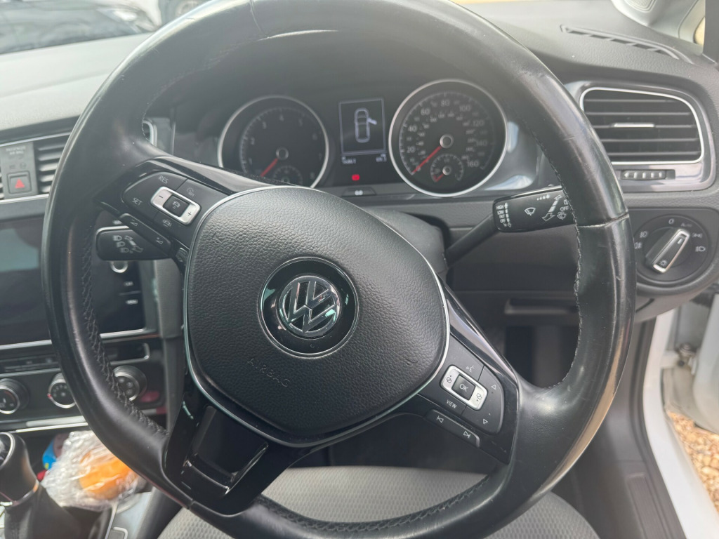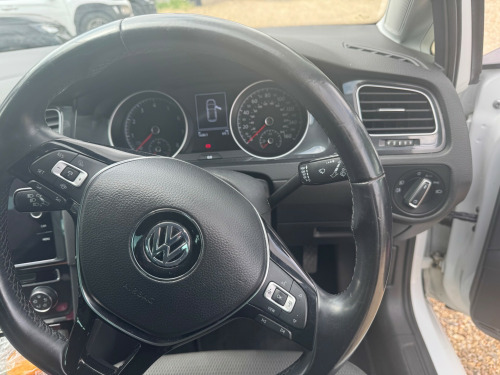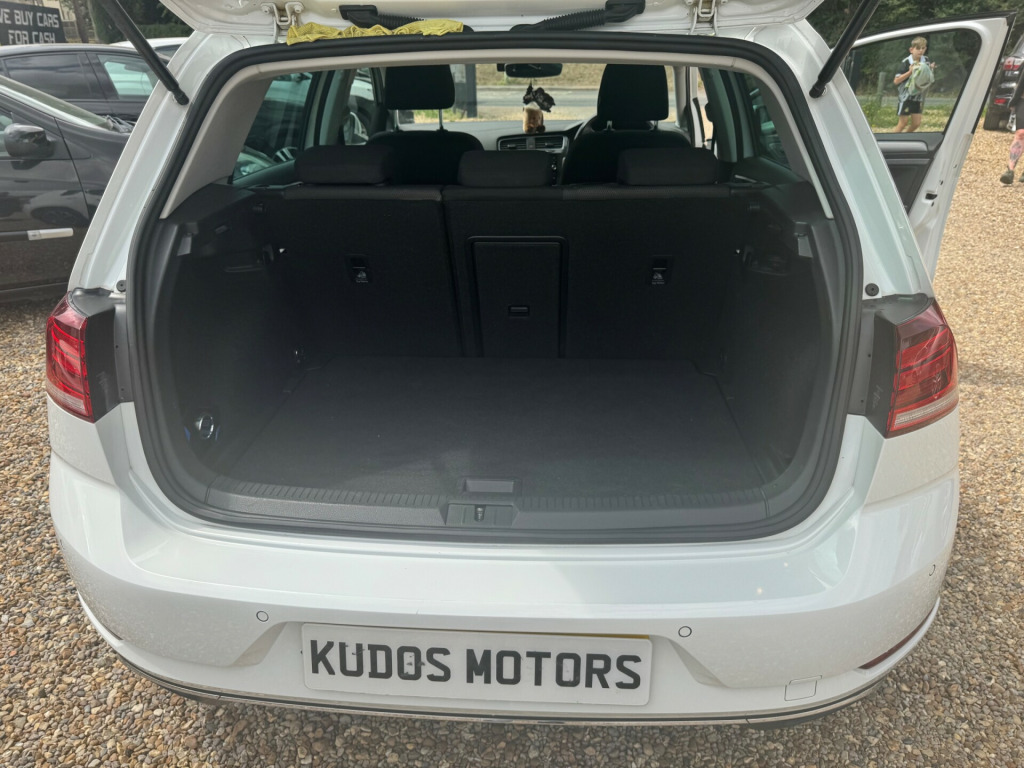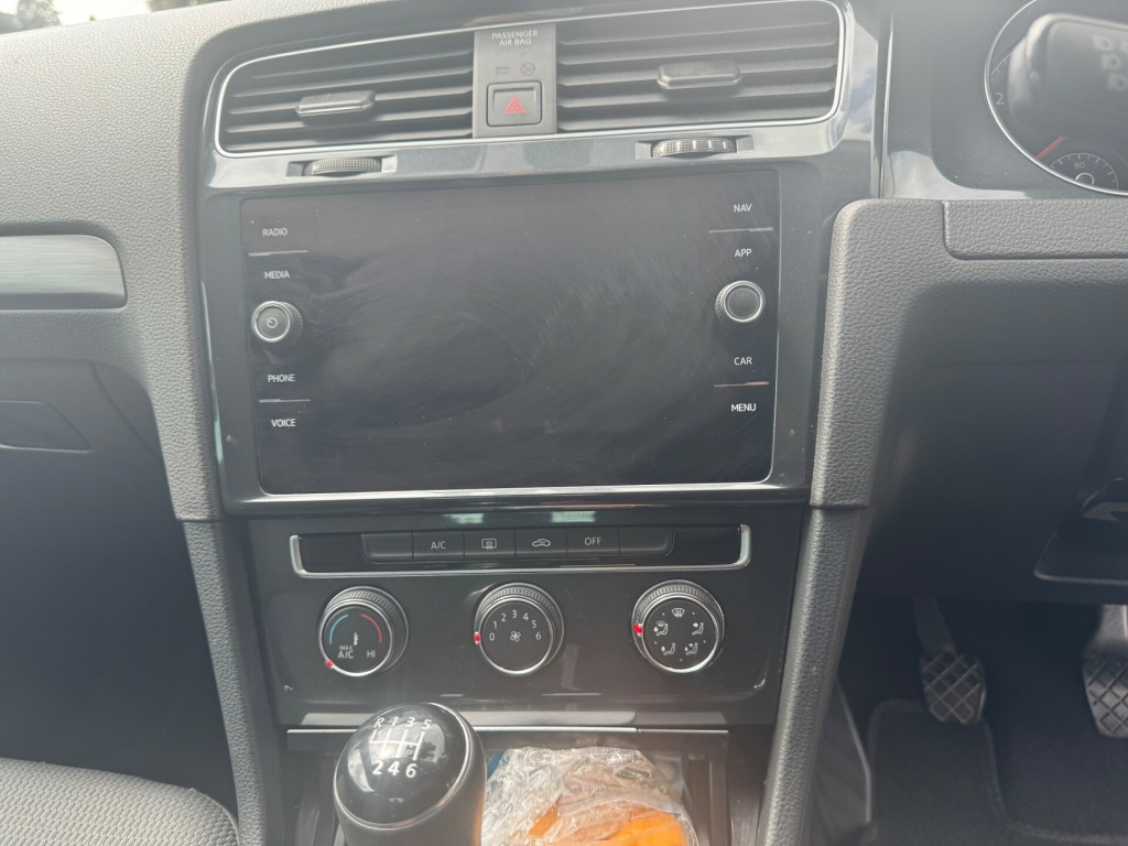 ights on' reminder warning buzzer, acc - adaptive cruise control with front assist, forward collision warning, distance monitoring, city emergency brake and speed limiter, bluetooth telephone and audio connection for compatible devices, brake pad wear indicator warning light, driver alert system, driving mode selection with four preset modes - eco, normal, sport or individual modes, instrument cluster in white, multifunction computer with visual gear change recommendation for fuel consumption, power assisted speed sensitive electro-mechanical steering, push tank flap, speed limit display, speedo, rev counter, electronic odometer, trip, service interval display, exterior temperature and fuel gauge, stop/start system, think blue trainer driver tips and journey analysis, warning buzzer and light for front seatbelts unfastened, we connect go dongle, battery regeneration during braking, xds electronic differential lock, composition media system, dab digital radio receiver, driver personalisation profile selection, mp3/wma compatability, multi device interface (mdi) with usb connection, personalisation 1.1 profile for media, premium usb cable in choice of either apple or android smartphone compatibility, sms functionality, title and cover art display, 4 x 20w output, usb connection and socket, usb and sd card connectivity, auto dimming rear view mirror, black front air intake and radiator grille with chrome insert, black rear diffuser, body colour bumpers, body colour door handles, body colour door mirrors with integrated indicators, dusk sensor + automatic driving lights, electric front windows, electric rear windows, electrically adjustable and heated door mirrors, fully galvanised body, heated rear windscreen, hidden exhaust pipe, high level 3rd brake light incorporating led technology, led front fog lights with static cornering light function, range adjustable headlights via infotainment system with led daytime running lights, rear fog lamp, rear number plate lights incorporating led technology, rear tinted glass 65% light absorbing from b pillar backwards, rear window aerial, rear window wash/wipe with intermittent wipe, reflectors in all doors, remote electrically foldable door mirrors, door mirror puddle lights and reverse activated kerb-view adjustment on passengers door mirror, tailgate with integrated rear roof spoiler, windscreen wipers/ intermittent wipe + 4 position delay, 12v socket in luggage compartment, 3 rear headrests, 4 load lashing points in luggage compartment, 60/40 split folding rear seat backrest, auto fold down lever in rear seat backrest, bag hook in luggage compartment x 2, cooled glovebox, cover for storage compartment in centre, cupholder cover, dust/pollen filter, front and rear reading lights x 2, front centre armrest with storage compartment and two rear air vents, front seat back storage pockets, grab handles front x 2, rear x 2 with integrated coat hooks, height and reach adjustable steering wheel, illuminated vanity mirrors, instrument lighting white adjustable panel illumination, interior light delay, isofix preparation for 2 rear child seats, load through provision with rear centre armrest and cupholders x2, luggage compartment lighting, overhead storage box, passenger underseat drawer, pearl grey headlining, storage box in luggage compartment, storage compartment in roof console with cover, storage compartments in centre console, storage compartments in front doors, storage compartments in rear doors, stowable luggage compartment cover, sun visors, variable boot floor, height adjustable and removable, convenience pack - golf, light and sight pack - golf, mirror pack - golf, 3 rear three point seatbelts, airbags - driver's and front passenger's, curtain airbag, driver's knee, front side impact and passenger's airbag deactivation switch, anti-lock braking system (abs) with hydraulic brake assist (hba), automatic post collision braking system, child locks on rear doors, driver/passenger optimised head restraints, electronic parking brake with auto hold, electronic stability control (esc) including electronic differential lock (edl) and asr (traction control) with deactivation via infotainment system, front ventilated disc brakes and rear disc brakes, pre crash preventive occupant protection, three point height adjustable front seatbelts with tensioners, tyre pressure loss indicator, alarm with interior protection and deactivation via infotainment system, electronic engine immobiliser, brushed dark silver decorative inserts in dash and door panels, chrome plated air vent surround, chrome-plated light switch surround, polar night black decorative inserts in centre console, steel space saver spare wheel, 16'' Alloys