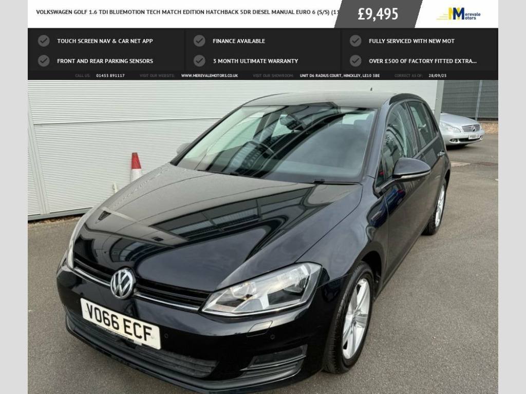 WITH ONLY TWO PREVIOUS OWNERS AND VERY LOW MILEAGE FOR ITS AGE AT JUST 37,291 MILES, THIS 2016 VOLKSWAGEN GOLF TDI MATCH EDITION PRESENTS A COMPELLING OPPORTUNITY. THIS GOLF, EQUIPPED WITH A 1.6L DIESEL ENGINE AND A FULL SERVICE HISTORY, ALSO BENEFITS FROM A FRESH SERVICE COMPLETED ON 1ST AUGUST 2025 AT 37,220 MILES, AND COMES WITH 12 MONTHS MOT. THE MATCH EDITION TRIM INCLUDES PRACTICAL FEATURES SUCH AS FRONT AND REAR PARKING SENSORS WITH PARKING ASSISTANCE, MANUAL AIR CONDITIONING, ADAPTIVE CRUISE CONTROL WITH FRONT ASSIST, RADAR SENSOR CONTROLLED DISTANCE MONITORING, CITY EMERGENCY BRAKING, AND AUTOMATIC DRIVING LIGHTS. FOR PEACE OF MIND, A 3-MONTH WARRANTY IS INCLUDED. THIS GOLF STANDS OUT WITH ITS IMPRESSIVE FUEL ECONOMY OF 71 MPG AND LOW CO2 EMISSIONS, MAKING IT AN ECONOMICAL CHOICE. FURTHERMORE, ITS LOW INSURANCE GROUP PROMISES AFFORDABLE PREMIUMS. THE EURO 6 EMISSION CLASS ENSURES COMPLIANCE WITH THE LATEST ENVIRONMENTAL STANDARDS. FINANCE IS AVAILABLE AND WE CAN BUILD A PACKAGE TO SUIT YOUR INDIVIDUAL NEEDS, JUST VISIT OUR WEBSITE AND CLICK ON APPLY FOR FINANCE TO USE THE FREE ELIGIBILITY CHECKER AND THEN SIMPLY ADD YOUR DETAILS. INCLUDED IN THE SCREEN PRICE IS AN ULTIMATE WARRANTY WHICH INCLUDES BREAKDOWN COVER AND HOME START, WHICH YOU CAN EXTEND FOR JUST A SMALL COST... ALL OUR VEHICLES ARE MECHANICALLY INSPECTED BY INDEPENDENT CONTRACTORS IN ADDITION TO EXTENSIVE BACKGROUND AND MILEAGE CHECKS PRIOR TO SALE. THIS CAR IS A CATEGORY N WHICH HAD LIGHT DAMAGE TO TWO 16in Alloy Wheels - Dover, Air Conditioning - Manual, Discover Navigation Touch-Screen Navigat, Parking Sensors - Front and Rear, Deep Black, Body-Coloured Door Mirrors with Integrat, 12V Socket - Luggage Compartment, ABS - Anti-lock Braking System with HBA , Adaptive Cruise Control ACC Including Fr, Airbags, Alarm, Automatic Coming-Leaving Home Lighting F, Automatic Post-Collision Braking System, Bag Hooks in the Luggage Compartment, Black Front Air Intake and Radiator Gril, Body Coloured Bumpers, Body Coloured Door Handles, Brake Pad Wear Indicator, Brushed Dark Silver Decorative Inserts i, Child Security Locks in the Rear Doors, Chrome Plated Air Vent Surrounds, Chrome-Plated Light Switch