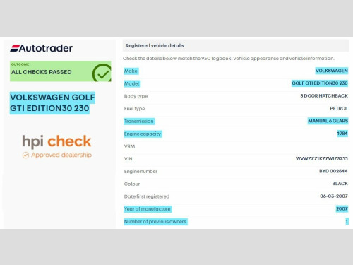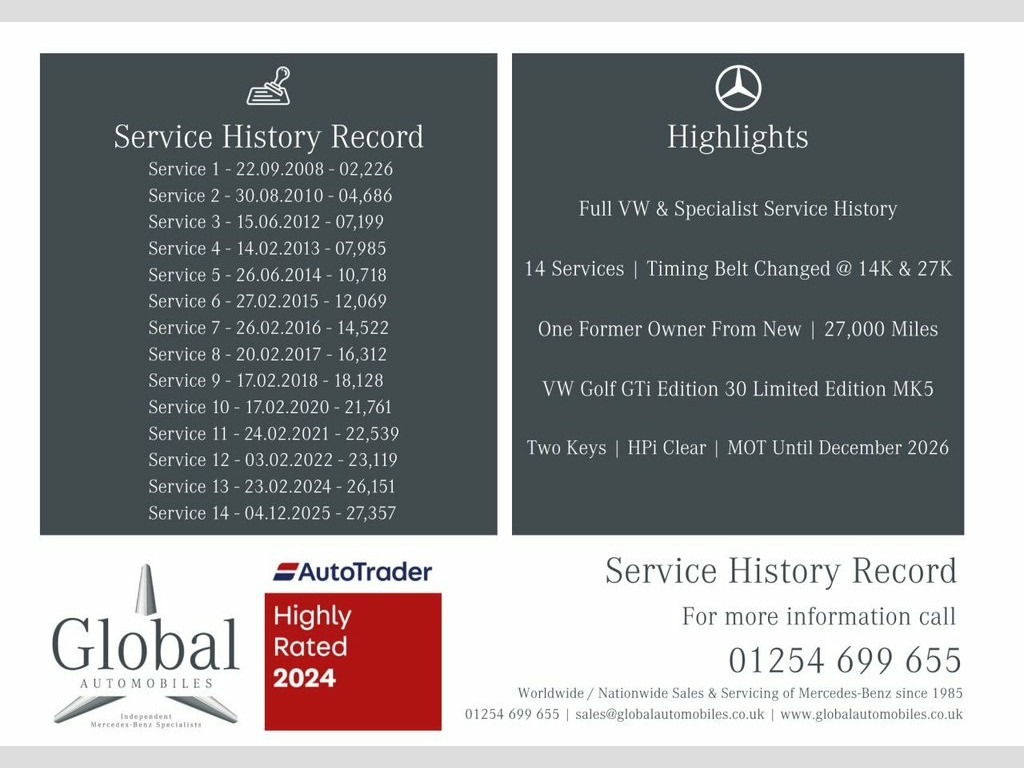 Buy with confidence from an Award Winning Independent Mercedes-Benz Specialist! We are delighted to offer our extremely rare VW Golf GTi "Edition 30" 6 Speed Manual 2.0 TFSi Petrol, finished in the highly desirable "Diamond Black Pearl". Golf GTI Edition 30 Thirty years ago, in January 1977, Volkswagen launched the Golf GTi in the UK, a car that would become a legend and establish a new class of car: the hot hatch. For 2007 the 30th anniversary of the GTI is marked by a new model – the Golf GTI Edition 30. Limited to 1,500 examples (this one being Number 0386) and benefiting from an extra 30 PS to bring the total to 230 PS, it's fitted with unique body styling and wheels as well as a bespoke interior. The Edition 30 promised to be a harder-edged GTI and a fitting tribute to 30 years of the iconic hot hatch. Originally supplied to a Dentist by Cameron's Volkswagen of Perth, this Golf GTi has been driven extremely sparingly, having only covered 27,000 miles since new. This One Former Doctor Owner from vehicle is and is supplied with its Original Manuals/Book Pack, Full VW and Specialist Service History Record, Two Keys, MOT until December 2026, HPI Clearance Certificate and a Full and current V5 Logbook. The Service History is magnificent, having been Serviced 14 times, with the all important Timing Belt Kit Service performed at 14,522 miles (2016) and 27,357 miles (2025). The Specification; Bespoke "Pescara" 18" Ed Metallic Paint, Rear Tinted Windows from B Pillar Back, Special Paint