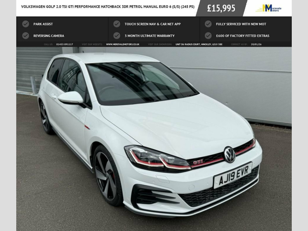 THIS VOLKSWAGEN GOLF TSI GTI PERFORMANCE OFFERS A COMPELLING PACKAGE THAT SETS IT APART. THE INCLUSION OF PARK ASSIST, ELECTRIC FRONT WINDOWS, EASY ENTRY SLIDING SEATS, AUTOMATIC DRIVING LIGHTS VIA A DUSK SENSOR, AND ADAPTIVE CRUISE CONTROL DEMONSTRATES A HIGHER LEVEL OF SPECIFICATION COMPARED TO MANY SIMILAR VEHICLES. FURTHERMORE, THE 12 MONTHS MOT PROVIDED ON PURCHASE AND A 3 MONTH WARRANTY OFFER ADDED PEACE OF MIND FOR THE NEW OWNER, ENSURING YOU CAN ENJOY THIS LOW MILEAGE, SINGLE OWNER VEHICLE WITH CONFIDENCE. FINANCE IS AVAILABLE AND WE CAN BUILD A PACKAGE TO SUIT YOUR INDIVIDUAL NEEDS, JUST VISIT OUR WEBSITE AND CLICK ON APPLY FOR FINANCE TO USE THE FREE ELIGIBILITY CHECKER AND THEN SIMPLY ADD YOUR DETAILS. INCLUDED IN THE SCREEN PRICE IS AN ULTIMATE WARRANTY WHICH INCLUDES BREAKDOWN COVER AND HOME START, WHICH YOU CAN EXTEND FOR JUST A SMALL COST... ALL OUR VEHICLES ARE MECHANICALLY INSPECTED BY INDEPENDENT CONTRACTORS IN ADDITION TO EXTENSIVE BACKGROUND AND MILEAGE CHECKS PRIOR TO SALE. THIS CAR IS A CATEGORY S WHICH HAD LIGHT DAMAGE TO THE FRONT WING PICTURES OF WHICH CAN BE REQUESTED, ALL INSPECTIONS ARE WELCOME, SUPPLIED WITH ALL THE ORIGINAL HANDBOOKS AND TWO KEYS. PLEASE CALL 01455891117 TO ARRANGE A VIEWING AND A TEST DRIVE, YOUR PART EXCHANGE WILL BE MOST WELCOME. 18in Alloy Wheels - Parker, Climate Control, Park Assist, Discover Navigation Touch-Screen Navigat, Automatic Coming-Leaving Home Lighting F, Parking Sensors - Front and Rear, Car-Net Security and Service including e, Brake Calipers - Red with GTI Logo, Pure White, Jacara Cloth - Titan Black-Red, 12V Socket - Luggage Compartment, ABS - Anti-Lock Braking System with HBA , Active Info Display, Adaptive Cruise Control, Airbags, Alarm with Interior Protection, Ambient Lighting, Ambient Lighting Pack, Anti-Tramp Function, Automatic Post-Collision Braking System, Bag Hooks in the Luggage Compartment x2, Black Rooflining, Body Coloured Bumpers, Body Coloured Door Handles, Body-Coloured Door Mirrors