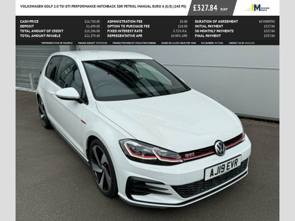 THIS VOLKSWAGEN GOLF TSI GTI PERFORMANCE OFFERS A COMPELLING PACKAGE THAT SETS IT APART. THE INCLUSION OF PARK ASSIST, ELECTRIC FRONT WINDOWS, EASY ENTRY SLIDING SEATS, AUTOMATIC DRIVING LIGHTS VIA A DUSK SENSOR, AND ADAPTIVE CRUISE CONTROL DEMONSTRATES A HIGHER LEVEL OF SPECIFICATION COMPARED TO MANY SIMILAR VEHICLES. FURTHERMORE, THE 12 MONTHS MOT PROVIDED ON PURCHASE AND A 3 MONTH WARRANTY OFFER ADDED PEACE OF MIND FOR THE NEW OWNER, ENSURING YOU CAN ENJOY THIS LOW MILEAGE, SINGLE OWNER VEHICLE WITH CONFIDENCE. FINANCE IS AVAILABLE AND WE CAN BUILD A PACKAGE TO SUIT YOUR INDIVIDUAL NEEDS, JUST VISIT OUR WEBSITE AND CLICK ON APPLY FOR FINANCE TO USE THE FREE ELIGIBILITY CHECKER AND THEN SIMPLY ADD YOUR DETAILS. INCLUDED IN THE SCREEN PRICE IS AN ULTIMATE WARRANTY WHICH INCLUDES BREAKDOWN COVER AND HOME START, WHICH YOU CAN EXTEND FOR JUST A SMALL COST... ALL OUR VEHICLES ARE MECHANICALLY INSPECTED BY INDEPENDENT CONTRACTORS IN ADDITION TO EXTENSIVE BACKGROUND AND MILEAGE CHECKS PRIOR TO SALE. THIS CAR IS A CATEGORY N WHICH HAD LIGHT DAMAGE TO THE FRONT WING PICTURES OF WHICH CAN BE REQUESTED, ALL INSPECTIONS ARE WELCOME, SUPPLIED WITH ALL THE ORIGINAL HANDBOOKS AND TWO KEYS. PLEASE CALL 01455891117 TO ARRANGE A VIEWING AND A TEST DRIVE, YOUR PART EXCHANGE WILL BE MOST WELCOME. 18in Alloy Wheels - Parker, Climate Control, Park Assist, Discover Navigation Touch-Screen Navigat, Automatic Coming-Leaving Home Lighting F, Parking Sensors - Front and Rear, Car-Net Security and Service including e, Brake Calipers - Red with GTI Logo, Pure White, Jacara Cloth - Titan Black-Red, 12V Socket - Luggage Compartment, ABS - Anti-Lock Braking System with HBA , Active Info Display, Adaptive Cruise Control, Airbags, Alarm with Interior Protection, Ambient Lighting, Ambient Lighting Pack, Anti-Tramp Function, Automatic Post-Collision Braking System, Bag Hooks in the Luggage Compartment x2, Black Rooflining, Body Coloured Bumpers, Body Coloured Door Handles, Body-Coloured Door Mirrors
