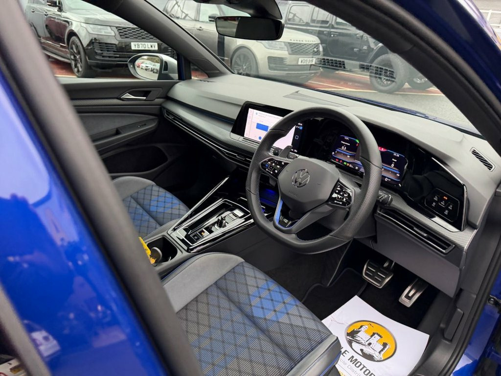 R 4MOTION 320PS DSG Auto 5dr. December 2023 registered Lapis Blue Premium Metallic with Grey & Blue leather, chequer & Suede sport seats, Glass sunroof, 19-inch Black alloys with Boue calipers, Radar adaptive cruise control, Multifunction steering wheel with R Driving mode (Featuring switchable driving dynamics, steering, drive, engine sound), Interior ambient multicolour illumination, SKeyless Entry & drive, Illuminated front grill, Smart climate control App Connect, Navigation, Comfort light, IQ LED Matrix Headlights with Dynamic light assist & dynamic cornering Plus, much more. Beautiful Golf R cover only 9750 miles with VW service history plus recent VW service. 12V Socket - Centre Console, 12V Socket - Luggage Compartment, 18in Alloy Wheels - Jerez, 19in Alloy Wheels - Estoril Black, ABS - Anti-lock Braking System with HBA , Adaptive Cruise Control, Air Conditioning - 3 Zone Electronic Cli, Airbags, Alarm with Interior Protection with Deac, Ambient Lighting, App-Connect, Automatic Coming-Leaving Home Lighting F, Automatic Post-Collision Braking System, Bag Hooks in Luggage Compartment - Left , Black Metal Chrome Decorative Inserts in, Body Coloured Bumpers, Body Coloured Door Handles, Brake Calipers - Blue, Car2X - Intelligent Vehicle Networking, Carpet Mats - Front and Rear, Central Locking - Remote with 2 Remote K, Centre Console in High Gloss Bl