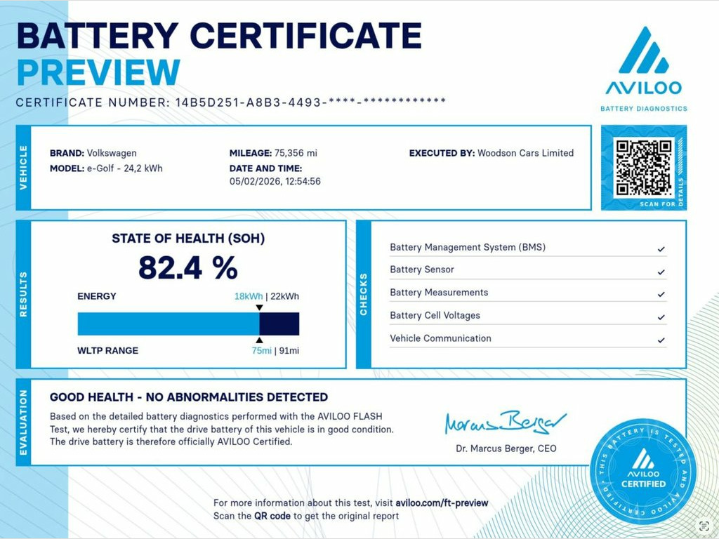 Finance Soft Search Pre Approval. This Volkswagen eGolf Electric 5 Door Hatchback Automatic (115bhp) has covered 75000 miles in cream heated leather interior. This vehicle has 4 VW service records.. EV Battery test, sat nav, bluetooth, heated seats, xenon lights, apple car play, reverse camera, isofix + much more. *MAIN DEALER PART EXCHANGE* Warranty included. VOSA Mileage History Checked and HPI Clear. Vehicle has received an independent health check with report ++ Any inspection is more than welcome ++ Nationwide Delivery Service Available ++ Credit/Debit Card Accepted ++ Approved Finance Partner with Consumer Credit Licence ++ Call/Message anytime including evenings ++ Facetime/Video Call Available Around Your Schedule ++ Warranty Included. Late Night Appointments Available. Woodson Cars, Manchester. 01618509848 (For Sat Nav use Postcode M44 5AH) Rear View Camera, Extended Warranty +2 Years, Winter Pack icw Leather Upholstery, Vienna Leather - Marrakesh, 12V Socket, 12V Socket - Luggage Compartment, 16in Alloy Wheels - Tilleve, 2 Zone Electronic Climate Control with A, ABS - Anti-Lock Braking System, ASR - Anti Slip Regulation, Air Vent Surrounds - Chrome Effect, Airbags - Curtain Front, Airbags - Curtain Rear, Airbags - Driver, Airbags - Drivers Knee, Airbags - Front Passenger, Airbags - Front Passenger with Deactivat, Airbags - Front Seat Side Impact, Alarm with Interior Protection, Ambient Lighting - Light Blue, Android Auto, Anti-Theft Wheel Bolts, Apple CarPlay, Armrest - Front Centre with Storage Comp, Automatic Dimming Rear Vi