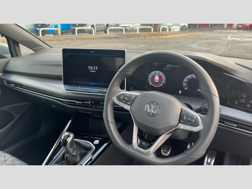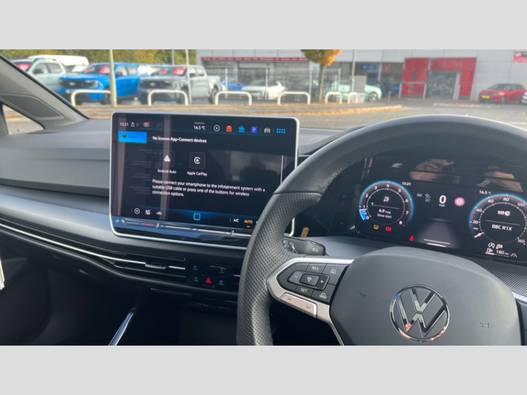 Volkswagen Golf 1.5 TSI 150 R-Line 5dr Activated carbon canister, Adaptive cruise control (ACC), Advanced driver attention and drowsiness monitor, Dynamic road sign display, Dynamic steering, E-Sim card for online connectivity, eCall emergency call system, Multi-color Digital cockpit pro, selection of different info profile possible, Multifunction front facing camera for distance control, Navigation system, Oncoming vehicle braking when turning including swerve support, Preparation for light assist system, Speed limiter, Speedo, rev counter, electronic odometer, trip, service interval display, exterior temperature and fuel gauge, Traffic jam assist, Voice enhancer and voice control, Warning signal and warning light for front and rear seatbelts not fastened, We connect plus preparation, We connect preparation, Wireless app connect, Petrol Particulate Filter, Start-stop system with battery regeneration (recuperation - energy recovery during braking), XDS electronic differential lock for improved traction and handling, 2 USB C ports in front, 2 USB charging sockets on the centre console in the rear charging capacity upto 45W, Comfort telephony + wireless charging, without wireless aerial connection, Digital radio reception (DAB), Diversity antenna for FM reception, Gaming platform via car app, Infotainment system with 12.9" display, Mobile phone interface with inductive charging feature, 3rd brake light, Auto headlights, Automatic headlamp activation with Coming home and Leaving home feature, Body colored bumpers in R-Line style, Body colour door handles, Exterior ambient lighting with illuminated door handles, Exterior mirrors convex on the left and aspherical on the right, Front and rear electric windows, Heat insulating windshield made of laminated glass, LED daytime running lights, Rear exhaust tailpipe, Rear fog light on one side and reversing lights on both sides, Rear side wing doors, Rear windscreen washer and wiper with interval delay, Remote electrically foldable door mirrors, puddle lights and reverse activated passenger's door mirror, Welcome light with surround lighting, 12V socket in front centre console, 12V socket in luggage compartment, 3 rear head restraints, 3 seat bench in 2nd row, Ambient lighting with 30 colour including LED light unit in front footwell with selectable light colour, Brushed stainless steel pedals, Carpet mats, front and rear, Chrome plated radiator grille inserts, air vent surrounds and light switch surrounds, Front centre armrest, Integrated front head restraints, ISOFIX anchors for child seats on outer rear bench seats and on front passanger seat compatible for i-Size, Leather gearshift handle, Luggage compartment lighting, Premium sports seats in front, Rear cupholder and loadthough, Single front passenger seat, Soul black instrument panel, Split folding backrest with centre armrest and unsplit rear seat bench, Storm grey roof lining, Sun visors with illuminated vanity mirrors, 3 point height adj front seatbelts + pretensioners, 3 rear three point seatbelts, ABS, Autonomous emergency braking front assist with pedestrian and cyclist monitoring, Child locks on rear doors, Driver and front passenger airbag with front passenger airbag deactivation, Electronic parking brake with auto hold, ESC (Electronic Stability Control), Extended pedestrian protection measures, Rear disc brakes, Two tone horn, Tyre pressure loss indicator, Volkswagen roadside assistance, Anti theft wheel bolts, Preparation for alcohol interlock, Decorative inserts carbon grey for dashboard and front door trim panels