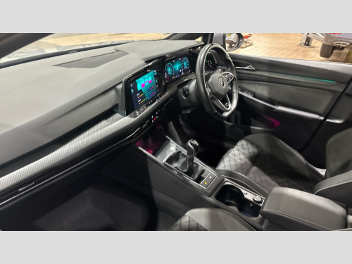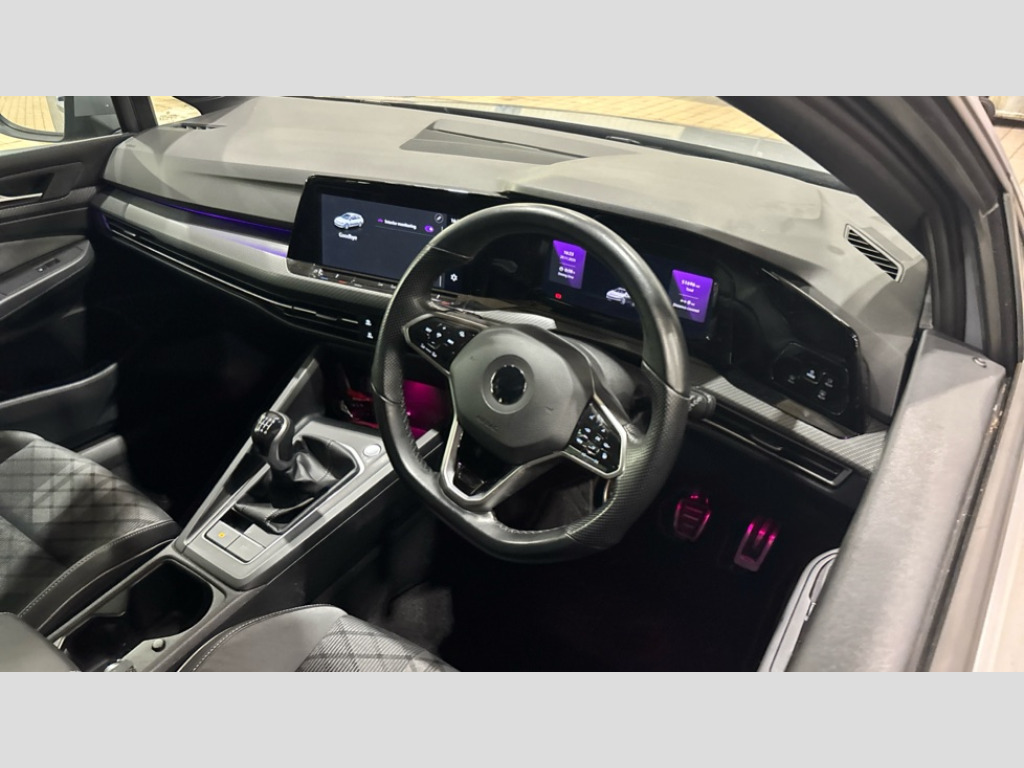 Volkswagen Golf 1.5 TSI 150 R-Line 5dr Active Info Display Digital Cockpit Pro - 10.25" high resolution TFT dash display screen with customisable menus and information, Adaptive cruise control (ACC) with speed limiter and front assist (reacting to vehicles pedestrians and cyclists), Car2X communication, Driver alert system, Driver profile selection, Dynamic road sign display, eCall - Emergency call service for SOS calls to emergency response, Lane assist, Mobile phone interface with wireless inductive charging function, Progressive steering, Speedo, rev counter, electronic odometer, trip, service interval display, exterior temperature and fuel gauge, Start/Stop function, USB-C ports in the front and rear centre console with increased charging performance, Warning buzzer and light for front seatbelts unfastened, Wireless app connect, XDS electronic differential lock for improved traction and handling, Premium USB cable in choice of either Apple or Android smartphone compatibility, Ambient lighting, exterior illuminated styling elements at the sides, Auto dimming rear view mirror, Auto headlights, Automatic headlamp activation with Coming home and Leaving home feature, Black roof rails, Body colour door handles, Body colour door mirrors with integrated indicators, Body colour rear roof spoiler, Dynamic headlight range control, Electrically heated and adjustable door mirrors with memory feature, Front and rear electric windows, Heat insulating glass windscreen, Heated rear windscreen, High level 3rd brake light, Highway light, LED daytime running lights, LED headlights incorporating turn signals, LED License plate illumination, R Line body coloured bumpers, Rain sensor, Rear fog light on one side and reversing lights on both sides, Rear lights incorporating LED technology, Rear side wing doors, Rear tinted glass 65% light absorbing from B pillar backwards, Rear windscreen washer and wiper with interval delay, Welcome light, 12V socket in front centre console, 12V socket in luggage compartment, 3 rear head restraints, 3 seat bench in 2nd row, Ambient lighting - Customisable 30 colour ambient lighting, Black roof lining, Brushed stainless steel pedals, Chrome plated surround to electric mirror button, window switch and air vent surrounds, Drivers and front passengers sun visors with vanity mirrors, Front + rear carpet mats, Front centre armrest with storage compartment, Front cupholders x 2, Front reading lights x 2 incorporating LED technology, Front seat lumbar support adjuster, Front sports seats, Glovebox, Height adjustable front seats, Height and reach adjustable steering wheel, Isofix child seat preparation for 2 rear child seats and front passenger seat, Luggage compartment lighting, R Line door and side trim panel, R Line front seats integrated head restraints, R-Line leather wrapped multi function sports heated steering wheel, Removable luggage compartment cover, Sardegna cloth upholstery with front and outer rear seats Art Velour inner sides of bolsters, Single front passenger seat, Split folding backrest with centre armrest and unsplit rear seat bench, Woven fabric storage compartments in front and rear doors, 3 point height adj front seatbelts + pretensioners, 3 rear three point seatbelts, ABS, Driver and front passenger airbag with front passenger airbag deactivation, Drivers and front passengers safety optimised head restraints, Electronic parking brake with auto hold, ESC (Electronic Stability Control), Extended pedestrian protection measures, Front and rear passengers curtain airbag system including front side airbags, Front disc brakes, Rear disc brakes, Rear door child safety locks, Two tone horn, Tyre pressure monitoring system, Alarm with interior protection and deactivation via infotainment system, Electronic engine immobiliser, Remote central locking with SAFELOCK and Start/Sop button (Keyless Go), Carbon grey decorative inserts in dash and front door trim panels, High gloss black centre console, Soul dashboard