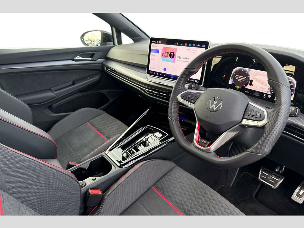 Tilting and Sliding Panoramic Sunroof, Head Up Display, 19in Alloy Wheels - Warmenau Black, Exterior Styling Package Black Style with Matrix LED Headlights, Tilting and sliding panoramic sunroof with 2X front and 2X rear LED reading lights, Head up Display, Black exterior Styling package with Matrix LED headlights - Golf, 19" Warmenau black alloy wheels, Art velours cloth - Soul black/Tornado red with premium sport front seats, Front and rear electric windows, Heat insulating windshield made of laminated glass, Rain sensor, Rear windscreen washer and wiper with interval delay, Body colour door handles, Bumpers in "Clubsport", air intake in honeycomb structure, Illuminated lighting animation with wake up/goodbye scenario, Nameplate 'GTI' set, Rear side wing doors, 3rd brake light, Automatic headlamp activation with Coming home and Leaving home feature, Front fog lamps and cornering light, LED separate daytime running light, Rear fog light on one side and reversing lights on both sides, Welcome light with surround lighting, ABS, Autonomous emergency braking front assist with pedestrian and cyclist monitoring, Electronic parking brake with auto hold, ESC (Electronic Stability Control), Front red brake calipers with GTI logo, Hill start assist, Rear disc brakes, Volkswagen roadside assistance, Activated carbon canister, Adaptive cruise control (ACC), Advanced driver attention and drowsiness monitor, Dynamic road sign display, Multifunction front facing camera for distance control, Oncoming vehicle braking when turning including swerve support, Side assist blind spot lane change system, rear traffic alert and exit warning system, Speed limiter, Auto dimming rear view mirror, Exterior mirrors convex on the left and aspherical on the right, Remote electrically foldable door mirrors, puddle lights and reverse activated passenger's door mirror, 3 point height adj front seatbelts + pretensioners, 3 rear three point seatbelts, Child locks on rear doors, Driver and front passenger airbag with front passenger airbag deactivation, Extended pedestrian protection measures, Two tone horn, Tyre pressure loss indicator, Front + rear black carpet mats, Air care climatronic 3 Zone automatic climate control with rear air conditioning control panel, 12V socket in front centre console, 12V socket in luggage compartment, Aluminium gearshift handle, Brushed stainless steel pedals, Chrome plated radiator grille inserts, air vent surrounds and light switch surrounds, Front centre armrest, Rear cupholder and loadthough, Soul black instrument panel, Soul black roof lining, 30 colour ambient lighting, illuminated center console storage compartment in front, Entry lights, Luggage compartment lighting, Front differential lock, Sun visors with illuminated vanity mirrors, E-Sim card for online connectivity, eCall emergency call system, We connect preparation, Wireless app connect, 2 USB C ports in front, 2 USB charging sockets on the centre console in the rear charging capacity upto 45W, Digital radio reception (DAB), Diversity antenna for FM reception, Gaming platform via car app, Infotainment system with 12.9" display, Mobile phone interface with inductive charging feature, Multi-color Digital cockpit pro, selection of different info profile possible, Navigation system, Speedo, rev counter, electronic odometer, trip, service interval display, exterior temperature and fuel gauge, Traffic jam assist, Voice enhancer and voice control, Warning signal and warning light for front and rear seatbelts not fastened, We connect plus preparation, Petrol Particulate Filter, Start-stop system with battery regeneration (recuperation - energy recovery during braking), Decorative inserts carbon grey for dashboard and front door trim panels, 3 rear head restraints, 3 seat bench in 2nd row, ISOFIX anchors for child seats on outer rear bench seats and on front passanger seat compatible for i-Size, Single front passenger seat, Split folding backrest with centre armrest and unsplit rear seat bench, Driver assistance pack - Golf Estate/Hatchback Auto, Technology park and comfort pro package - Golf Hatchback, Anti theft wheel bolts, Pre