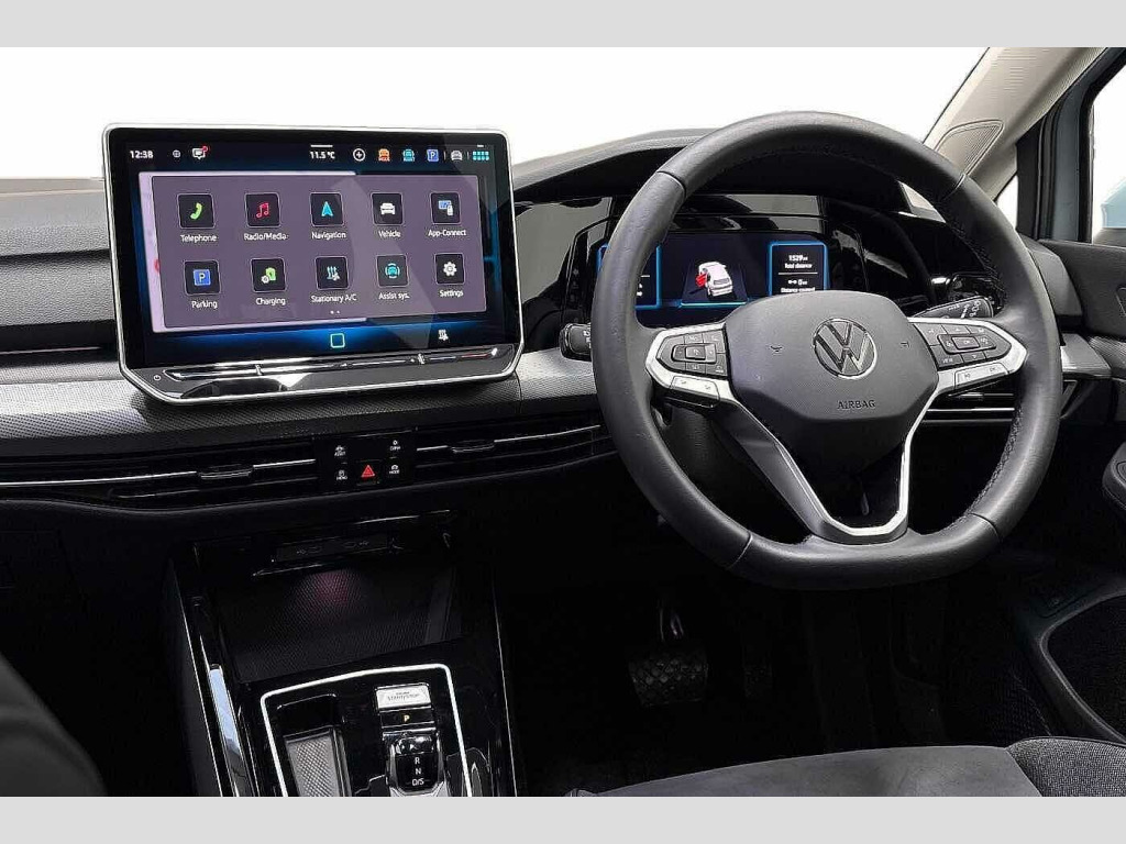 Winter Package, Winter package - Golf DSG Estate/Hatchback, Metallic - Crystal Ice Blue, Art velours cloth - Soul black, Front and rear electric windows, Heat insulating windshield made of laminated glass, Rear windscreen washer and wiper with interval delay, Body colour bumpers, Body colour door handles, Chrome trimmed front air intake surrounds, Chrome trims on the side window bottom, Rear exhaust tailpipe, Rear side wing doors, 3rd brake light, Automatic headlamp activation with Coming home and Leaving home feature, LED separate daytime running light, Rear fog light on one side and reversing lights on both sides, Welcome light with surround lighting, ABS, Autonomous emergency braking front assist with pedestrian and cyclist monitoring, Electronic parking brake with auto hold, ESC (Electronic Stability Control), Hill start assist, Rear disc brakes, Volkswagen roadside assistance, Activated carbon canister, Adaptive cruise control (ACC), Advanced driver attention and drowsiness monitor, Dynamic road sign display, Multifunction front facing camera for distance control, Oncoming vehicle braking when turning including swerve support, Side assist blind spot lane change system, rear traffic alert and exit warning system, Speed limiter, Body colour door mirrors, Exterior mirrors convex on the left and aspherical on the right, Remote electrically foldable door mirrors, puddle lights and reverse activated passenger's door mirror, 3 point height adj front seatbelts + pretensioners, 3 rear three point seatbelts, Child locks on rear doors, Driver and front passenger airbag with front passenger airbag deactivation, Extended pedestrian protection measures, Two tone horn, Tyre pressure loss indicator, Front + rear black carpet mats, Air care climatronic 3 Zone automatic climate control with rear air conditioning control panel, 12V socket in front centre console, 12V socket in luggage compartment, Chrome plated radiator grille inserts, air vent surrounds and light switch surrounds, Front centre armrest, Plastic gear knob, Rear cupholder and loadthough, Soul black instrument panel, Standard pedal cluster, Storm grey roof lining, Ambient lighting with 30 colour including LED light unit in front footwell with selectable light colour, Luggage compartment lighting, XDS electronic differential lock for improved traction and handling, Sun visors with illuminated vanity mirrors, E-Sim card for online connectivity, eCall emergency call system, We connect preparation, Wireless app connect, 2 USB C ports in front, 2 USB charging sockets on the centre console in the rear charging capacity upto 45W, 6 Speakers - 4 in front and 2 in rear with central speaker, Digital radio reception (DAB), Diversity antenna for FM reception, Gaming platform via car app, Infotainment system with 12.9" display, Mobile phone interface with inductive charging feature, Multi-color Digital cockpit pro, selection of different info profile possible, Navigation system, Speedo, rev counter, electronic odometer, trip, service interval display, exterior temperature and fuel gauge, Traffic jam assist, Voice enhancer and voice control, Warning signal and warning light for front and rear seatbelts not fastened, We connect plus preparation, Hybrid propulsion system, Start-stop system with battery regeneration (recuperation - energy recovery during braking), New brushed dark metal decorative inserts for dashboard and front door panels, 3 rear head restraints, 3 seat bench in 2nd row, ISOFIX anchors for child seats on outer rear bench seats and on front passanger seat compatible for i-Size, Single front passenger seat, Split folding backrest with centre armrest and unsplit rear seat bench, Driver assistance pack - Golf Estate/Hatchback Auto, Anti theft wheel bolts, Preparation for alcohol interlock, Charging cable Mode 2 Type 2 (10A), Charging cable mode 3, type 2 32 A, Tool kit for tyre mobility set, Tyre mobility kit Includes 12V compressor and tyre sealant