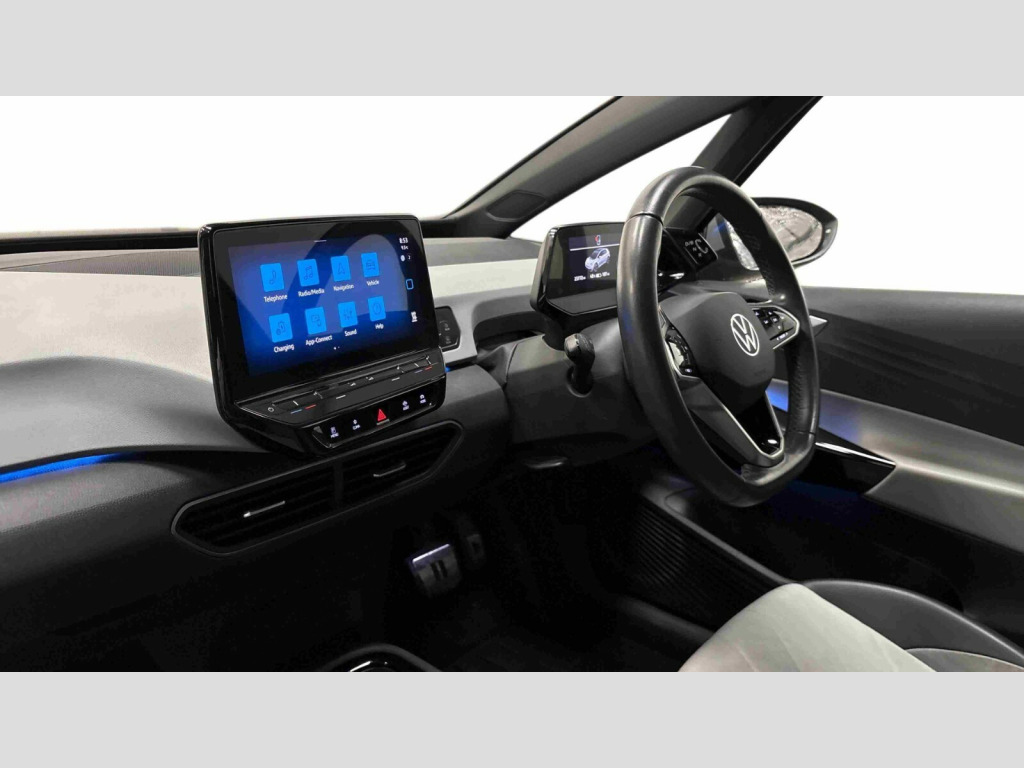 Volkswagen Id.3 107KW Family Pro 58kWh 5dr Auto 10" touch screen infotainment system, 5.3" Digital dashboard display, Adaptive cruise control including Front Assist, radar sensor controlled distance monitoring system, City emergency braking system,speed limiter, BLIS (Blind spot information system), Bluetooth connectivity, Car2X technology, Driver alert system, Driver profile selection with personalisation, E-call, Front and rear parking sensors, ID. Light, Lane assist, Natural voice control, Power assisted speed sensitive steering, Remote tailgate unlocking, Security and service (SOS buttons), Trip computer, Wireless app connect, Exterior e-sound, Mode 3 32-amp / 7.2kW charging cable for charging at public charge points, DAB Digital radio, Sound system, Touch control, Body colour door handles, Body coloured bumpers, Body coloured door mirrors with intergrated indicators, Front and rear electric windows, Heated rear window, LED 3rd brake lamp, Rear side wing doors, Rear wiper, Separate LED daytime running lights which also perform the indicator function, Variable front intermittent wipers, 3 seat bench in 2nd row, Flow design/Art velour microfleece cloth upholstery, Folding rear seats, Front headrests, Isofix child seat anchor points, Leather steering wheel, Multi-function steering wheel, Pause and play pedals, Pockets and smartphone pockets in seats, Reach + rake adjustable steering column, Rear headrests, Single front passenger seat, Style seats, Assistance pack - ID.3, Comfort plus pack - ID.3, Design plus pack - ID.3, Infotainment pack with wireless smartphone charging - ID.3, Interior style pack - ID.3, NCAP pack - ID.3, 3x3 point rear seat belts, Anti-lock braking system (ABS), Child locks on rear doors, Driver and passenger airbags, Electronic parking brake with auto hold, Electronic Stability Programme (ESP), Front and rear curtain airbags, Front passenger airbag deactivation, Side airbags, Traction control with on/off button, Tyre pressure monitor, Alarm, Immobiliser, Remote central locking, Tool kit, Tyre repair kit