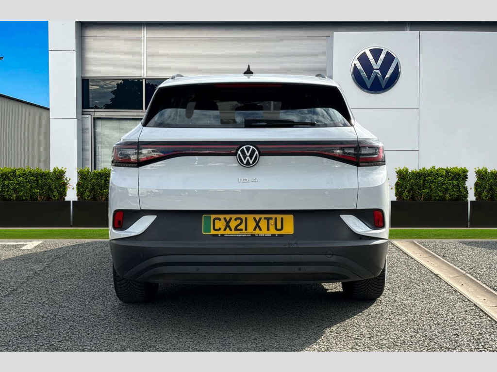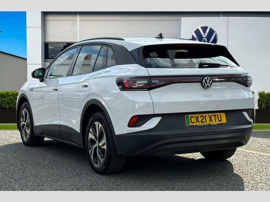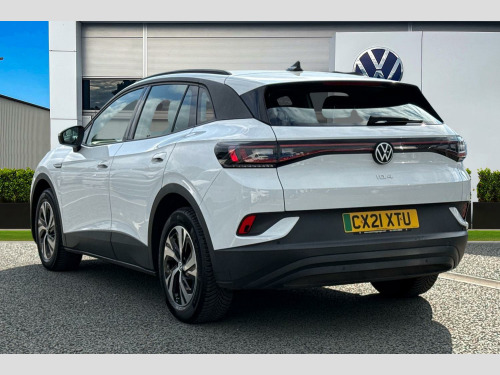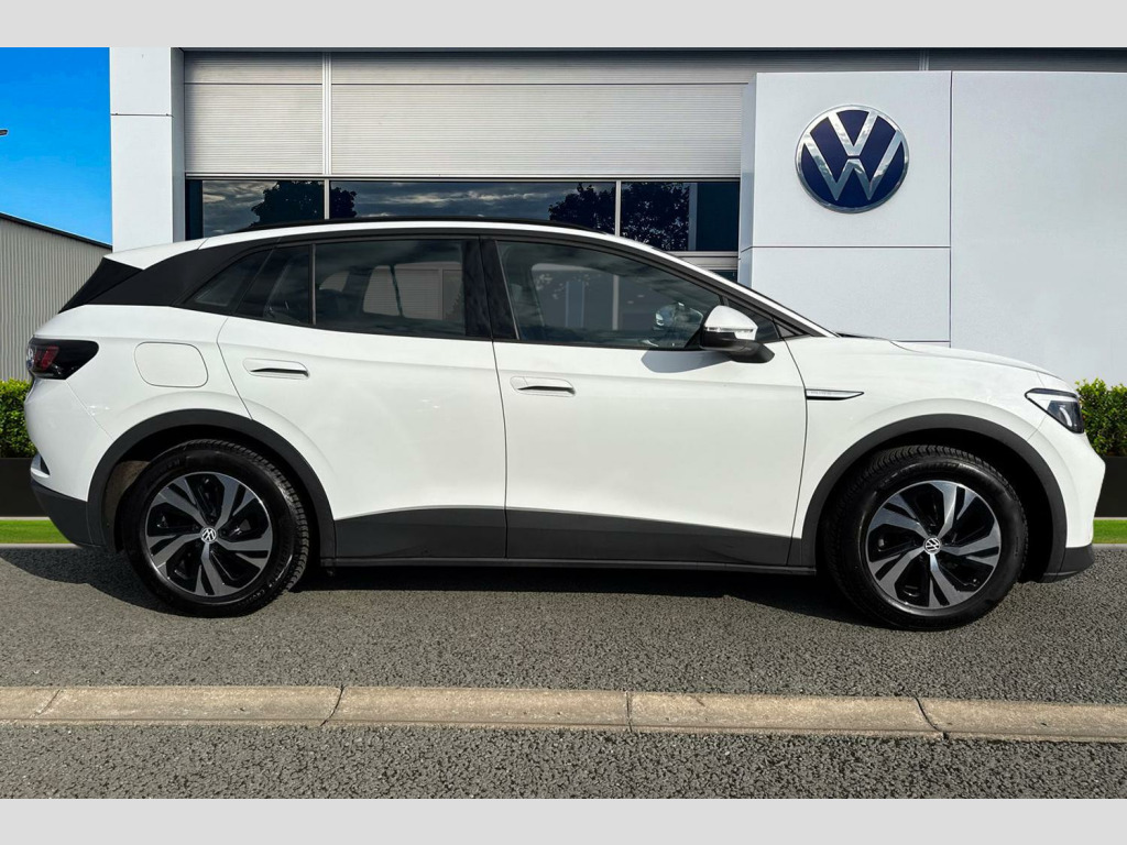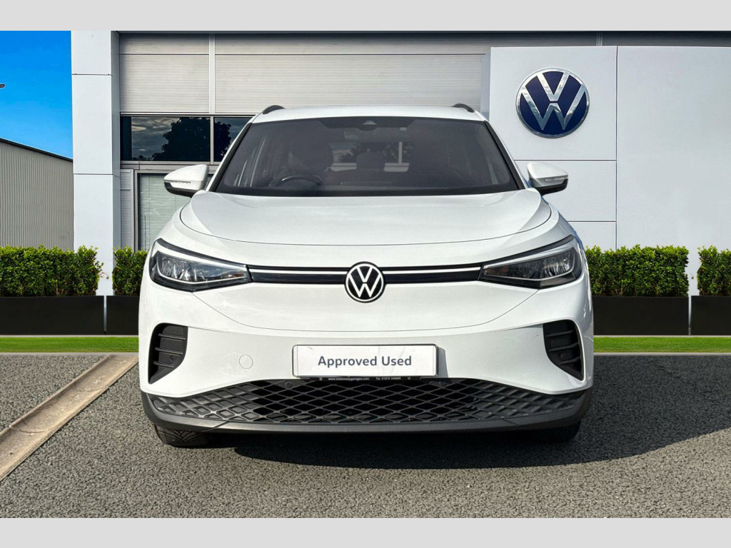 *Range depicts brand new model. Current maximum range may differ in line with battery depreciation. 18in Alloy Wheels - Falun, 18" Falun alloy wheels, Metallic - Glacier white, Art velours microfleece cloth - Platinum grey/Dusty grey, Acoustic glazing rear window and side windows darkened at the rear, Front and rear electric windows, Heated clear glass windshield, Heated rear window, Heated washer nozzles in front, Laminated safety glass windshield, heated (w/o wires), infrared-reflecting windshield, sound-insulating, Rain sensor, Body colour door handles, Body coloured bumpers, External USB type C socket and charging sockets, LED headlights with automatic driving light switching, LED rear combination lamp, Anti-lock braking system (ABS), Electronic parking brake with auto hold, Electronic Stability Programme (ESP), Front disc brakes, Traction control, Adaptive cruise control, Driver alert system, Driver profile selection, Dynamic road sign display, Dynamic steering, Emergency call control unit with eCall, Multifunction camera, Park distance control in front and rear, Automatic dimming interior rear view mirror, Body coloured door mirrors with intergrated indicators, Electrically heated and adjustable door mirrors, 3x3 point rear seat belts, Driver and front passenger airbag with front passenger airbag deactivation, First aid kit with warning triangle and safety vest, Proactive passenger protection system in combination with front assist, Seat belt reminder (Japan design), Seatbelt tensioners in front and rear outside, pyrotechnic belt end fitting tensioners at the front, Side airbag in front with curtain airbag and interaction airbag in front, Tyre pressure monitor, Front + rear carpet mats, Air Care climatronic 2 zone automatic climate control with combined activated carbon filter and pre-trip climatization, Electric auxiliary air heater, 2 USB-C ports in the front, 2 USB-C charging sockets on the center console in the rear, Art Velours microfleece cloth upholstery, Center console and armrests in the front seats, Heated steering wheel, Leather wrapped multifunction steering wheel with decorative aluminum inserts, Play and Pause brake and accelerator pedals, Pockets and smartphone pockets in seats, Reach + rake adjustable steering column, Storage compartments in driver and front passenger, Variable center console with changeable inserts for cup holders and storage compartments, 30 colour ambient lighting, Sun visors with illuminated vanity mirrors, Natural voice control, Online service, with OCU, with head unit coding, without engine immobilizer interconnection, Telephone interface comfort with inductive charging function, We Charge Go access, We Connect ID app, Wireless app connect, DAB Digital radio, Radio, Soundsystem of six loudspeakers with 140 watt output with two full range speakers in the rear doors and 2 way speaker system installed in front area, Touch control, Car2X high variant, Remote tailgate unlocking, 10" Navigation display incl. App connect and digital connectivity, 5.3" Digital dashboard display, BLIS (Blind spot information system), Comfort telephony with LTE and wireless charging, Discover Pro navigation system incl. automatic charging stop planning, Hand brake/low brake fluid level warning light and inscription, ID. Light, Trip computer, Exterior e-sound, Standard electronic engine sound actuator, Comfort dashboard, Asymmetric split folding rear seat backrest with load through hatch and center armrest, 2 beverage holders, Child seat anchor for child seat system i-Size, 2x top tether and child seat anchor in front on front passenger side, Drivers and front passengers seat height adjustment, Front headrests, Three rear head restraints, Driving assistance pack - ID.4, Anti-theft alarm system with interior monitoring, backup horn, and towing protection, Immobiliser, Keyless opening system Keyless start, Remote central locking, Tool kit, Tyre mobility kit