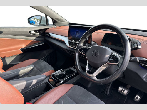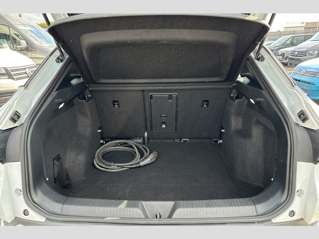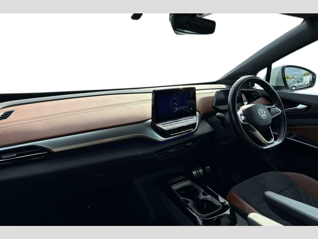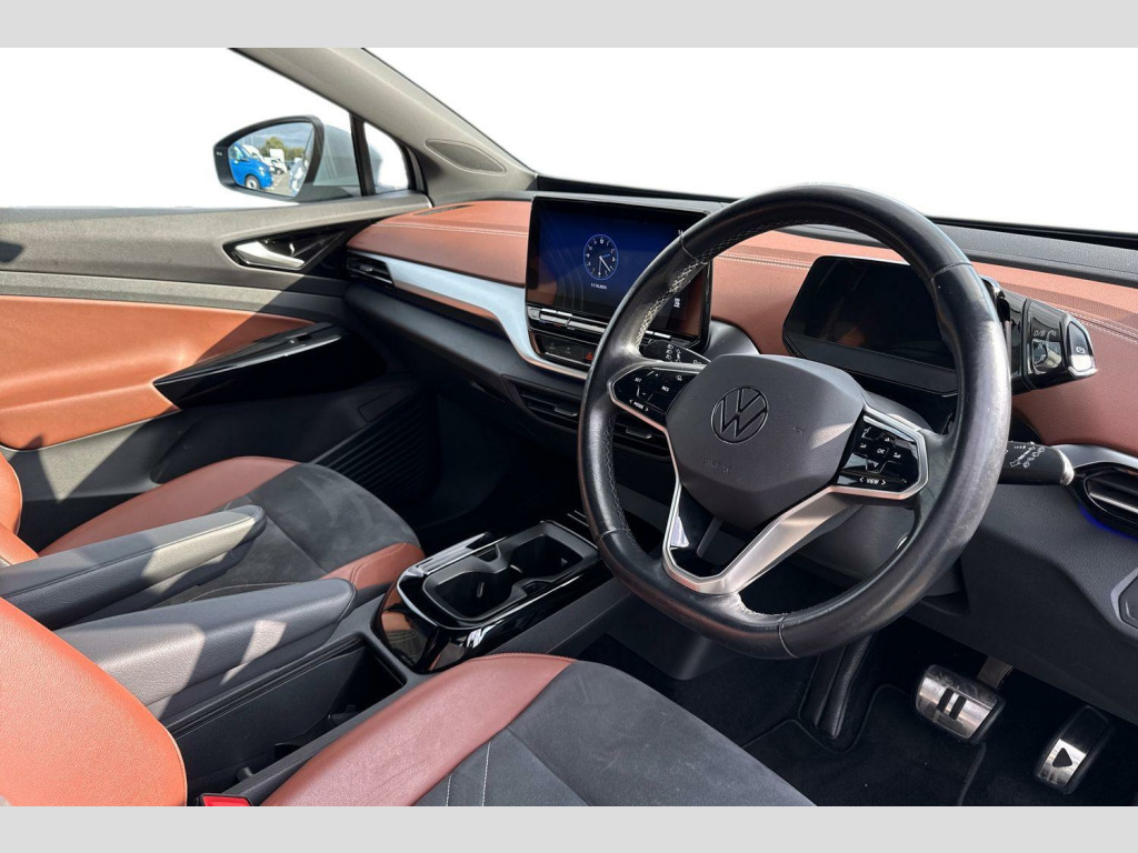 The exterior is finished in a Glacier White paintwork, which is complimented by the optionally-fitted 18in Falun wheels to the side. This ID.4 comes with a range of features on offer such as the LED headlights that keep the roads well lit, a set of roof rails, front and rear parking sensors that assist with maneuvering, and a variety of driver assistance systems such as adaptive cruise control and front assist.