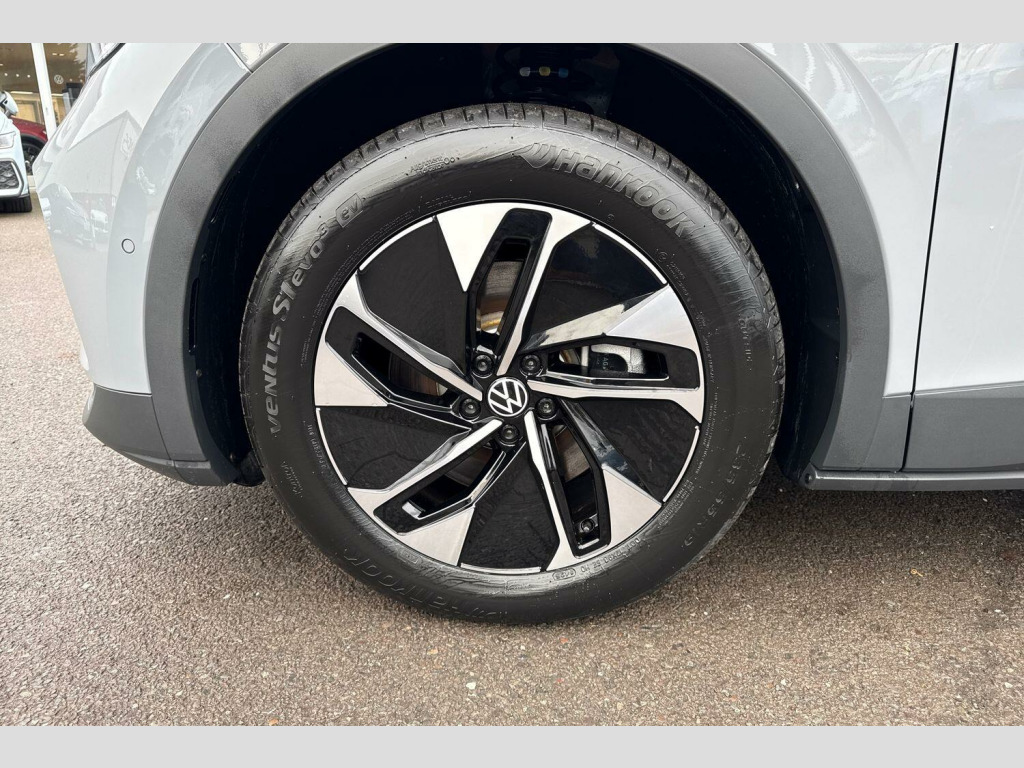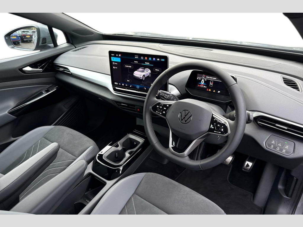 The exterior is finished in the 'Moonstone Grey' paintwork, which is complimented by the 19in Hamar alloy wheels to the side. This ID.4 comes with a range of features on offer such as the Matrix LED headlights that keep the roads well lit in low light conditions, rear tinted windows for passenger privacy, keyless entry and electric tailgate for convenient accessibility, climate windscreen that assists defrosting and prevents fogging, and parking sensors that assist with maneuvering alongside the rear view camera.