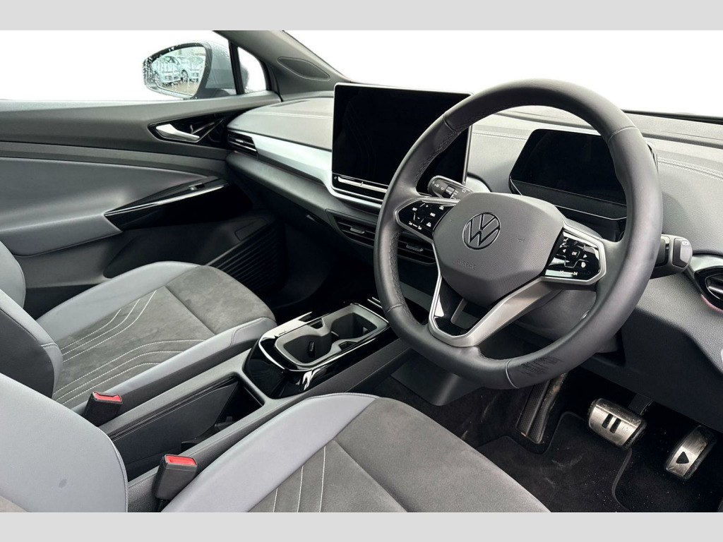 The exterior, which is finished in the 'Moonstone Grey' paintwork, comes with a range of features on offer. To the front of the vehicle you'll find the LED headlights that keep the roads well lit, and to the side the rear tinted windows for passenger privacy and the 19in Hamar alloy wheels. For added convenience this ID.4 also features keyless access and starting, and parking sensors that assist with maneuvering alongside the rear view camera.