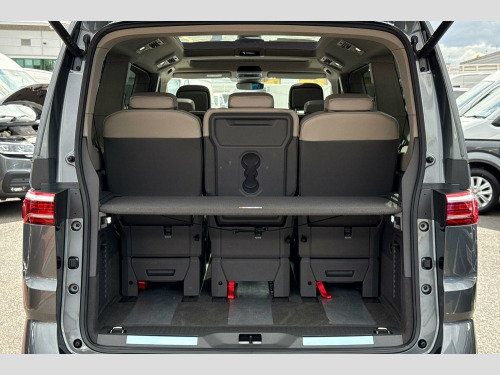 LWB Body, Indium Grey-Metallic Paint, Panoramic glass sunroof, Twin, electrice sliding side load doors, Power tailgate, IQ Matrix LED headlamps, Privacy glass-90%, Fixed side windows in 2nd row, Mudflaps front + rear, Park sensors - front and rear park with park assist, Rear view camera system, 7 Seat Conference Package, Raven Black/Sand Art Velours interior trim, Heated front seats, Navigation system "Discover Media'', Heated front seats, Art Velours interior trim-Raven Black/Sand, Keyless Advance, 4 keys, Indium Grey-Metallic Paint, Raven Black/Sand 'Art velours' Interior trim, 19" Halmstadt black alloy wheels, Tyre mobility kit, Part of the Swansway group-one of the largest and leading official VW Van Centre groups with access to 700+ used VW Commercial Vehicles, We stock one of the largest range of new and used VW Commercial Vehicles, We have a dedicated used sales team to assist with all aspects of your enquiry, We offer a 14 day exchange your vehicle policy if you're not completely satisfied, We offer a full HD personalised video walk around-just call a member of the team on 0121 260 3000, Reserve today with just a fully refundable £500 reservation, Additional interior noise reduction measures, Heated rear window with window wiper and washer system, Heated windscreen, Laminated safety glass windshield, heat and sound insulating, Rear wiper, Windshield wiper intermittent control with rain sensor, Body coloured exterior door handles, Chrome trim decorative strip mid-way on side and rear, Electric sliding rear side door on the left/right with easy open feature, Glossy black painted radiator grille with 2 illuminated chrome trims, Sliding windows in front sliding doors and fixed rear windows, Stainless steel tailgate trim, Advanced high beam control dynamic light assist for LED matrix headlamps, Automatic headlight control with welcome home lights, Dynamic headlight range control with dynamic cornering light, Front fog lights, IQ.Light LED matrix headlamps with LED separate daytime running light, LED 3rd brake lamp, LED rear combination lamps, Surround lighting in door area and tailgate with logo projection in door area, ABS, Automatic post collision braking system, Autonomous emergency braking front assist with pedestrian and cyclist monitoring, Electronic stability control (ESC) and Electromechanical brake booster, ESP, Front disc brakes, Hill hold assist, Traction control, Adaptive cruise control with C2X including front assist and city emergency braking system, Driver alert system, Dynamic road sign display, Lane keeping system Lane Assist, PAS, Semi-automated driving assistance, Break away auto dimming rear view interior mirror, Electrically adjustable, heated and folding door mirrors, High gloss black exterior mirror housing, 3x3 point rear seat belts, Driver and front passenger airbag with front passenger airbag deactivation, Electric childproof lock, First aid kit with warning triangle and safety vest, Seat belt warning for the driverÆs and all passengers seatÆs if unfastened, Side and curtain airbags for driver and front passenger, curtain airbags for outer seats in rear, centre airbag in front, Single tone horn, Tyre pressure monitoring system, Carpet mats in cab, Reinforced carpet floor covering in passenger compartment, Climatronic 3 zone air conditioning with 2nd evaporator, auxiliary heater, air conditioned headliner and additional passenger control, 1 x 12V sockets on the dash panel, 12V socket in passenger compartment, Grab handles on A pillar for access, on driver and front passenger side, Heated steering wheel, Height and longitudinal adjustment steering wheel with gear shift paddles, Illumination lockable glovebox compartment, Load compartment partition to 20kg with bag hooks and luggage net, Luggage compartment lid power latching with unlatching from inside, Multifunction leather steering wheel with tiptronic, Slidable multifunction table/centre console with 3 cup holders, Stainless steel pedals, Storage