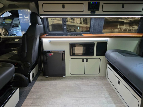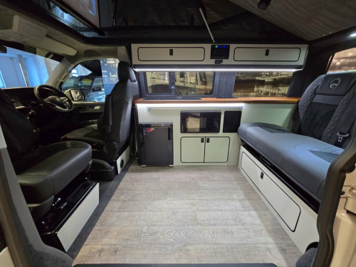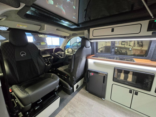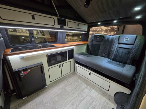 Westdubs poptop roof with scenic canvas Elevating upper bed system Privacy glass all-round Full extended furniture Solid oak worktop with hinged lid for storage Oak tambour doors to match the worktop Flush soft close doors with black flush catches Can double burner and sink unit Fold down tap 50L fridge freezer with LG compressor Dometic camper spec microwave CBE PC180 power management system Sterling split charge system Flush mount soft close sockets - 2 x 240v & 1 x double USB Cool white LED lighting throughout Onboard 130amp leisure battery Onboard gas locker for 907 gas bottle Under chassis 69L water tank High-pressure shower Storage for Thetford 335 porta potty within cabinetry Vanshade thermal blinds throughout Planar 2kw diesel heater with 7-day programmable timer 20" ALLOYS Vanstyle sidebars Vanstyle front splitter Custom painted front gloss black Grill + lower inlays Custom-painted water/electric hook-up flaps Custom-painted mirror bases 12V Socket - Additional, 12V Socket - Front, App-Connect, Composition Colour DAB Plus Radio System, Multi-Function Display Plus with Black a, Smartphone Interface