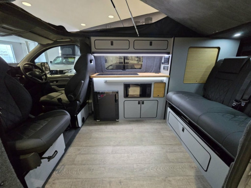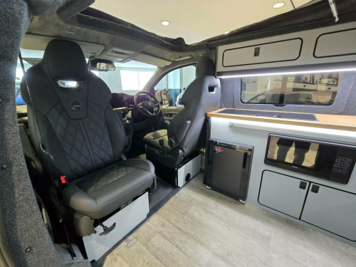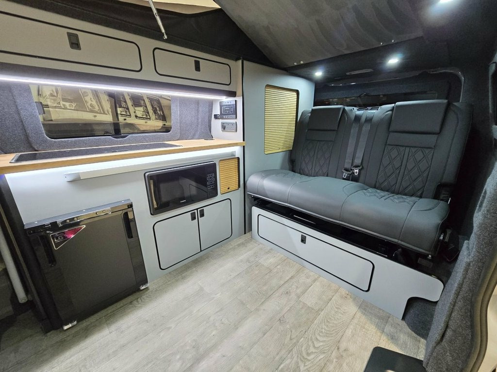 Westdubs pop top roof with scenic canvas Elevating upper bed system Privacy glass all-round Full furniture Solid oak worktop Oak tambour doors to match worktop Flush soft close doors with black flush catches Can double burner and sink unit Fold down tap 50L fridge freezer with LG compressor Dometic camper spec microwave CBE PC180 power management system Sterling split charge system 2 x 240v & 1 x double USB Wireless charger Cool white LED lighting throughout Onboard 2 x 110amp leisure batteries Onboard gas locker for 907 gas bottle Onboard 20L water tank Storage for thetford 335 porta potty within cabinetry Blackout curtains throughout Planar 2kw diesel heater with 7-day programmable timer M1 tested Rock n Roll bed 20" ALLOYS Vanstyle sidebars Vanstyle front splitter Custom painted front gloss black Grill + lower inlays Custom-painted water/electric hook-up flaps Custom-painted mirror bases Heated Rear Window, LED Rear Lights with Exclusive Light Sig