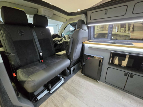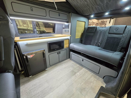 Westdubs pop top roof with scenic canvas Elevating upper bed system Privacy glass all-round Full furniture Solid oak worktop Oak tambour doors to match worktop Flush soft close doors with black flush catches Can double burner and sink unit Fold down tap 50L fridge freezer with LG compressor Dometic camper spec microwave CBE PC180 power management system Sterling split charge system 2 x 240v & 1 x double USB Wireless charger Cool white LED lighting throughout Onboard 2 x 110amp leisure batteries Onboard gas locker for 907 gas bottle Onboard 20L water tank Storage for thetford 335 porta potty within cabinetry VANSHADES Planar 2kw diesel heater with 7-day programmable timer M1 tested Sliding Rib bed 20" ALLOYS Vanstyle sidebars LV front splitter Custom painted front gloss black Grill + lower inlays Custom-painted water/electric hook-up flaps Custom-painted mirror bases Discover Media DAB Plus Navigation Syste, Indium Grey, LED Headlights with Separate LED Daytime