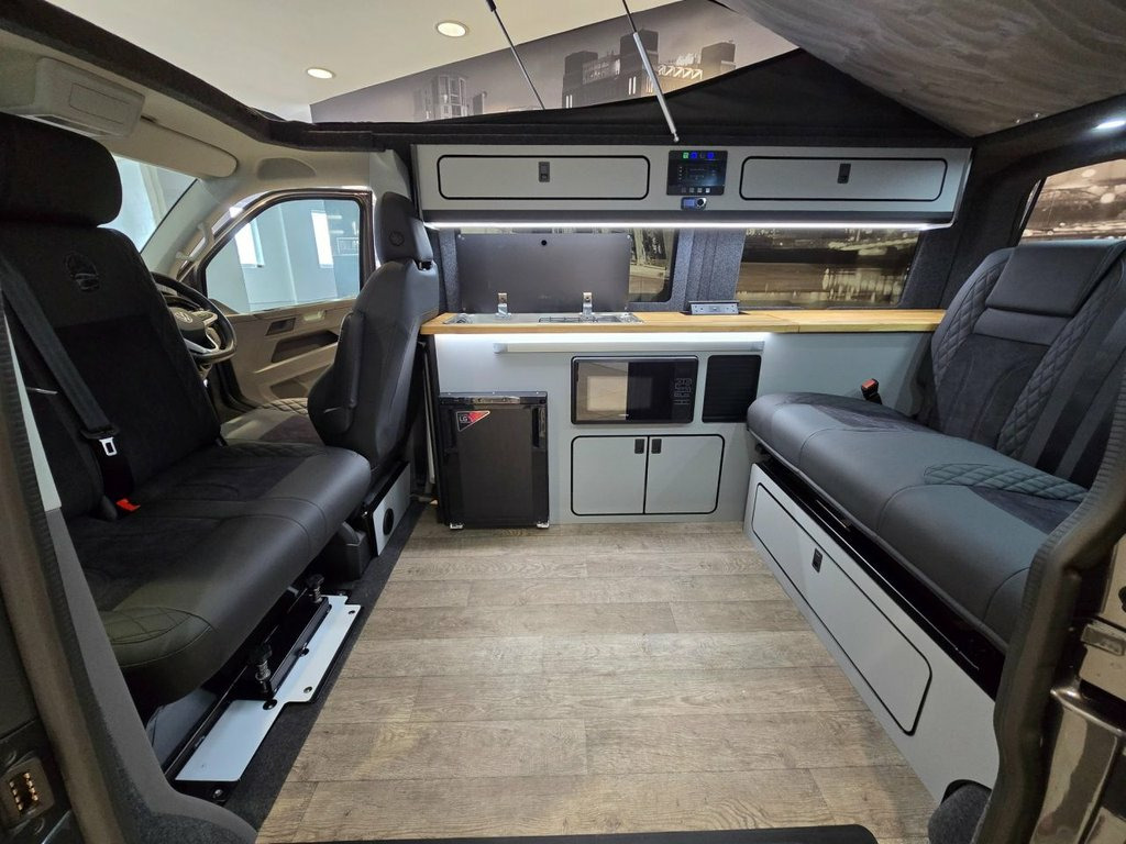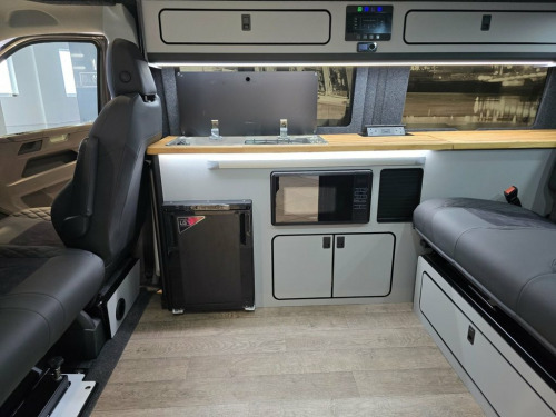 Westdubs poptop roof with scenic canvas Elevating upper bed system Privacy glass all-round Full extended furniture Solid oak worktop with hinged lid for storage Oak tambour doors to match the worktop Flush soft close doors with black flush catches Can double burner and sink unit Fold down tap 50L fridge freezer with LG compressor Dometic camper spec microwave CBE PC180 power management system Sterling split charge system Flush mount soft close sockets - 2 x 240v & 1 x double USB Cool white LED lighting throughout Onboard 130amp leisure battery Onboard gas locker for 907 gas bottle Under chassis 69L water tank High-pressure shower Storage for Thetford 335 porta potty within cabinetry Vanshade thermal blinds throughout Planar 2kw diesel heater with 7-day programmable timer 20" ALLOYS Vanstyle sidebars LV Front splitter Custom painted front gloss black Grill + lower inlays Custom-painted water/electric hook-up flaps Custom-painted mirror bases Heated Front Seats, Indium Grey, LED Headlights with Separate LED Daytime, Rear View Camera
