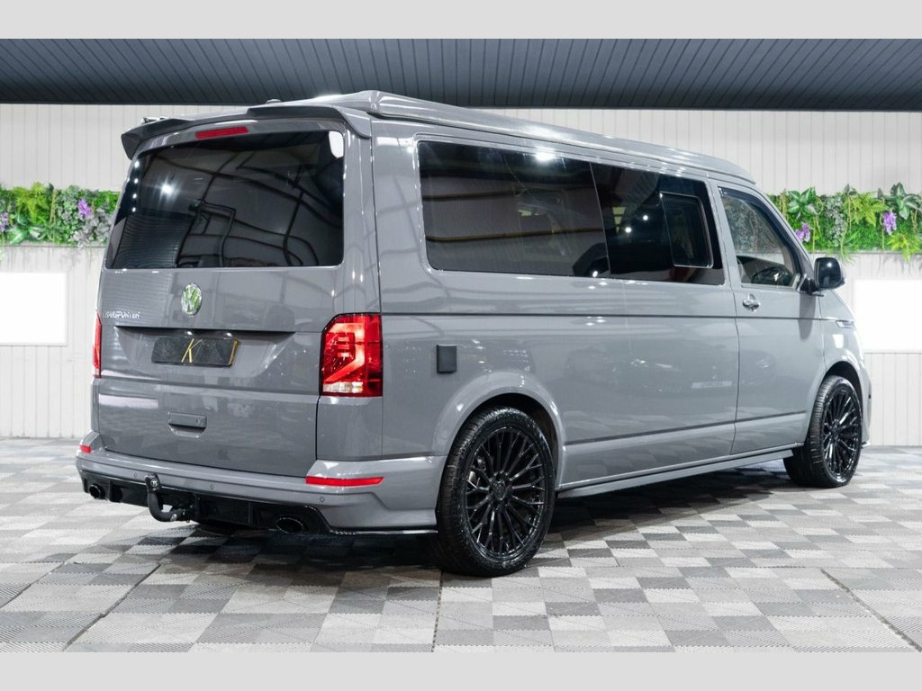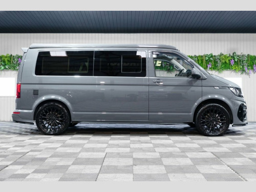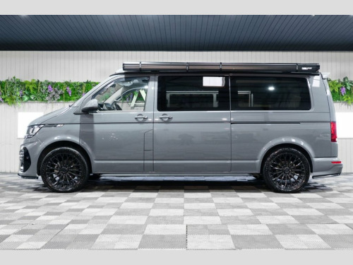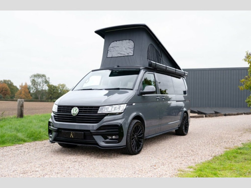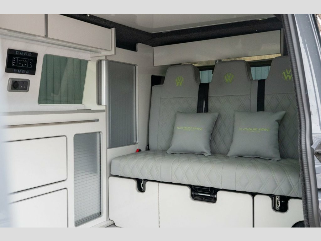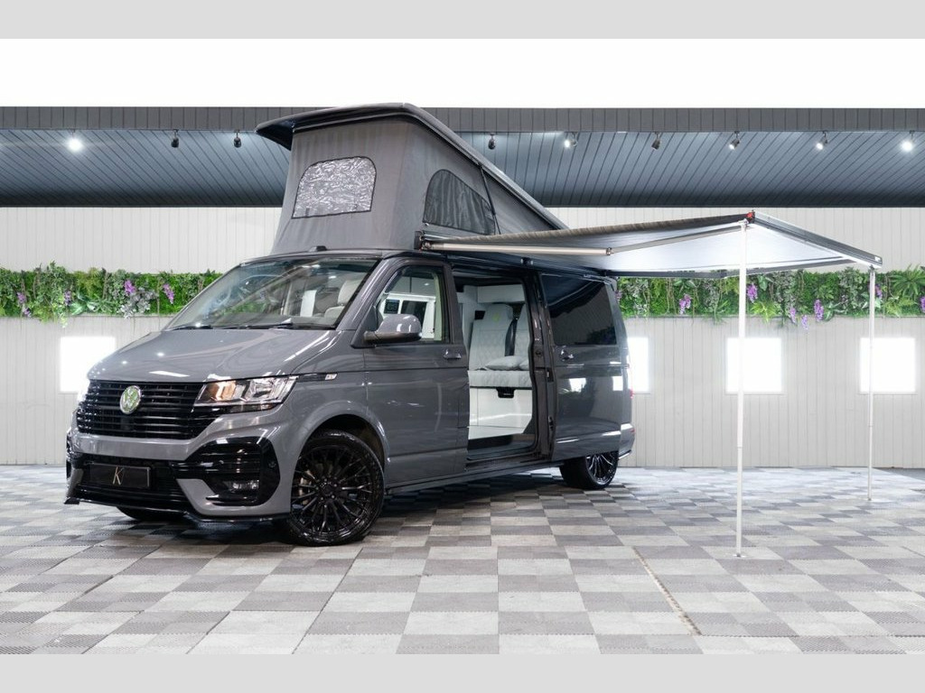 Kingsbridge are delighted to bring to the market this stunning new 73 plate Volkswagen Transporter LWB T6.1 Highline 150bhp DSG automatic Platinum Wave Luxury campervan conversion. Extras fitted include Side wind out Awning, Diesel night heater, Towbar, Solar panel mounted to roof & connected to leisure battery. This Luxury VW T6.1 Luxury campervan is another shining example and is completed with 2 x Captains seats in the front and 3 x to the rear giving the camper 5 belted seats! Finished in stunning nardo Grey with light grey vegan leather interior and contrast double diamond stitching and emblems in lime green togther with matching lime green window blinds. Bright and Light grey gloss kitchen with white marble effect worktop and splashback. Gas hob, sink. LED lighting. Wireless phone charger, folding table and Fridge. This is the more sought after long wheelbase (LWB) model giving you extra living space and storage. Sought after Tailgate style rear door. It also features the full ground effects LVR kit £5000 upgrade! Special 20" Alloy wheels in gloss black. Gloss black exterior pack. Custom painted VW emblems in lime green. The 2.0 150bhp diesel engine is the most sought after as it offers a great blend of performance and fuel economy with 340nm of torque, yet still returns between a quoted 35-45mpg and a 660 miles range on a full tank of fuel. Combined with the DSG auto gearbox you can cover 100's of miles effotlessly. PW Campers offer a proper i 12V Socket - Additional, 12V Socket - Front, 16in Alloy Wheels - Clayton, ABS - Anti-Lock Braking System, ACC - Adaptive Cruise Control, ASR - Anti Slip Regulation, Air Conditioning - Electronically Contro, Allergen Filter, Anti-Theft Alarm System with Interior Mo, App-Connect, Armrest - Drivers, Automatic Dimming Rear View Mirror, Automatic Headlight Activation with Dayt, Automatic Post-Collision Braking System, BAS - Brake Assist System, Body-Coloured Door Mirror Housings and H, Comfort Pack, Composition Colour DAB Plus Radio System, Crosswind Assist, Dash Panel with Open Stowage Compartment, Dashboard - Dimmable Illumination, Door Mirrors - Heated - Power Adjustable, Driver Alert System,