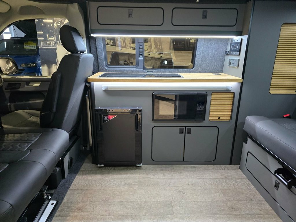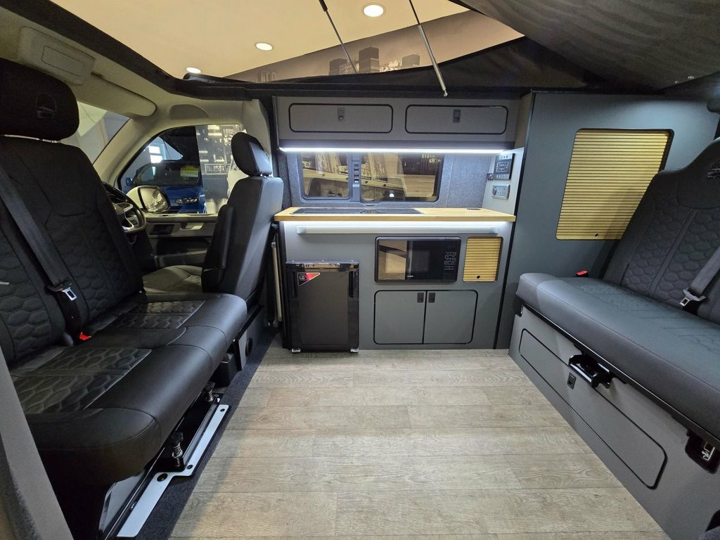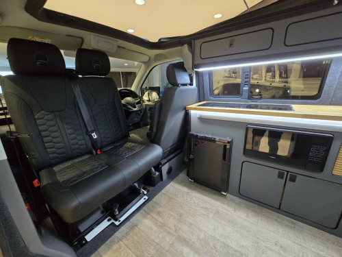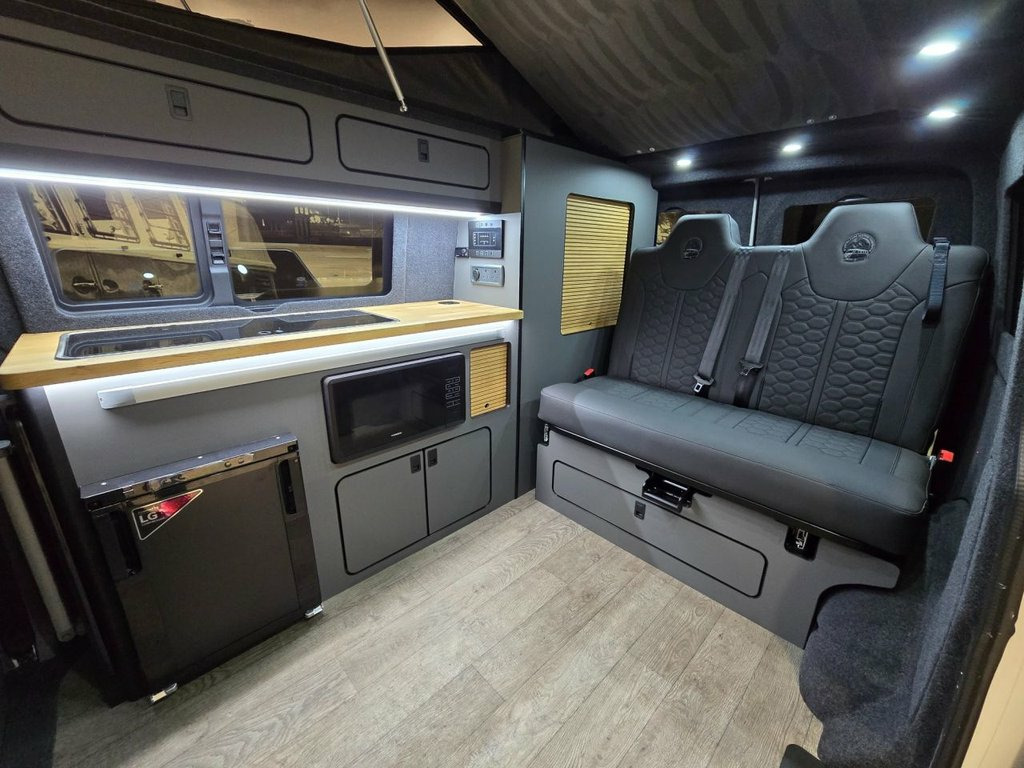 Westdubs pop top roof with scenic canvas Elevating upper bed system Privacy glass all-round Full furniture Solid oak worktop Oak tambour doors to match worktop Flush soft close doors with black flush catches Can double burner and sink unit Fold down tap 50L fridge freezer with LG compressor Dometic camper spec microwave CBE PC180 power management system Sterling split charge system 2 x 240v & 1 x double USB Wireless charger Cool white LED lighting throughout Onboard 2 x 110amp leisure batteries Onboard gas locker for 907 gas bottle Onboard 20L water tank Storage for thetford 335 porta potty within cabinetry Blackout curtains throughout Planar 2kw diesel heater with 7-day programmable timer M1 tested Rock n Roll bed 20" ALLOYS Vanstyle sidebars Vanstyle front splitter Custom painted front gloss black Grill + lower inlays Custom-painted water/electric hook-up flaps Custom-painted mirror bases Want to find out more?