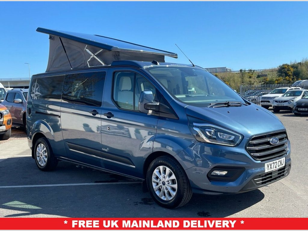 FORD WESTFALIA KELSEY 4 BERTH AUTOMATIC 2.0 170 BHP ( POP TOP ROOF WITH DOUBLE BED, LOUNGE CONVERSION IN TO BED, 4 BERTH, 4 SEATBELTS, WESSTFALIA KELSEY CONVERSION, END FIXED CASSETTE TOILET, WEBASTO NIGHT HEATER, END KITCHEN AREA, ) Comes in stand out upgrade Ford chrome blue metallic paint with matching contrast pop top roof, 16 inch alloy wheels, Signature Westfalia body decals, Westfalia body kit, LED daytime lights, Front and rear parking sensors, Reversing camera, Up and over tailgate, Power cable, Premium elevating roof with bed, Privacy glass, Electric windows, Electric adjustable wing mirrors, Automatic gearbox, LED trip computer speedometer display, Central locking, Luxury stand out Westfalia full white Arizona leather interior seats throughout, Climate control, Air conditioning, Heated front seats, 3 spoke leather steering wheel, Driver selector modes, Park assist, Upgrade Alpine touch screen stereo unit, DAB radio, Aux/Usb ports, Bluetooth, Various Apps, Swivel captain passenger and driver seats, On board bespoke Westfalia interior units, Westfalia carpeted and leather rear walls, Westfalia easy clean yacht wooden effect rear flooring, 2 burner gas hob and sink and tap, Medium on board fridge with freezer department, Water pump system with on board water tank, Full 12 and 240 volt electrical system, Wabesto diesel night heater, Rear 240V plug in ports, Rear cassette electric flush toilet, On board shower with shower tray and curtain, Various storage cupboards, Lig