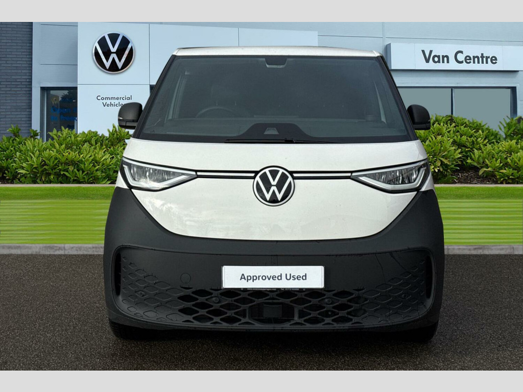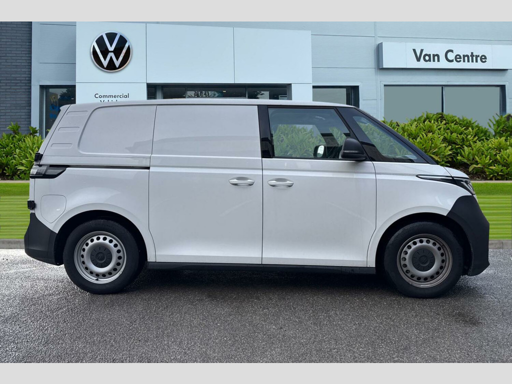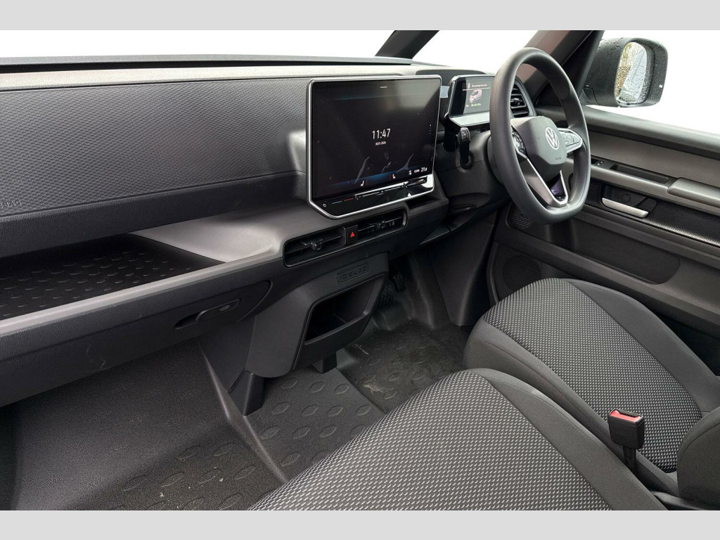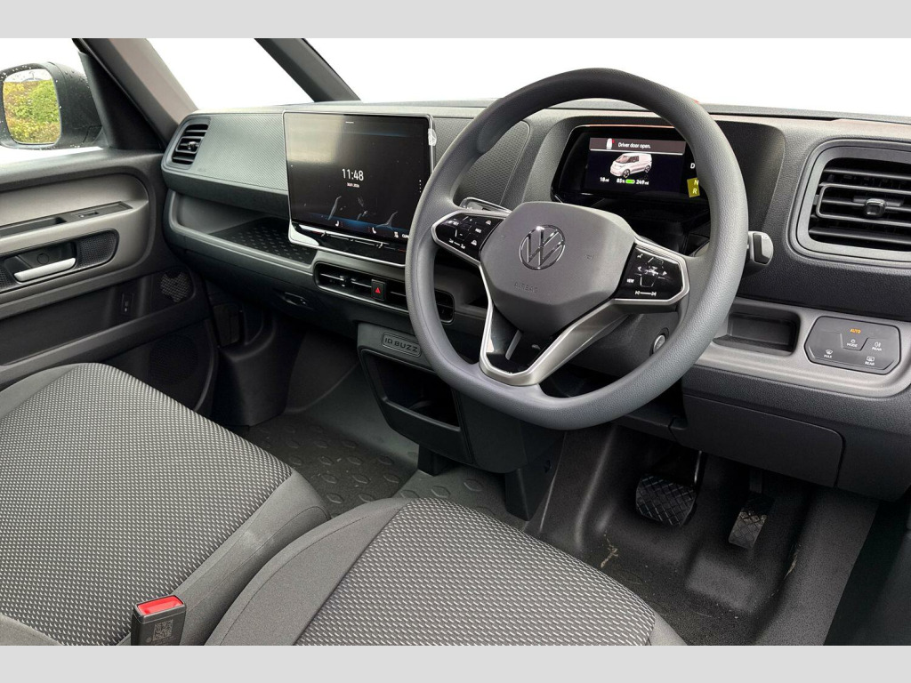Heat reflecting glass, Body coloured door handles, Unique ID Buzz badging, Sliding door on the left and right, Autonomous emergency braking front assist with monitoring and braking for vehicles, pedestrians, cyclists, Cruise control system with speed limiter and Intelligent speed assist, PAS, Driver and front passenger airbags, First aid kit with warning triangle and safety vest, Front passenger airbag deactivation, Seat belt reminder with electric contact in buckle, Tyre pressure monitoring system (TPMS), Car2X technology, Driver alert system, Front and rear park distance control, eCall emergency system, Electronic engine sound, Black decorative trim, Soul - soul dashboard, Heated front seats, Single driver seat with manual height adjustment, 2 speakers (full-range), 2 USB-C ports in dashboard and 2 USB-C charging sockets in front, App-Connect incl. App-Connect Wireless for Apple CarPlay and Android Auto, Digital radio reception (DAB+), We Connect preparation, Carpet in Black, Door trim panel and armrest in plastic, Illuminated mirrors in sun vinsors with airbag label on sun visor and B-pillar, Lockable glovebox, Multifunction steering wheel with touch control, Robust floor covering in cab, Steering wheel, dashboard and central controls in black, LED load compartment lighting, Wooden floor covering in load compartment, Anti-theft alarm system, interior monitoring in cab, back-up horn and towing protection, Keyless start incl central locking with two remote control folding keys incl interior control safelock and Illuminated door handle recesses, 11 kW AC charging power, Charging cable mode 3 type 2, 32 A (6 metres length)