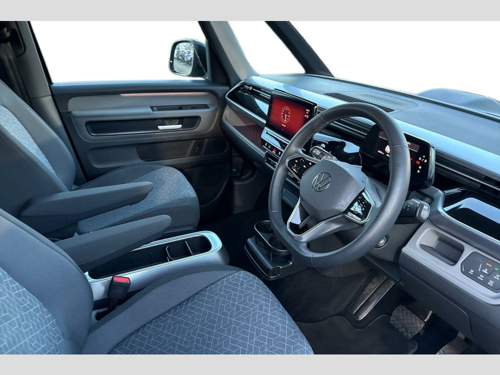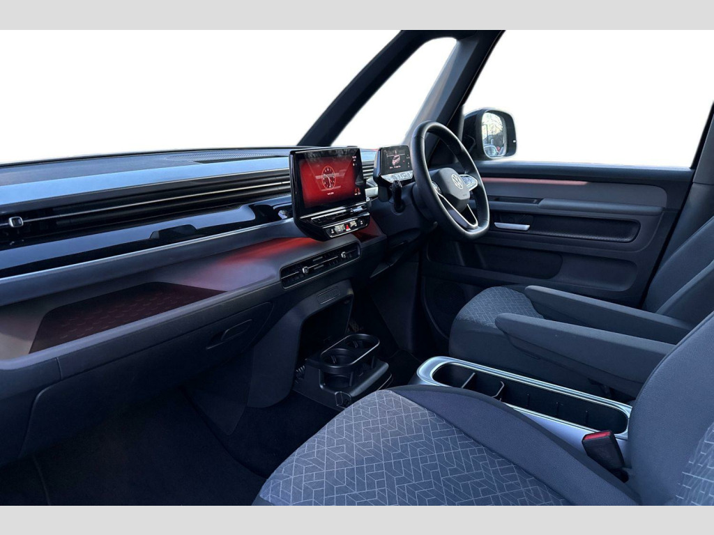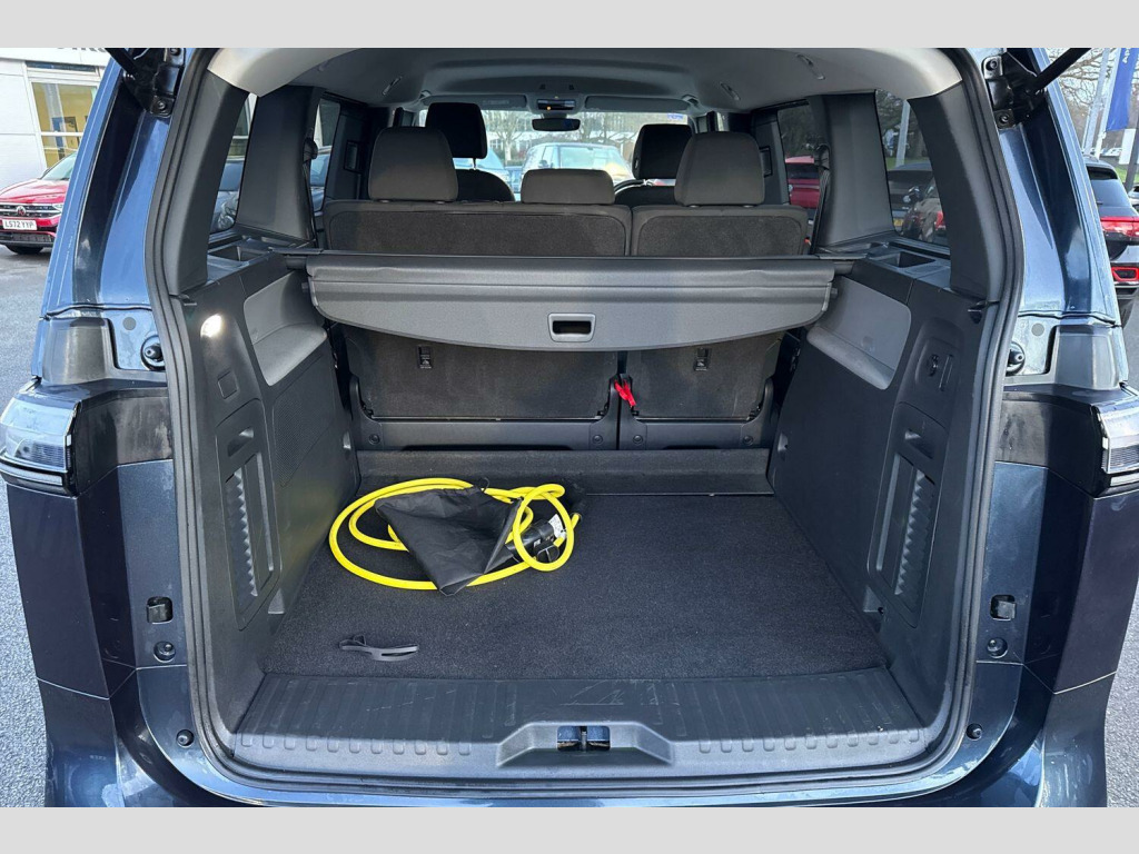 Dark tinted rear windows, Heated rear window, Heated washer nozzles, Heated windscreen, Rear window wiper and washer system with intermittent control, Windshield wiper intermittent control with rain sensor, Body coloured bumpers, Body coloured door handles, D pillar styling badges, Power latching sliding doors, Auto headlights, Daytime running lights, Integrated fog lights with cornering function, LED 3rd brake light, LED Headlights, LED rear combination lamp, Surround lighting with logo projector, ABS, Autonomous emergency braking front assist with pedestrian and cyclist monitoring, Electronic parking brake, Driver alert system, Dynamic road sign display, Electromechanical power steering, Electronic engine sound, Front and rear parking sensors, Oncoming vehicle braking when turning including swerve support, Auto dimming rear view mirror, Gloss black door mirrors, Power adjustable, heated and folding mirrors with front passenger lowering function, 3-point rear outer seat belts with ECE label, 3-point seat belts with seat belt and lap belt pretensioner in front and height adjustment, Driver and front passenger airbag with front passenger airbag deactivation, Electric child locks, First aid kit with warning triangle and safety vest, Front and rear seatbelt audible and visual warning indicator, Front curtain and side airbags with center airbag, Proactive passenger protection system, Tyre pressure monitoring system, Front carpet mats, 2-zone Climatronic with enhanced air filter and stationary air conditioning, 1 USB-C charging socket in front passenger area, 2 USB-C ports in dashboard, 2 waste bins for door pockets, 4 USB-C charging sockets in rear, Airbag label on sun visor and B-pillar, Black coloured steering wheel, integrated control panel, bezel for infotainment display and central controls, Buzz box - removable centre console with storage compartments and mounting points in vehicle floor between front seats, Lockable glovebox with illumination, Luggage compartment cover, Driver and passenger footwell lighting, LED luggage compartment lighting, Sun visors with illuminated vanity mirrors, App-Connect incl. App-Connect Wireless for Apple CarPlay and Android Auto, E-call, Voice control system, We connect preparation, Wireless charging, DAB Digital radio receiver, Car2X technology, Tailgate latching without unlatching function front inside, Tailgate with window aperture and with power latching, Digital cockpit, Black decorative trims, 3 rear seat head restraints, 3 seat bench in 2nd row, 60/40 split folding rear seat bench, Drivers and front passengers seat height adjustment, Front head restraints, 11 kW AC onboard charger, Charging cable mode 3, type 2 32 A, Airstop tyres