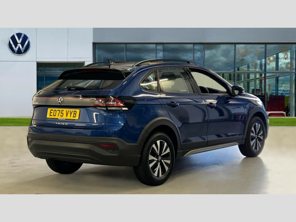 Volkswagen Taigo 1.0 TSI Life 5dr Advanced driver attention and drowsiness monitor, Dynamic road sign display, e-Call (emergency call), Power Steering, Predictive adaptive cruise control, Travel assist including emergency assist, Washer fluid level indicator, Wireless Charging including Bluetooth, Start-stop system with battery regeneration (recuperation - energy recovery during braking), WeConnect plus, Ambient lighting with logo projection, Aspherical driver's exterior mirror, Auto headlights, Body coloured bumpers, Body coloured exterior mirror housings and door handles, Electric windows, External USB type C socket and charging sockets, Heat insulating glass windscreen, LED rear combination lamp, LED third brake light, Left convex exterior mirror, Power folding adjustable/heated exterior mirrors and front passenger exterior mirror lowering function, Rear fog light on one side, reversing light on both sides, Rear side wing doors, Rear wash/wipe with intermittent wipe setting, 'Slash/ Austin' Cloth upholstery, 12V socket in centre console, 2 front reading lights, 3 rear head restraints, 3 seat bench in 2nd row, Black carpets, Child seat anchor for child seat system i-Size, 2x top tether and child seat anchor in front on front passenger side, Door and side trim panels in titan black, Driver and front passenger seat height adjustment, Front centre armrest, Handbrake lever handle in leather, Height and reach adjustable steering wheel, Leather trimmed gear knob, Leather wrapped multifunction steering wheel, Luggage compartment floor, Luggage compartment light, Lumbar support for driver's and front passengers seat, Seat covers in titanium black, Single front passenger seat, Split folding backrest with centre armrest and unsplit rear seat bench, Storage compartment under front seats, Sun visors with illuminated vanity mirrors, Chrome Package - Taigo, Drivers assistance pack - Taigo, Light and Sight pack including High beam assist - Taigo, 2 x 3-point seatbelts/outer rear seats with ECE label, 3-point seat belts in front with pretensioner and height adjustment, 3-point seatbelt for centre rear seat, Adaptive driver and front passenger airbags with passenger airbag deactivation function, Driver and front passenger safety-optimised head restraints, Electronic stability control, Extended and predictive pedestrian/ cyclist protection, Front and rear disc brakes, Front curtain and side airbags with center airbag, Hill start assist, Manual rear child locks, Single tone horn, Tyre pressure loss indicator, Anti-theft alarm system with interior monitoring, backup horn, and towing protection, Lava stone black gloss/matt decorative inserts in dash and front door panels, Low rolling resistance tyres