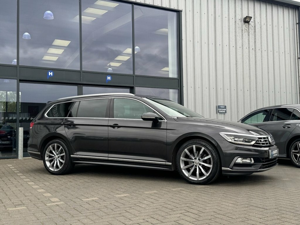 DRIVE HOME TODAY IN THIS SUPERB 2019 VOLKSWAGEN PASSAT 1.5 TSI EVO R-LINE ESTATE 5 DOOR PETROL DSG EURO 6 150 BHP FINISHED IN MANGANESS GREY AND TRIMMED WITH HEATED R-LINE PART LEATHER SPORTS SEATING. ONE FORMER KEEPER WITH A FULL SERVICE HISTORY INC 6XSERVIECS INC CAM-BELT CHANGE @ 100,937 AND JUST SERVICED @ 107,887 ON THE 28/08/2025. A WONDERFUL COMBINATION OF STYLE, PRACTICLAITY AND LUXURY . HUGE SPEC WITH OVER £4,800 OF EXTRAS INC 18"ALLOY WHEELS, TOW BAR, PRIVACY GLASS, PANORAMIC SUN-ROOF, CAR PLAY, ADAPTIVE CRUISE CONTROL, DAB, ELECTRIC TAIL GATE, HEATED FRONT & REAR SEATS, SPARE WHEEL, BLUETOOTH, CLIMATE CONTROL, FRONT & REAR SENSORS, ELECTRIC FOLDING MIRRORS, HEAD LAMP WASHERS, HEATED SCREEN Hampshire Cloth - Titan Black, Carpet Mats - Front and Rear, Heated Front Windscreen, Headlight Washers, Multifunction Colour Display, Parking Sensors - Front and Rear, Discover Navigation Touch-Screen System, Manganese Grey, Adaptive Cruise Control, Winter Pack, Panoramic Sunroof, Towbar - Manually Swivelling, Rear Tinted Glass, 12V Socket - Front Centre Console, 16in Alloy Wheels - Aragon, ABS - Anti-Lock Braking System, Air Conditioning - Manual, Airbags, Alarm with Interior Protection with Deac, Analogue Clock in Dashboard, Armrest - Front Centre with Storage Comp, Automatic Post-Collision Braking System, Body Coloured Bumpers, Body Coloured Door Handles, Body-Coloured Door Mirrors with