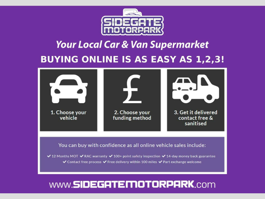 NEW ARRIVAL, THIS CAR IS CURRENTLY AWAITING FULL PHOTOGRAPHY! BUT DONT MISS OUT, RESERVE THIS CAR TODAY FOR ONLY £99!! Sidegate Motors are pleased to offer you this stunning vehicle that is in stock and available. WE DELIVER NATIONWIDE and this vehicle comes with either the balance of the manufacturers warranty or a minimum of 3 months Industry Leading Warranty which can be used NATIONWIDE and 12 months MOT included in the sale price. It has undergone 100+ safety and condition check, carried out by our expert workshop team. We have also completed a full HPI check on this vehicle, so you can buy in confidence knowing you are getting a great deal and a great car! We always welcome part exchanges and will always pay top prices for them. Please feel free to ask for a PERSONALISED VIDEO WALK AROUND which we can send straight to you! We are Sidegate Motors Ltd and Sidegate Motorpark with over 50 years experience selling quality used cars and vans, we have also won numerous awards for excellent customer satisfaction and the quality of our service. This includes the prestigious HIGHLY RATED AWARD FOR THE LAST FOUR YEARS 2021, 2022, 2023 and 2024 from Autotrader, in 2022 we were also named as a finalist in the AUTOTRADER CUSTOMER CHOICE AWARD. In 2023 we were honoured to WIN an award at the 2023 MOTOR TRADER INDEPENDENT DEALER AWARDS and be HIGHLY COMMENDED at the CAR DEALER AWARDS. This is a testament to the pride we take in the quality of our vehicles and also the outstanding customer service we provide all of our customers. We prepare all vehicles to a high standard and every vehicle includes a comprehensive warranty. This vehicle can also be bought using our flexible finance packages and no deposit options are available if required. Our finance packages are flexible for any budget and we can normally find a solution for all credit types. We would love to talk to you about this vehicle in more detail, please give us a call or email so we can answer any questions you may have!