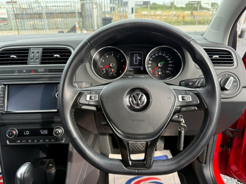 Volkswagen Polo 1.2 TSi Bluemotion DSG AutoRegistered April 20151 Owner From New.Warranted 29426 Miles With A Full Service History.Full 12 Months MOT.Full Pre Delivery Inspection In Our Own Workshop.6 Months Comprehensive No Quibble In House Warranty Included With Option To Extend To 1 Year.Finished In Unmarked Rosso Red With Chequered Grey Cloth Trim.Top Specification : Power Steering, Electric Windows, Electric Heated Folding Door Mirrors, Radar Cruise Control, Colour Screen Satellite Navigation, Bluetooth Connectivity, Colour Reverse Camera, Digital Climate Control & Ice Cold Air Conditioning, Trip Computer, Front Dash Cam Fitted, Multi Function Flat Bottom Leather Steering Wheel, Driver's Armrest, 15inch Alloy Wheels With Premium Dunlop Tyres, Remote Central Locking With Factory Alarm & Immobiliser, 2 Keys.Part Exchange & All Dealer Facilities Available.Viewing By Appointment Only.Signature Cars Of Portadown - Best Value Approved Used Cars In Northern Ireland.***Check Out Our 5Star Reviews On Line*** v socket - centre console, 15in alloy wheels - lyon, abs - anti-lock braking system, asr - anti slip regulation, air conditioning - manual, air vent surrounds - matt chrome, airbags - driver, airbags - front passenger, airbags - front side head, airbags - front thorax, alarm with interior protection, anti-theft wheel bolts, automatic post-collision braking system, aux-in socket, bluetooth audio connection, bluetooth phone connectivity, body coloured bumpers, body coloured door handles, body coloured side sills, body-coloured door mirrors with integrated indicators, car information display, carpet - black, central locking - remote with 2 remote keys, chrome trimmed front air intake grille surround, colour touch screen - 6.5in, composition media system, cup holders - front x2, dab+ - digital radio reception, dashboard - titan black, daytime running lights, differential lock - electronic, door mirrors - electrically adjustable and heated, driver alert system, dust and pollen filter, esc - electronic stability control, electric windows - front and rear, electronic engine immobiliser, front seat back storage pockets, front windscreen washers and wipers with 4 speeds including interval delay, galvanised body, gear knob - leather, gear lever gaiter surround - matt chrome, glovebox, grab handles - front x2 rear x2 with coat hooks, hba - hydraulic brake assist, handbrake grip button - matt chrome, head restraints - front whiplash optimised, headlights - halogen clear - range adjustable, heated rear windscreen, height and reach adjustable steering wheel, high gloss black decorative inserts, high level 3rd brake light, hill hold assist, isofix child seat preparation for 2 rear seats, instrument lighting - white adjustable panel illumination, interior lighting delay, keys - two remote control folding keys, leather trimmed handbrake grip, lights on warning buzzer, load sill protector, luggage compartment - hooks x2, luggage compartment - variable load floor, luggage compartment cover - removable, luggage compartment light, mdi - multi device interface, mp3 compatible cd player, matt chrome - internal door handles, multi-function display, multifunction computer, power assisted steering - speed sensitive, radiator grille - black with chrome louvres, reading lights - front x2, reading lights - rear, sd card reader, sms functionality - read - compose and send sms messages using touch screen display - android compatible smartphones only, seats - front comfort, seats - height adjustment - front, simultaneous pairing of 2 compatible mobile devices, sound output - 4x20 watt, spare wheel - 15in steel, speakers x8, split folding rear backrests 60-40, steering wheel - 3-spoke - leather trimmed, steering wheel - multifunction, storage compartment in centre console, storage compartment in front doors, storage compartment in rear doors, sun visors - vanity mirrors and illuminated x2, sunglasses holder, think blue - trainer - driver tips - journey analysis, three rear head restraints, tinted glass - heat insulating green, title and cover art display, tyre pressure loss indicator, usb socket, warning buzzer and light for front seat belts if unfastened