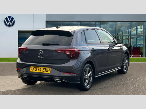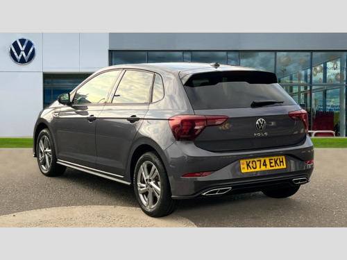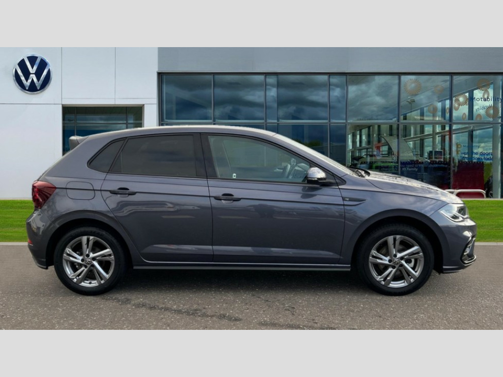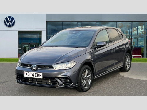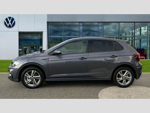 Volkswagen Polo 1.0 TSI 115 R-Line 5dr DSG Adaptive cruise control with follow-to-stop and speed limiter, Advanced driver attention and drowsiness monitor, Bluetooth mobile phone interface, Digital Cockpit Pro with 10.25" Display, Dynamic road sign display, Emergency call service, Multifunction camera, Power assisted speed sensitive steering, Preparation for We connect and We connect plus, Speedo and rev counter, electronic odometer, trip, service interval display and fuel gauge, Standard rear axle, Travel Assist - Lane keeping system and traffic jam assist, Travel assist including emergency assist, Trip computer, Warning signal and warning light for front and rear seatbelts not fastened, Washer fluid level indicator, Wireless app connect, Front wheel drive, Rear shock absorpion, Start-stop system with battery regeneration (recuperation - energy recovery during braking), DAB Digital radio, Diversity antenna for FM reception, Front and rear 6 speakers, Body colour bumpers, Body colour door handles, Electric front windows, Front scuff plates with R-Line logo, Heat insulating glass windscreen, Power folding adjustable/heated exterior mirrors and front passenger exterior mirror lowering function, Rear electric windows, Rear fog light, Rear side wing doors, Rear windscreen washer and wiper with interval delay, Third brake light, 12V power socket in centre console, 2 USB-C ports in the front, 2 USB-C charging sockets on the center console in the rear, 3 rear head restraints, 60/40 split folding rear seat and rear seat bench not split, Air care climatronic air conditoning system with active combination filter and 2-zone temperature control, Black roof lining, Carpet mats, front and rear, Chrome plated radiator grille inserts, air vent surrounds and light switch surrounds, Door and side trim panel, Driver and front passenger seat height adjustment, Driver/passenger sunvisors with illuminated vanity mirrors, Front centre armrest, Front footwell illumination, Front seat backrest storage pockets, Front sports comfort seats, Handbrake lever handle in leather, Headliner in recycled material, Isofix child seat preparation easy-fit (for two outer rear seats, and front passenger seat) compatible with I-size, Karoso artvelours cloth upholstery, Leather trimmed gear knob, LED interior light with switch off delay and dimmer, 2 reading lights front and rear, Luggage compartment cover, Luggage compartment floor, Luggage compartment lighting, Lumbar adjustment for front seats, Single front passenger seat, Stainless steel pedals, Standard pedal cluster, Three spoke leather wrapped multifunction steering wheel with shifting paddles, Light and sight pack - Polo R-Line/Black Edition, 3 point height adj front seatbelts + pretensioners, 3x3 point rear seatbelts, ABS, Driver and front passenger airbag with front passenger airbag deactivation, Drivers and front passengers safety optimised head restraints, ESC (Electronic stability control) + EDL (Electronic Differntial lock) and ASR (Traction control), Extended and predictive pedestrian/ cyclist protection, Front curtain and side airbags with center airbag, Front/rear disc brakes, Hill hold control, Manual child lock in rear doors, Single tone horn, Tyre pressure loss indicator, Alarm with interior protection, Anti-theft alarm system with interior monitoring, backup horn, and towing protection, Anti-theft wheel bolts, Electronic engine immobiliser, Chrome applications on rotary light, mirror adjustment, window regulator switches, outlet with frame in black, Dark grey anodised matt decorative inserts in dash and front door panels, 16" Coventry alloy wheels, Low rolling resistance tyres