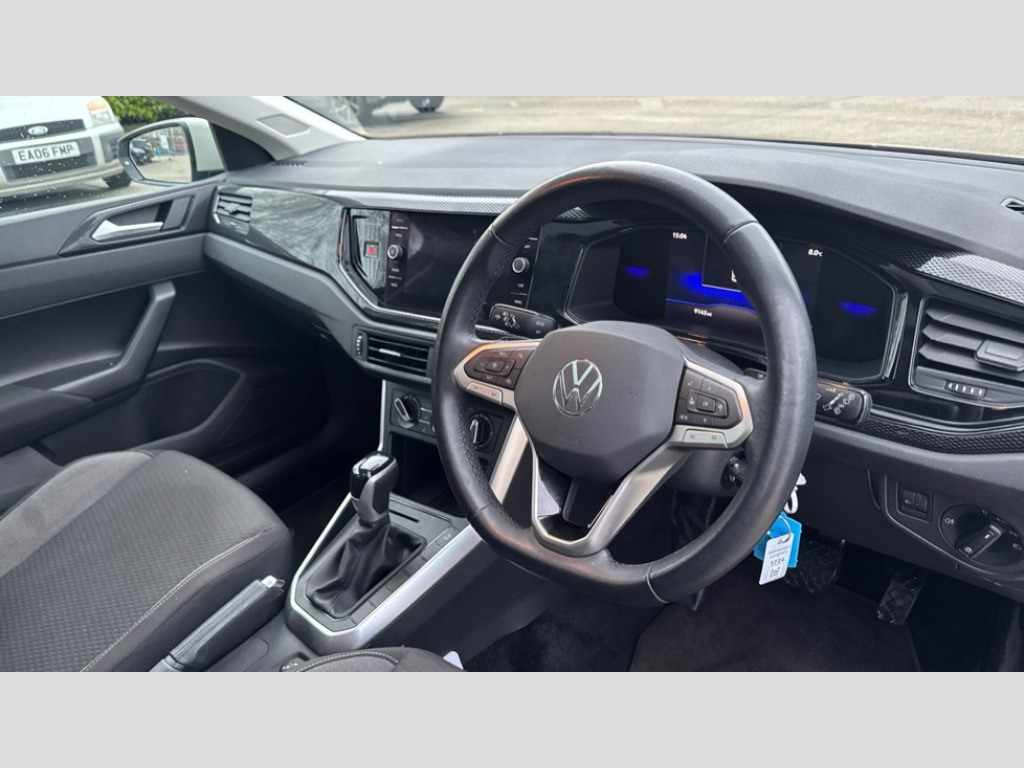 Volkswagen Polo 1.0 TSI Match 5dr DSG Advanced driver attention and drowsiness monitor, Bluetooth mobile phone interface, Dynamic road sign display, Emergency call service, Multifunction front facing camera for distance control, Park distance control, Power assisted speed sensitive steering, Predictive adaptive cruise control without follow-to-stop and speed limiter, Preparation for navigation system with media and internet package, Preparation for We connect and We connect plus, Rear view camera, Speedo and rev counter, electronic odometer, trip, service interval display and exterior temperature gauge, Standard rear axle, Travel Assist - Lane keeping system and traffic jam assist, Travel assist including emergency assist, Trip computer, Warning signal and warning light for front and rear seatbelts not fastened, Washer fluid level indicator, Wireless app connect, Front wheel drive, Rear shock absorpion, Start-stop system with battery regeneration (recuperation - energy recovery during braking), DAB Digital radio, Diversity antenna for FM reception, Front and rear 6 speakers, Automatic dimming interior rear view mirror, Automatic headlight control with LED separate daytime running lights with coming/leaving home function, Body colour bumpers with chrome inserts, Body colour door handles, Body colour door mirrors, Electric front windows, Engine badge deletion, Headlight range adjustment, Heat insulating and laminated safety glass windshield, LED Headlights, LED rear combination lamps, Power folding adjustable/heated exterior mirrors and front passenger exterior mirror lowering function, Rain sensor, Rear electric windows, Rear fog light, Rear side wing doors, Rear tinted glass from B-pillar backwards approx 65% tinted, Rear windscreen washer and wiper with interval delay, Third brake light, 12V power socket in centre console, 2 front and 2 rear reading lights with switch off delay and dimmer, 2 USB-C ports in the front, 2 USB-C charging sockets on the center console in the rear, 3 rear head restraints, 60/40 split folding rear seat and rear seat bench not split, Ceramique roof lining, Chrome plated radiator grille inserts, air vent surrounds and light switch surrounds, Door and side trim panel, Driver and front passenger seat height adjustment, Driver/passenger sunvisors with illuminated vanity mirrors, Front centre armrest, Front seat backrest storage pockets, Front standard seats, Handbrake lever handle in leather, Hartley/Thomas cloth upholstery, Headliner in recycled material, Isofix child seat preparation easy-fit (for two outer rear seats, and front passenger seat) compatible with I-size, Leather trimmed gear knob, Luggage compartment cover, Luggage compartment lighting, Removable luggage compartment floor, Single front passenger seat, Standard climatic zones, Standard pedal cluster, Three spoke leather wrapped multifunction steering wheel with shifting paddles, Light and vision pack - Polo, 3 point height adj front seatbelts + pretensioners, 3 point seat belt for centre rear seat, 3 point seatbelts, outer rear with ECE lable, ABS, Driver and front passenger airbag with front passenger airbag deactivation, Drivers and front passengers safety optimised head restraints, ESC (Electronic stability control) + EDL (Electronic Differntial lock) and ASR (Traction control), Extended and predictive pedestrian/ cyclist protection, Front assist with autonomous emergency braking (for Adaptive Cruise Control ACC up to 130 mph), Front curtain and side airbags with center airbag, Front disc brakes, Hill hold control, Manual child lock in rear doors, Rear drum brakes, Single tone horn, Tyre pressure loss indicator, Alarm with interior protection, Anti-theft alarm system with interior monitoring, backup horn, and towing protection, Anti-theft wheel bolts, Electronic engine immobiliser, Lava stone black gloss/matt decorative inserts in dash and front door panels, 16" Torsby alloy wheels, Low rolling resistance tyres