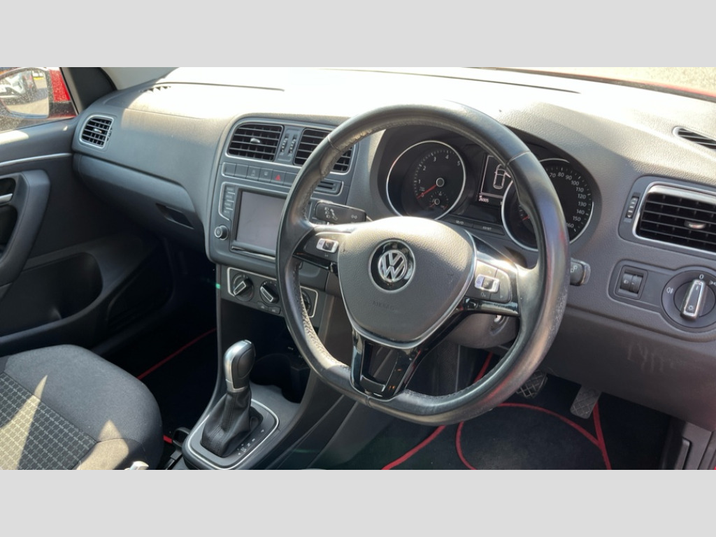 Volkswagen Polo 1.2 TSI SE 5dr DSG 'Lights On' Reminder warning buzzer, Bluetooth Telephone preparation, Driver alert system, Multi function display, Multifunction computer, PAS - speed related, Service interval indicator, Warning buzzer and light for front seatbelts unfastened, 6 speakers, Composition media system with radio, glovebox mounted CD, colour touch screen, SD card, aux-in, USB, multimedia interface, DAB Digital radio, Black grille with chrome surround, Body colour bumpers, Body colour door handles, Body colour door mirrors, Body coloured side sills, Electric front windows, Electric operated/heated door mirrors, Front wash/wipe with interval delay, Heat insulating tinted glass, Heated rear window with auto timer, Rear electric windows, Rear windscreen washer and wiper with interval delay, 12V power socket in centre console, 2 bag hooks in luggage compartment, 2 cupholders, 3 rear head restraints, 3 spoke steering wheel, 4 grab handles, 60/40 split folding rear seat, Centre console storage, Chrome interior door handles, Driver and passenger sunvisors, Driver seat height adjust, Dust/pollen filter, Front door pockets, Front passenger seat height adjust, Front seat backrest storage nets, Front/rear reading lights, Glovebox, Height/reach adjustable steering column, Illuminated vanity mirror, Interior light with delay, Isofix Preparation 2 Rear child seats, Luggage compartment cover, removable, Luggage compartment lighting, Matt chrome gear lever gaiter surround, Multifunction leather steering wheel with leather gear knob/handbrake grip, Storage compartment in front doors, Storage compartment in rear doors, Sunglasses holder, Variable boot floor, 3 point height adj front seatbelts + pretensioners, 3x3 point rear seatbelts, ABS, Automatic post collision braking, Driver/front passenger airbag, Driver/Passenger whiplash optimised head restraints, ESC - Electronic Stability Control + traction control, ESP with EDL + ASR, Hill hold control, Hydraulic Brake Assist (HBA), Tyre pressure monitoring system, Alarm with interior protection, Electronic engine immobiliser, Remote central locking with 2 remote folding keys, Air vents in Matt chrome, Matt chrome interior trim, Full size spare wheel