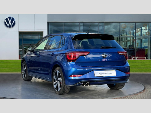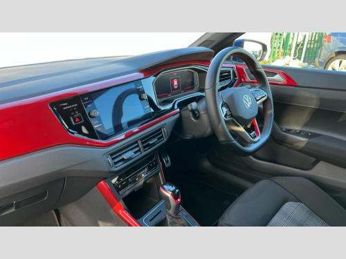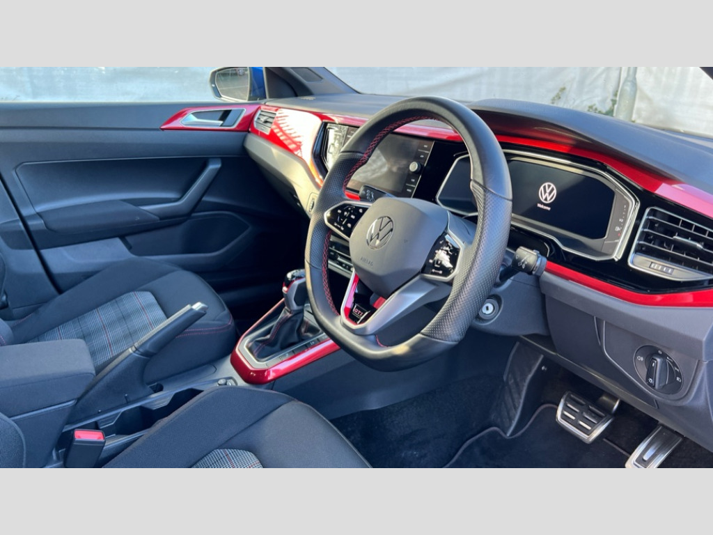 Volkswagen Polo 2.0 TSI GTI 5dr DSG Adaptive cruise control with follow-to-stop and speed limiter, Bluetooth mobile phone interface, Digital Cockpit Pro with 10.25" Display, Driver alert system, Dynamic road sign display, Eco mode, Emergency call service, Power assisted speed sensitive steering, Preparation for We connect and We connect plus, Speedo and rev counter, electronic odometer, trip, service interval display and fuel gauge, Travel Assist - Lane keeping system and traffic jam assist, Travel assist including emergency assist, Trip computer, Warning signal and warning light for front and rear seatbelts not fastened, Washer fluid level indicator, Wireless app connect, Adaptive chassis control, Front wheel drive, Heavy duty rear axle, Rear shock absorpion sports version, Sports select suspension lowered by 15mm, Start-stop system with battery regeneration (recuperation - energy recovery during braking), DAB Digital radio, Diversity antenna for FM reception, Front and rear 6 speakers, Body colour bumpers, Body colour door handles, Electric front windows, Front scuff plates in aluminium with GTI logo, Heat insulating darkened glass in side and rear windows, Heat insulating glass windscreen, Power folding adjustable/heated exterior mirrors and front passenger exterior mirror lowering function, Rear electric windows, Rear fog light, Rear side wing doors, Rear windscreen washer and wiper with interval delay, Sport bumpers with air intakes with honeycomb structure, Third brake light, Twin chrome exhaust tailpipes, 12V power socket in centre console, 2 USB-C ports in the front, 2 USB-C charging sockets on the center console in the rear, 3 rear head restraints, 60/40 split folding rear seat and rear seat bench not split, Air care climatronic air conditoning system with active combination filter and 2-zone temperature control, Black roof lining, Chrome plated radiator grille inserts, air vent surrounds and light switch surrounds, Door and side trim panel, Driver and front passenger seat height adjustment, Driver/passenger sunvisors with illuminated vanity mirrors, Front + rear carpet mats in recycled material, Front centre armrest, Front footwell illumination, Front seat backrest storage pockets, GTI sports gearshift knob in aluminium leather, Handbrake lever handle in leather, Headliner in recycled material, Isofix child seat preparation easy-fit (for two outer rear seats, and front passenger seat) compatible with I-size, LED interior light with switch off delay and dimmer, 2 reading lights front and rear, Luggage compartment cover, Luggage compartment floor, Luggage compartment lighting, Single front passenger seat, Stainless steel pedals, Standard pedal cluster, Three spoke leather wrapped multifunction sports steering wheel with shifting paddles, IQ LED matrix headlights pack - Polo, Light and sight pack - Polo GTI, Sports suspension pack - Polo, 3 point height adj front seatbelts + pretensioners, 3x3 point rear seatbelts, ABS, Driver and front passenger airbag with front passenger airbag deactivation, Drivers and front passengers safety optimised head restraints, ESC (Electronic stability control) + EDL (Electronic Differntial lock) and ASR (Traction control), Extended and predictive pedestrian/ cyclist protection, Front and rear disc brakes with red brake calipers, Front curtain and side airbags with center airbag, Hill hold control, Manual child lock in rear doors, Two tone horn, Tyre pressure loss indicator, Alarm with interior protection, Anti-theft alarm system with interior monitoring, backup horn, and towing protection, Anti-theft wheel bolts, Electronic engine immobiliser, Chrome applications on rotary light, mirror adjustment, window regulator switches, outlet with frame in black, Low rolling resistance tyres